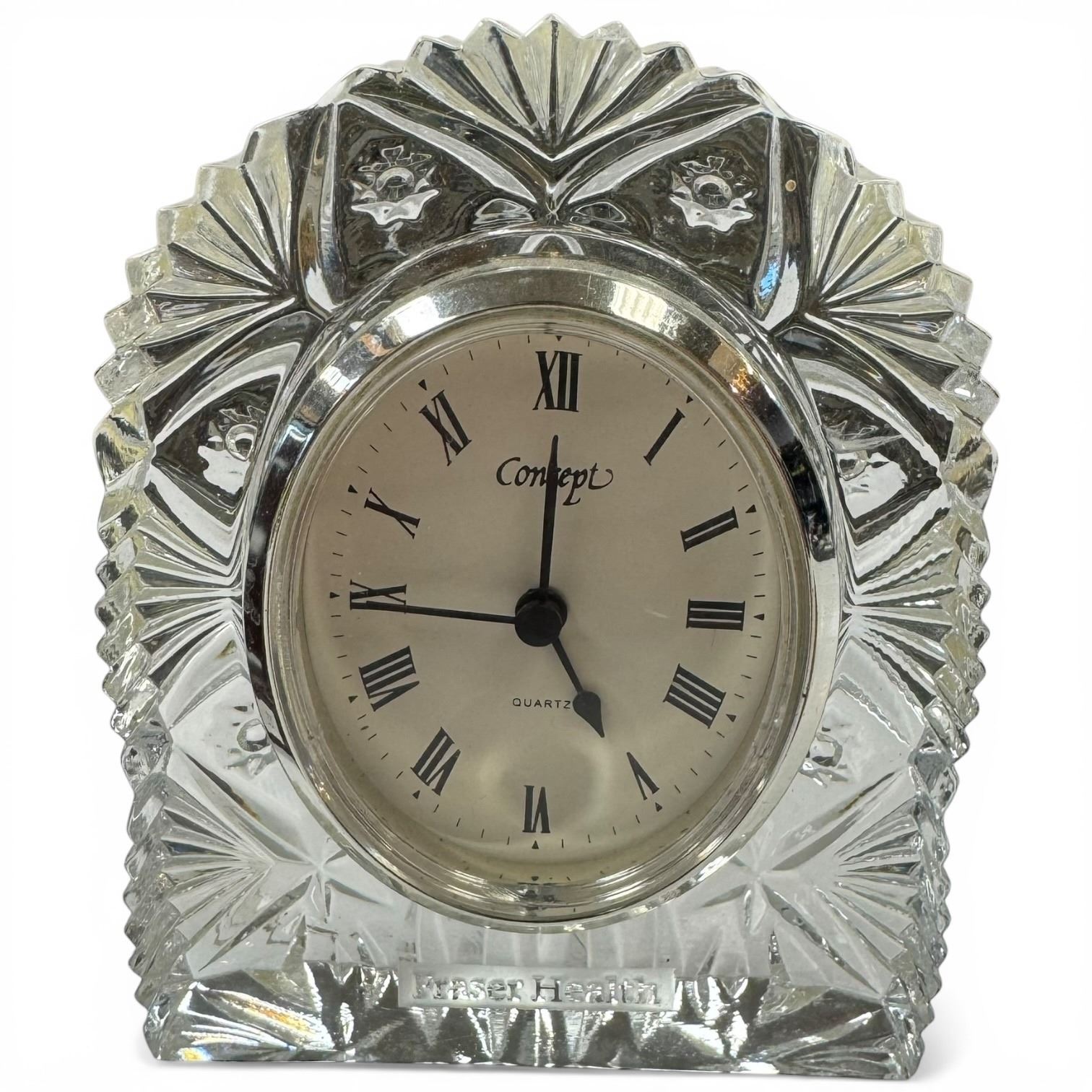 Group of 3 Clocks - 5" Concept Crystal Clock with Fraser Health Logo, Wallace 5" Mantle Clock & Avia Resin Mini Hedgehog Clock
