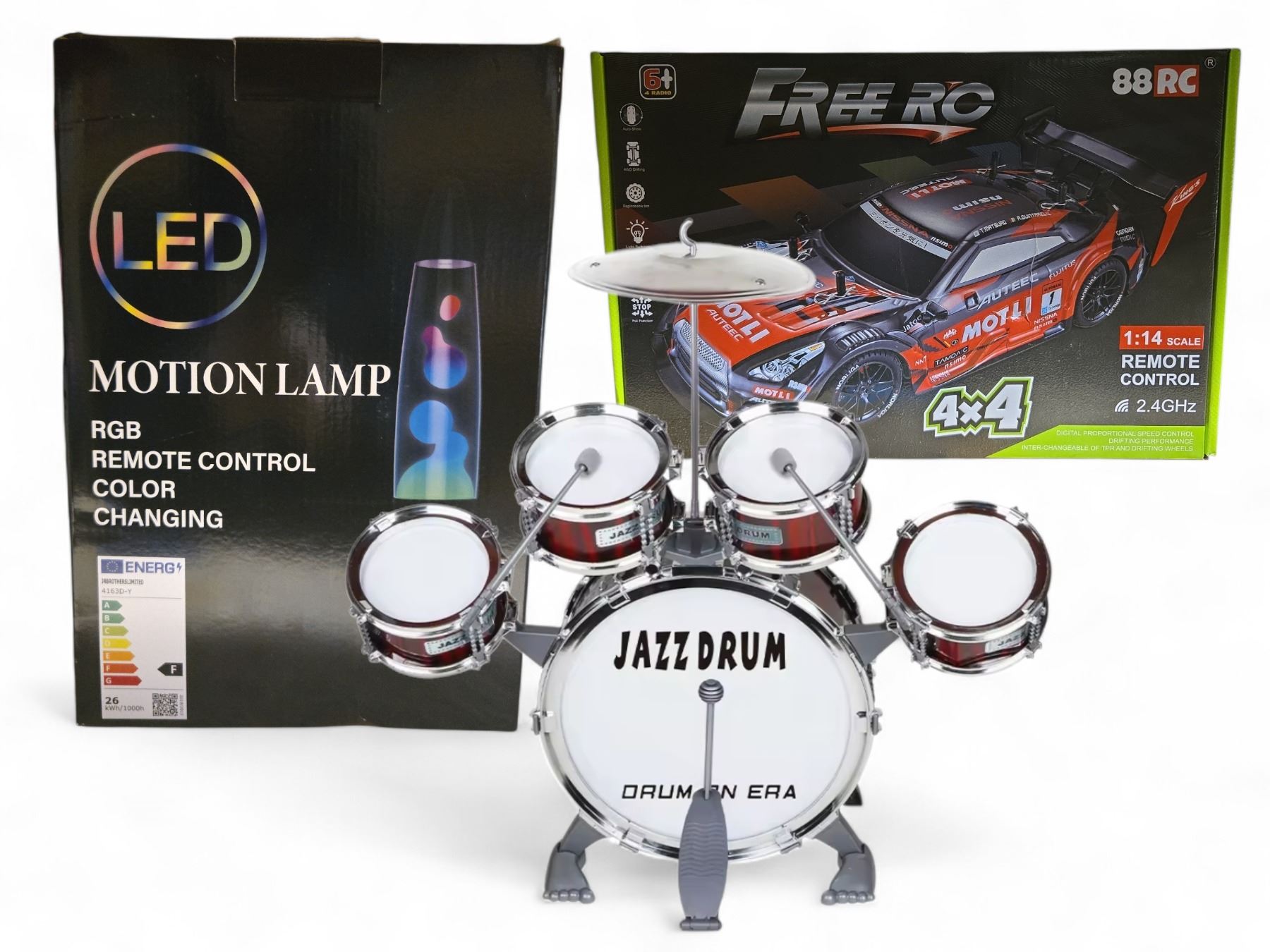 Group of 3 New 4x4 RC Car Free RC, LED Motion Lamp, Jazz Drum (Drum Box Has Damage)