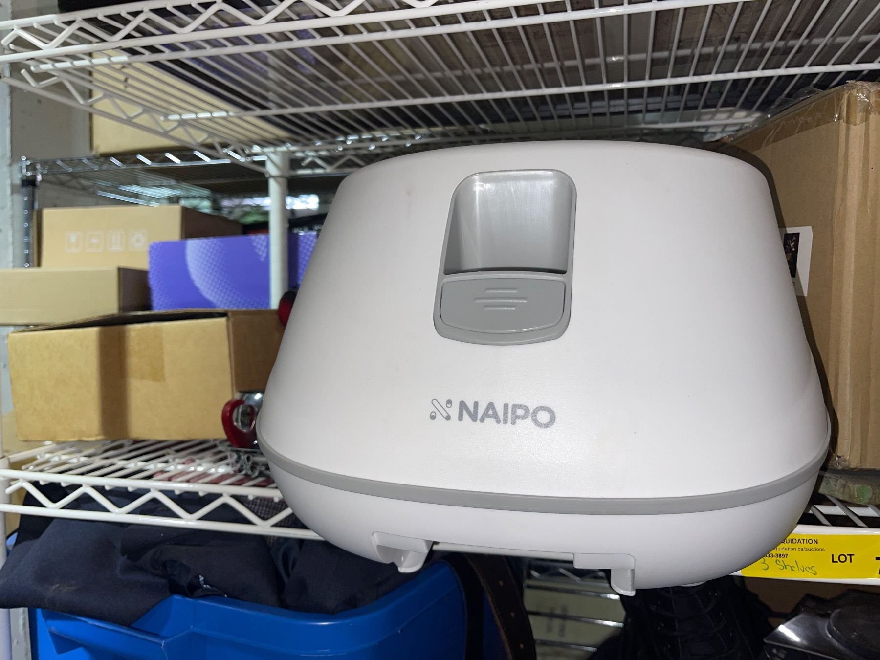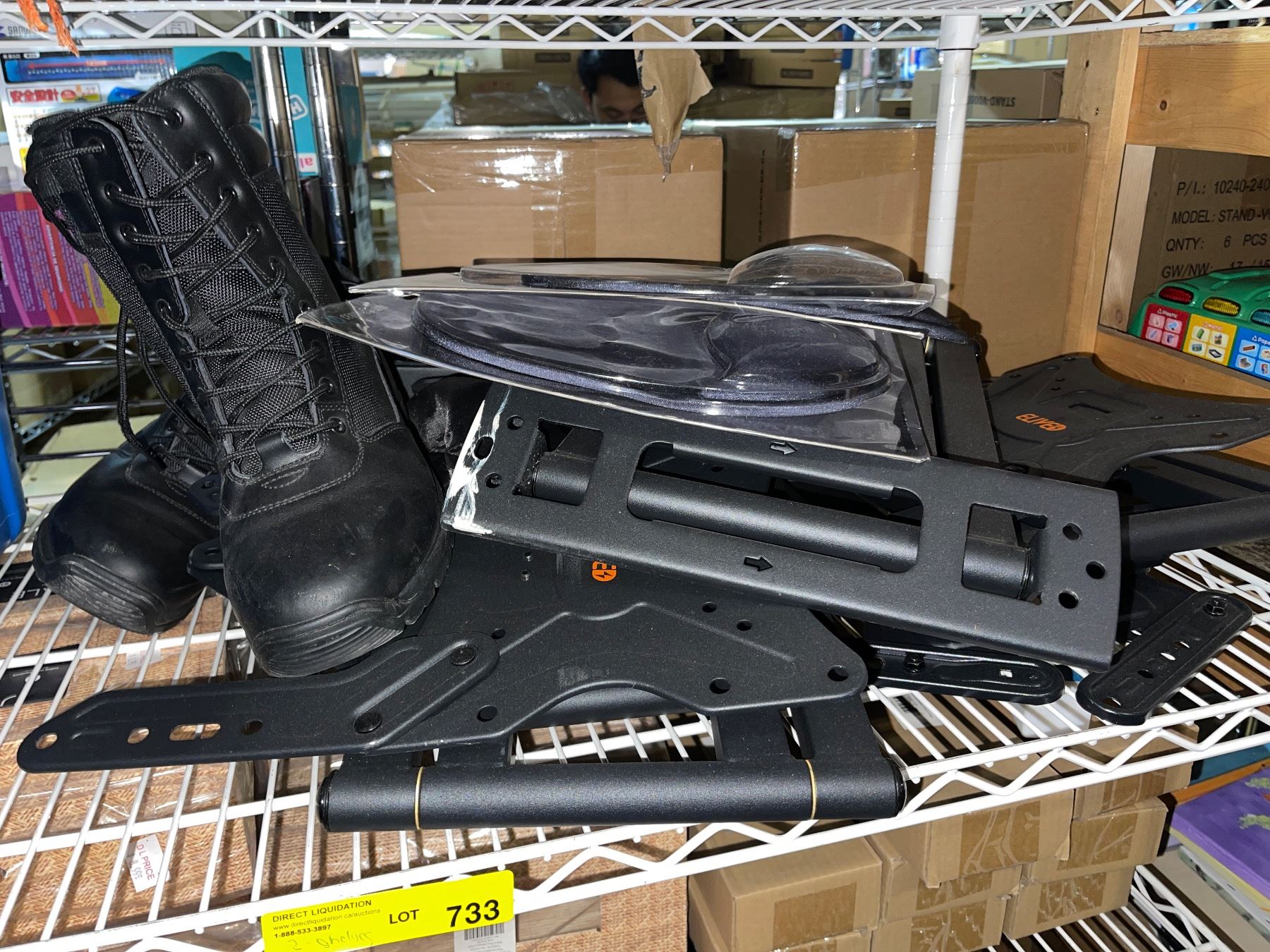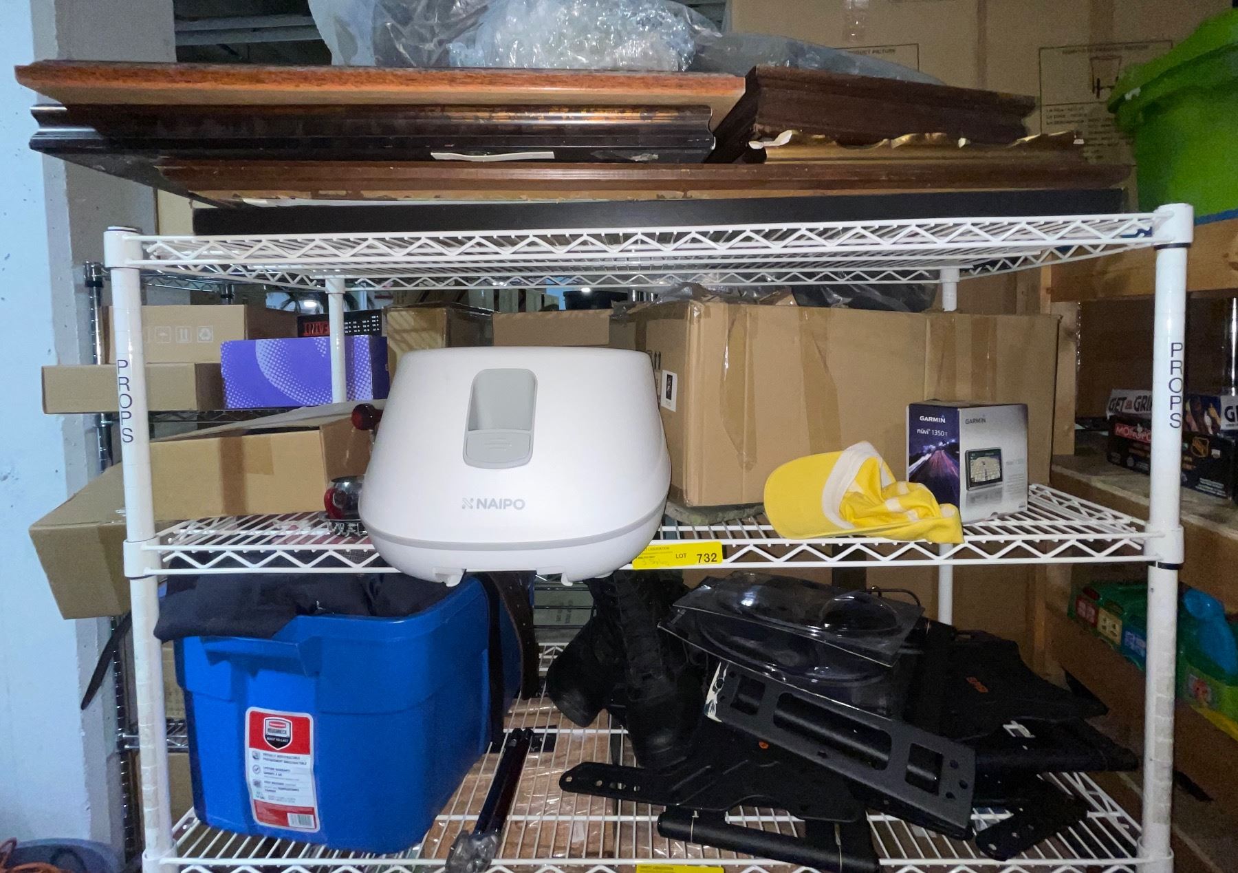 Group of 3 Shelves of Assorted Items - Includes Naipo Foot spa, Garmin GPS Navigator, Painting, Clothes, Mounts, etc