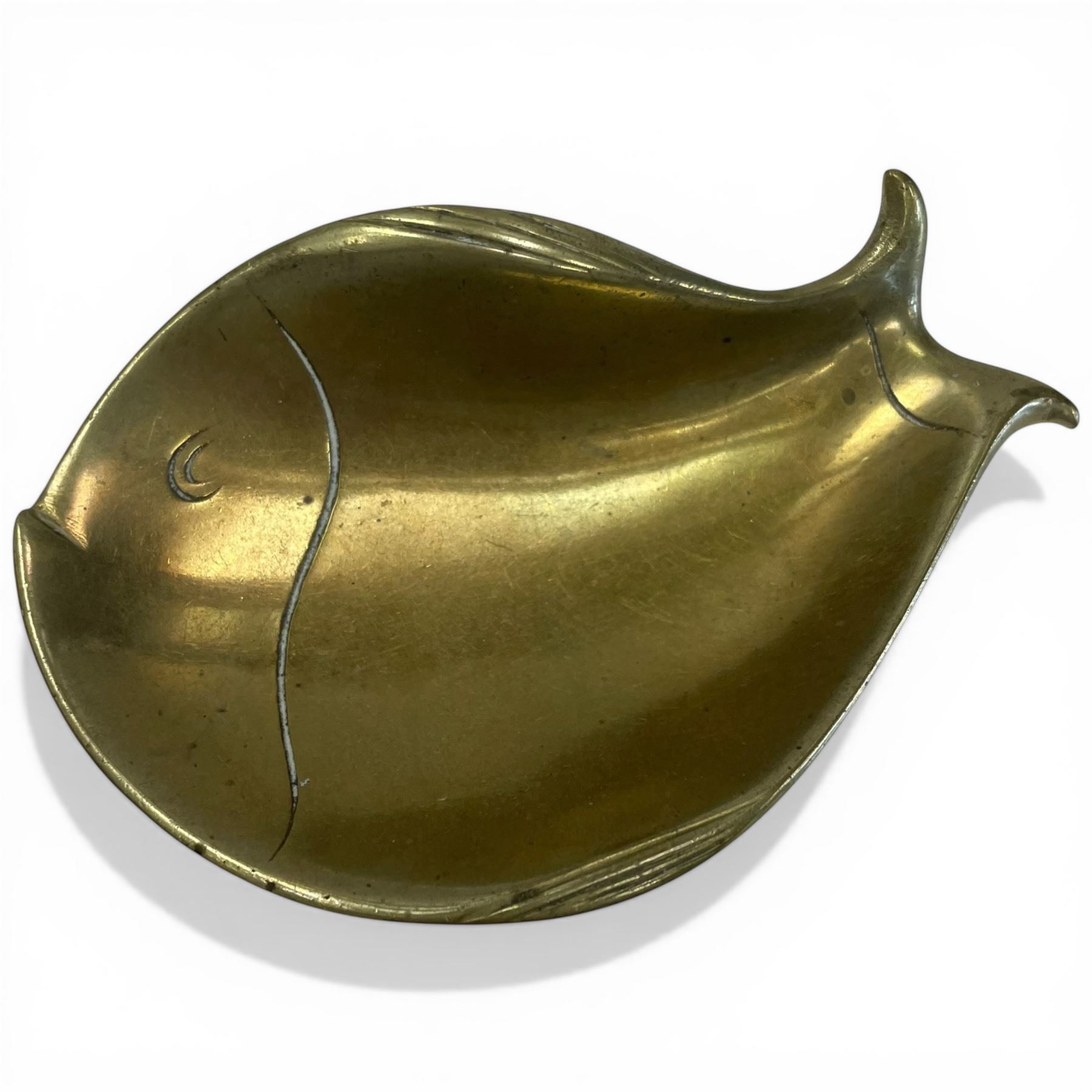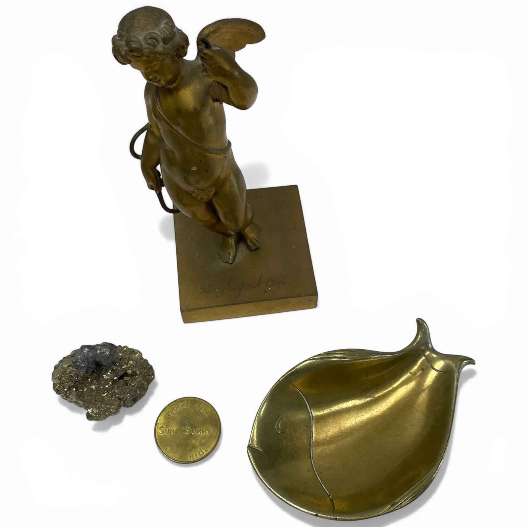 Group of 4 Brass & Pyrite Collectibles (6" Brass Cupid Dated 1866, 4" Brass Whale Coin Dish, Palm Springs Token, 1.5" Pewter Bear on Pyrite)