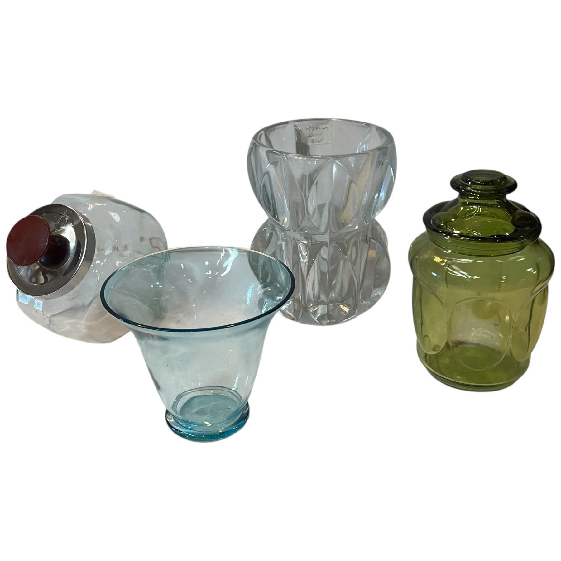 Group of 4 Glass Vases & Jars * Glass vase, blue glass vase, vintage green candy jar and clear candy jar