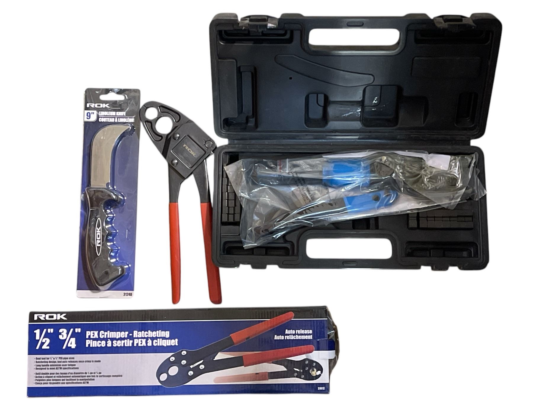 Group of 4 NEW ROK tools - includes crimping tool hydraulic / pex crimper ratcheting / linoleum knife 9" etc