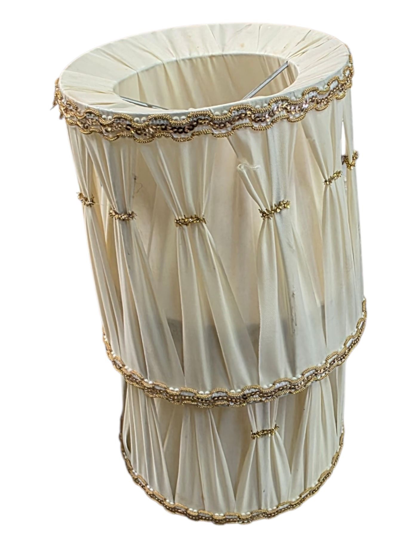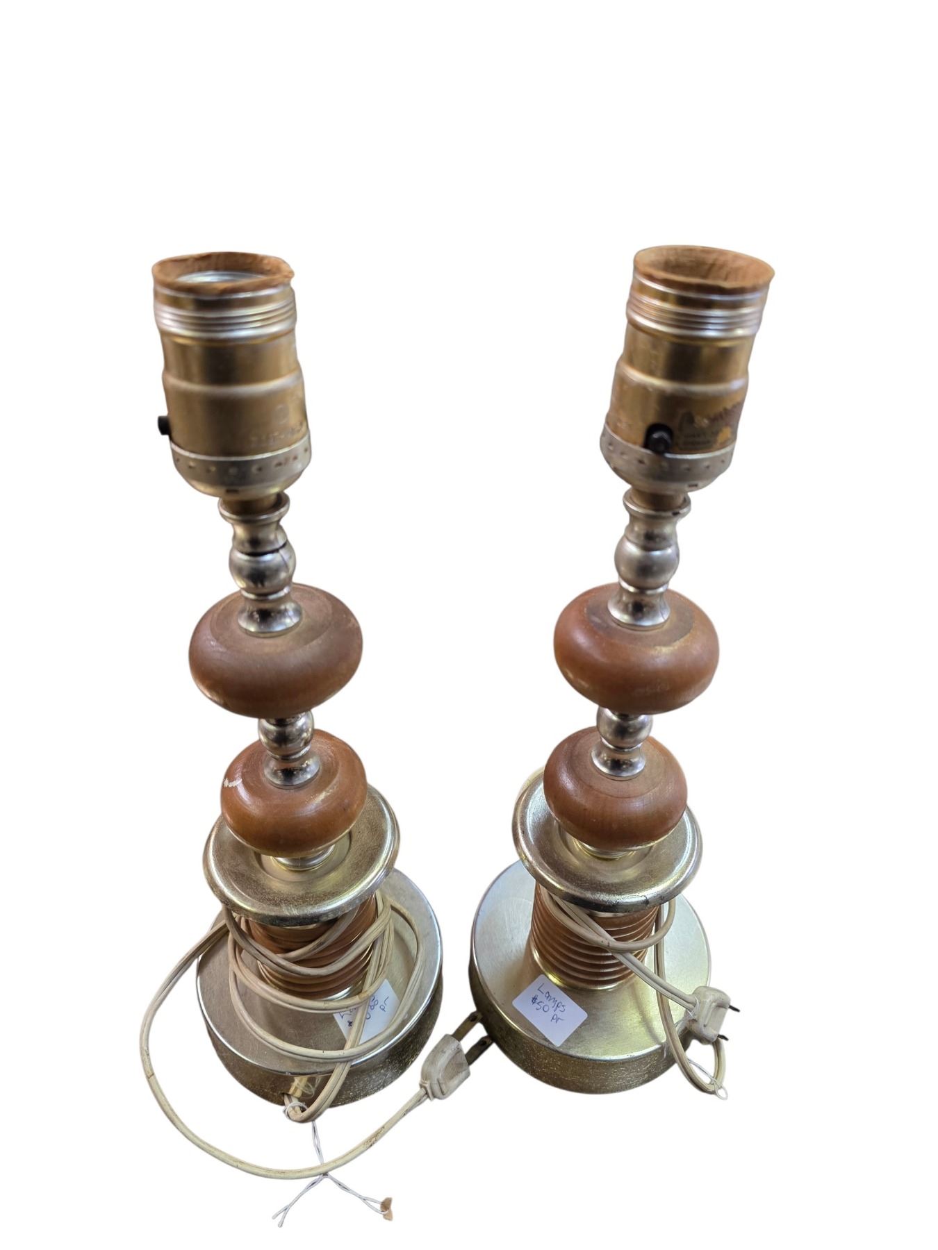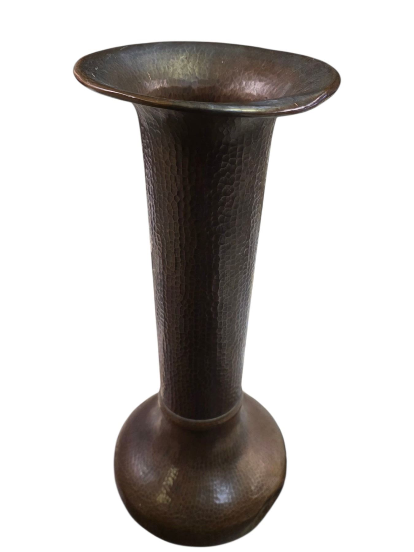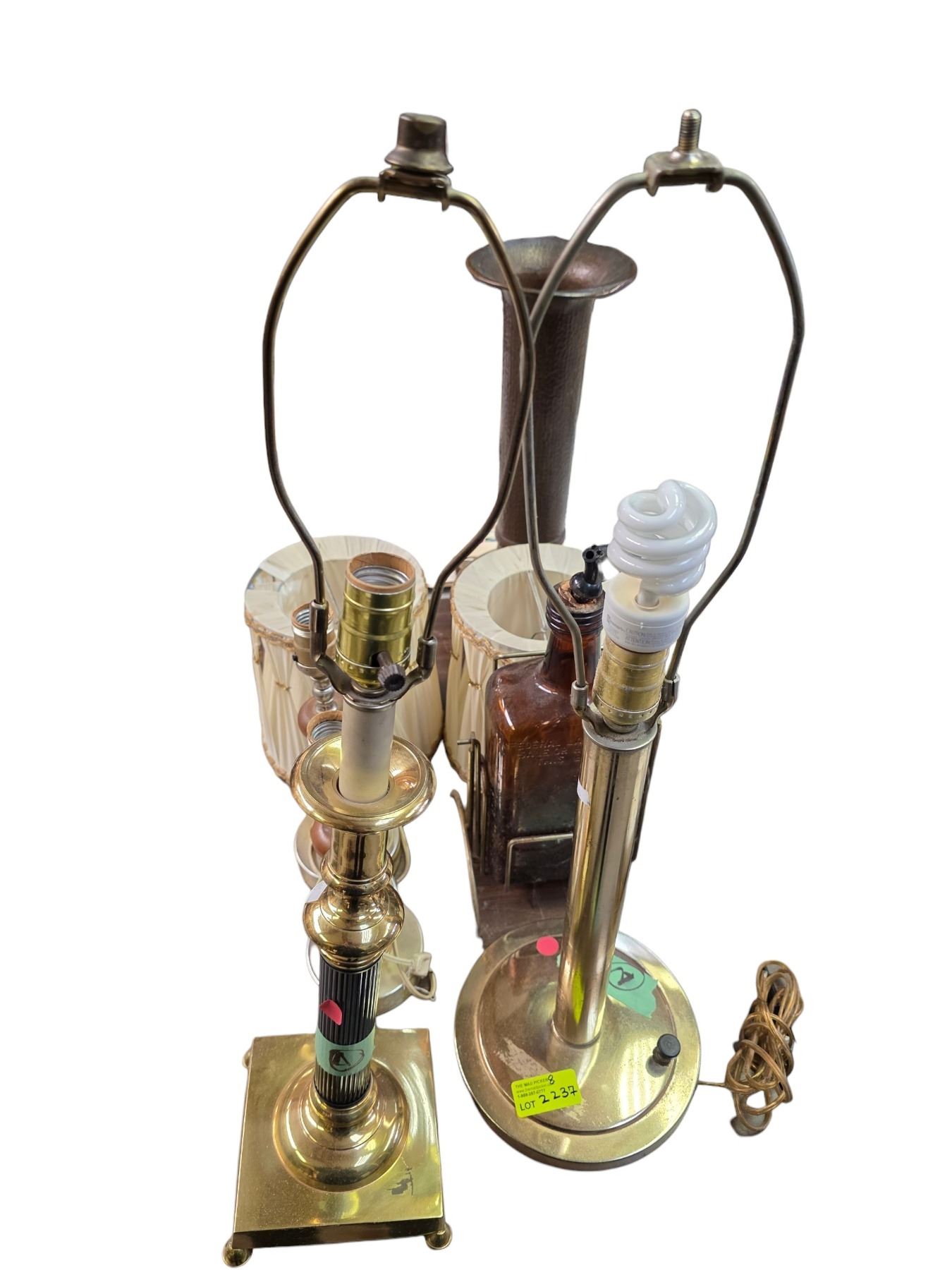 Group of 4 Vintage Lamps, 2 Lamp Shades, Brown Glass Liquor Bottle on Stand and a 18" Tall Hammered Metal vase