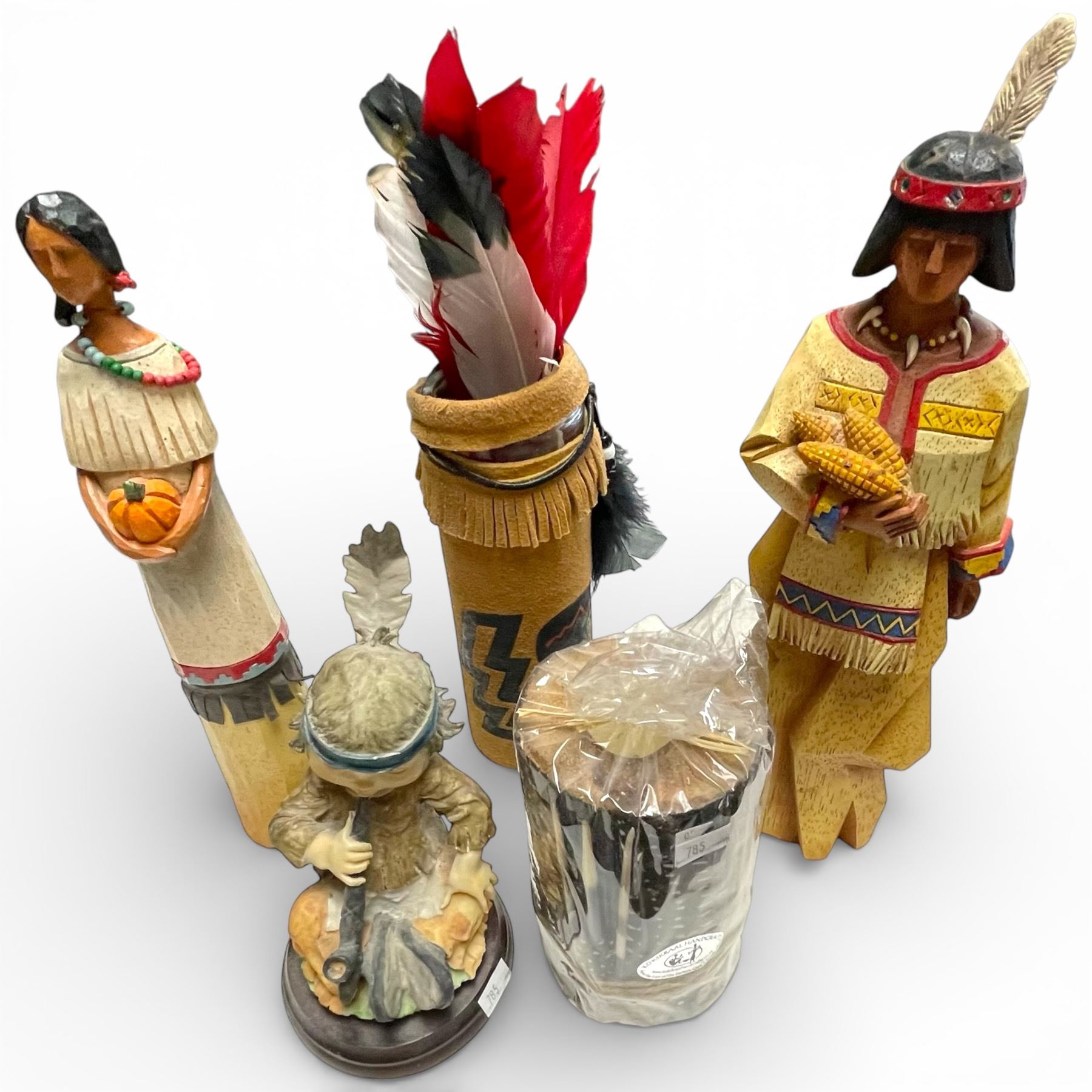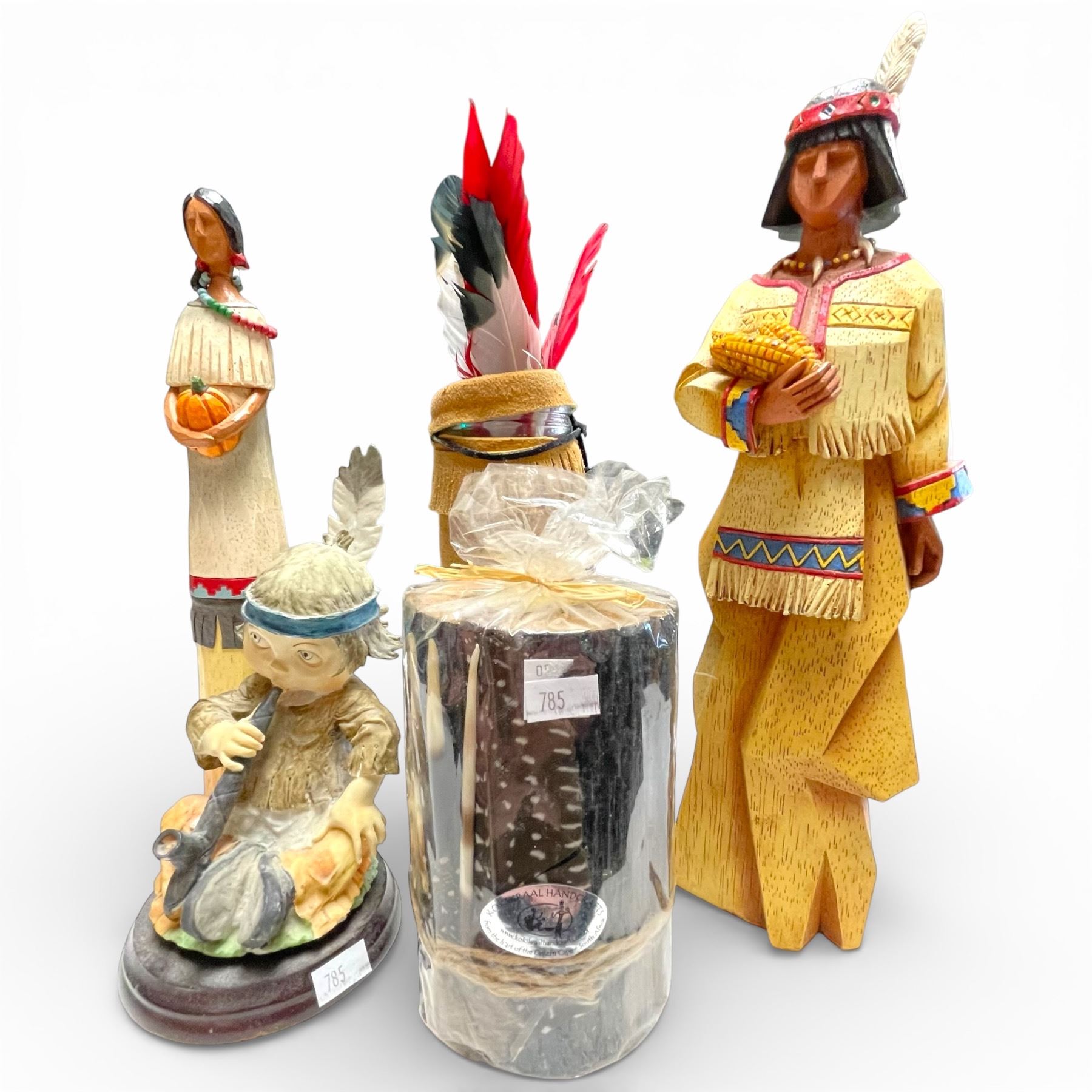 Group of 5 Collectible Items * 12" Wood Thanksgiving Statues, Wood and Quill Pillar Candle, Leather Covered Tumbler & Resin Figurine
