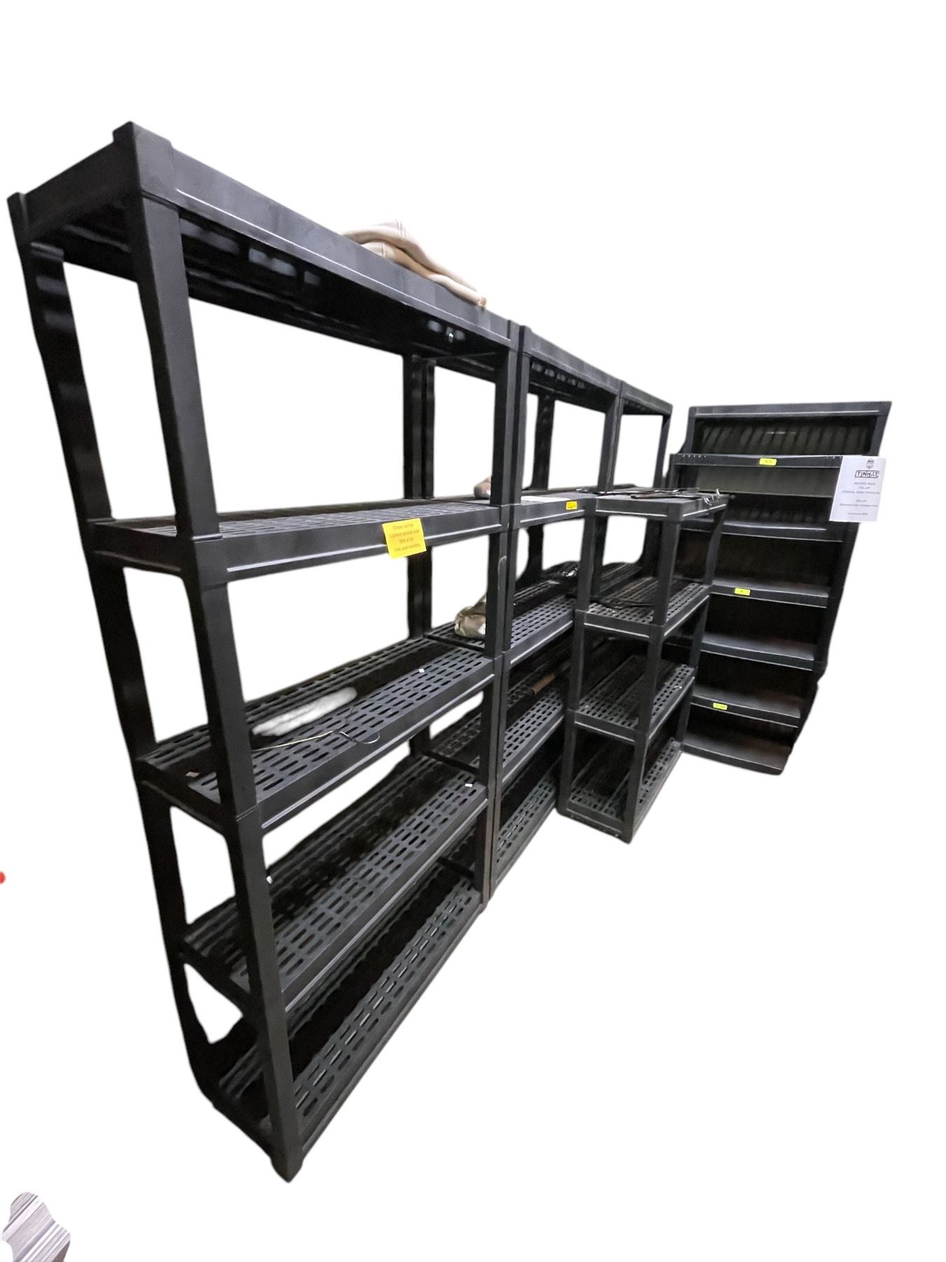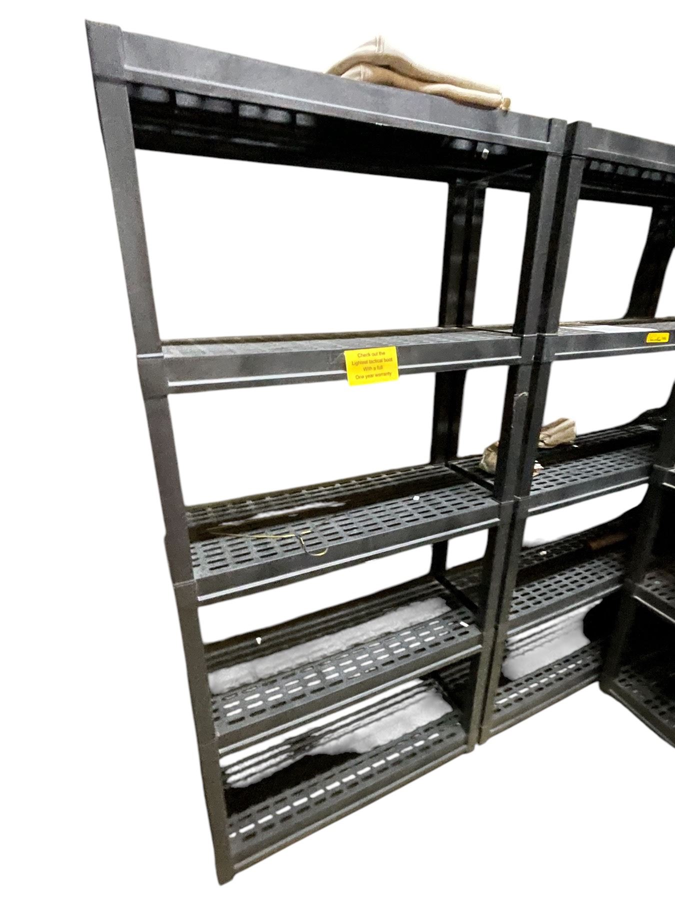 Group of 5 heavy duty 5-6 tier plastic shelving units (approx 36in x 14in x 75inin H)