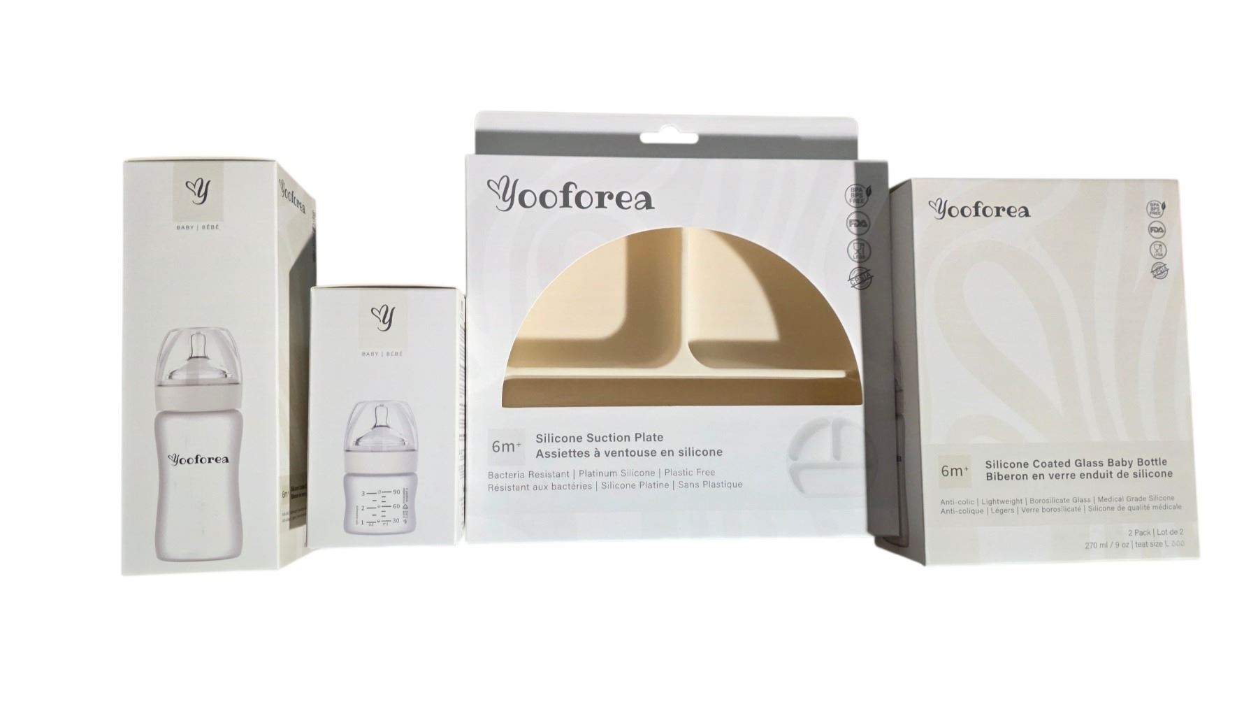 Group of 50 Pcs - Yooforea Silicone Baby Plates, Glass Bottles (various size), and More