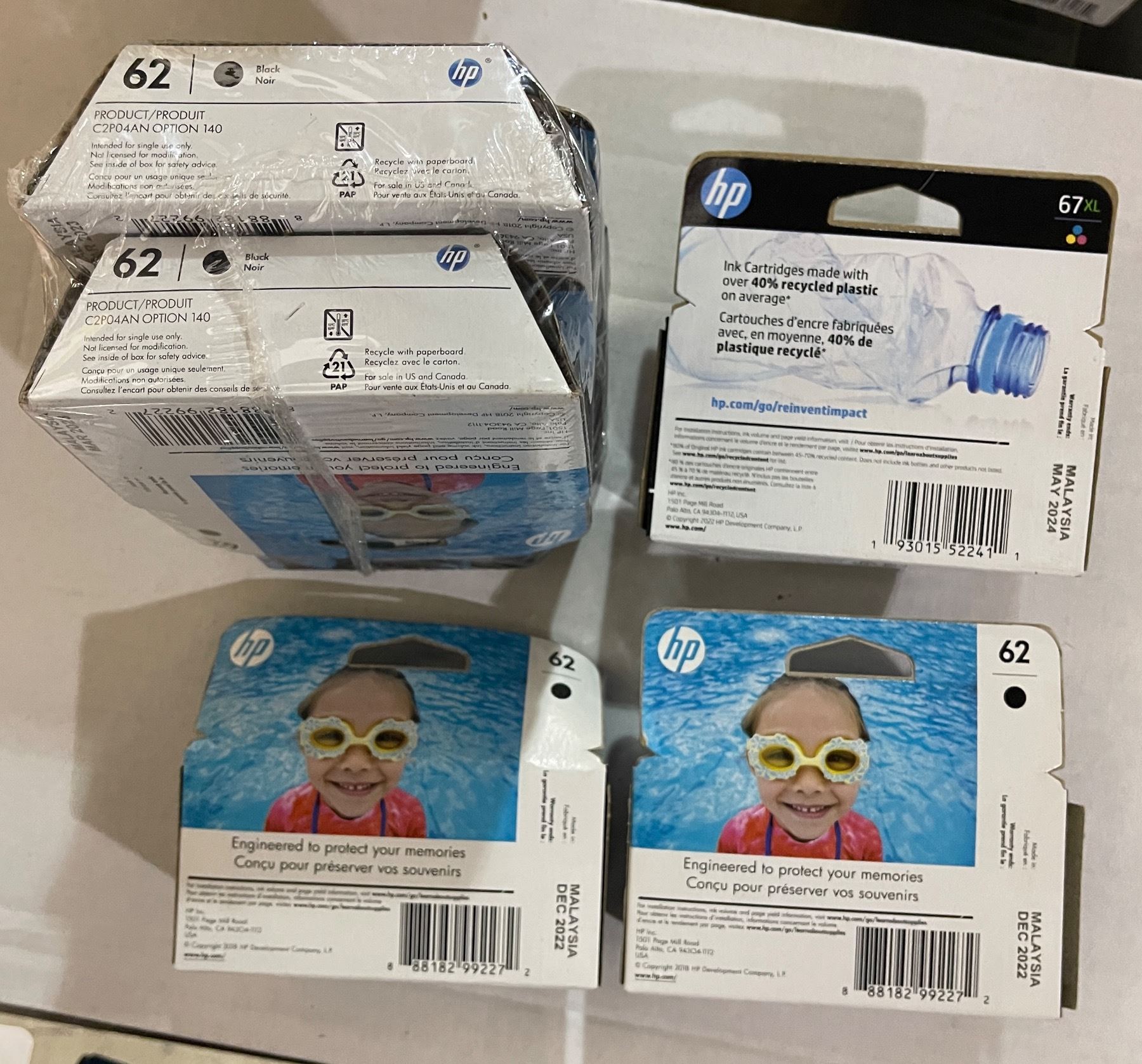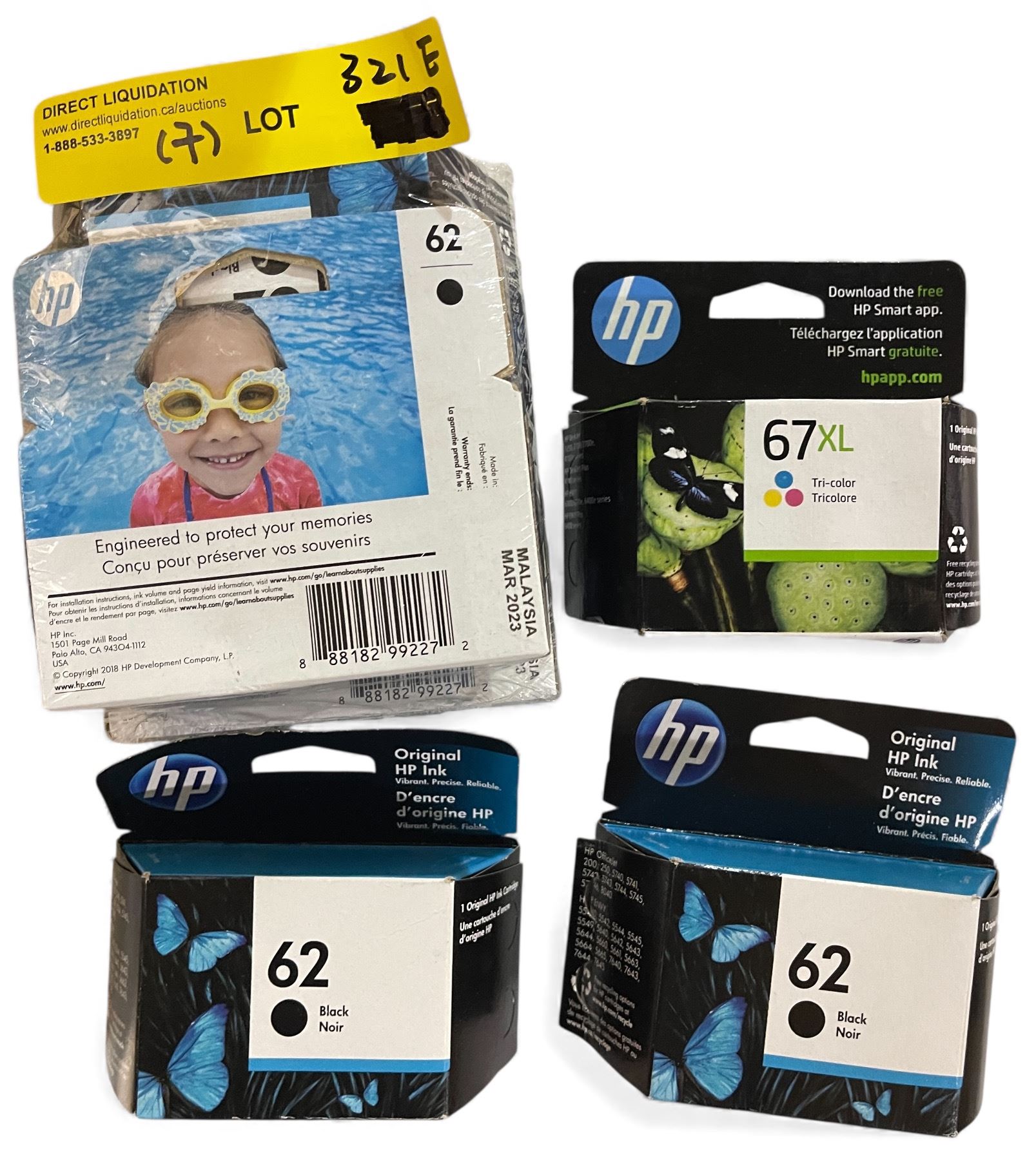 Group of 7 - New HP Ink Cartridges - RV: 210 CAD (6 Boxes 62 Black + 62 Photo + 1 Box 67XL Tri-Color)