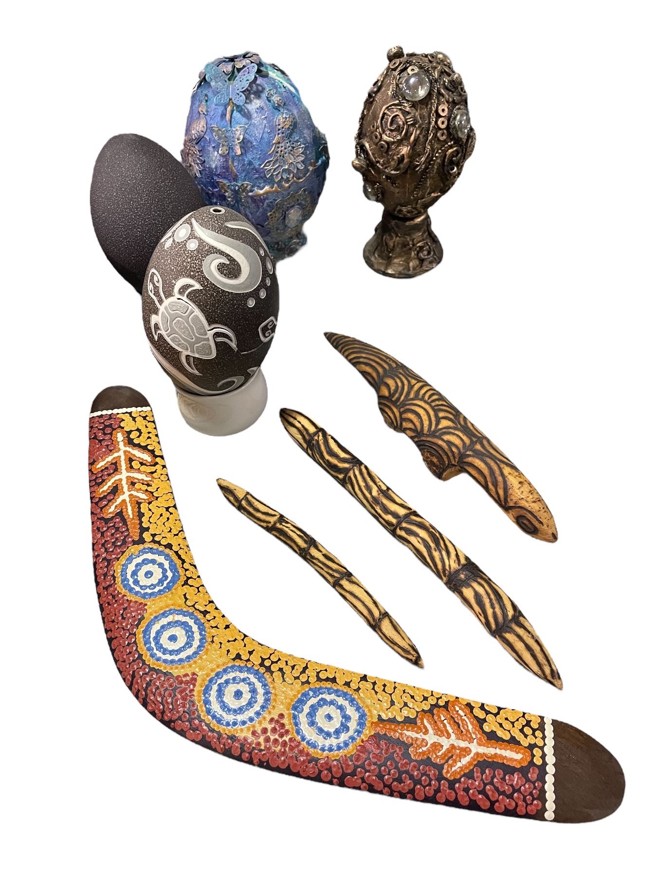 Group of 8 Assorted Decorative Indigenous Australian Artifacts: Includes Boomerangs, Carvings, and Decorative Eggs