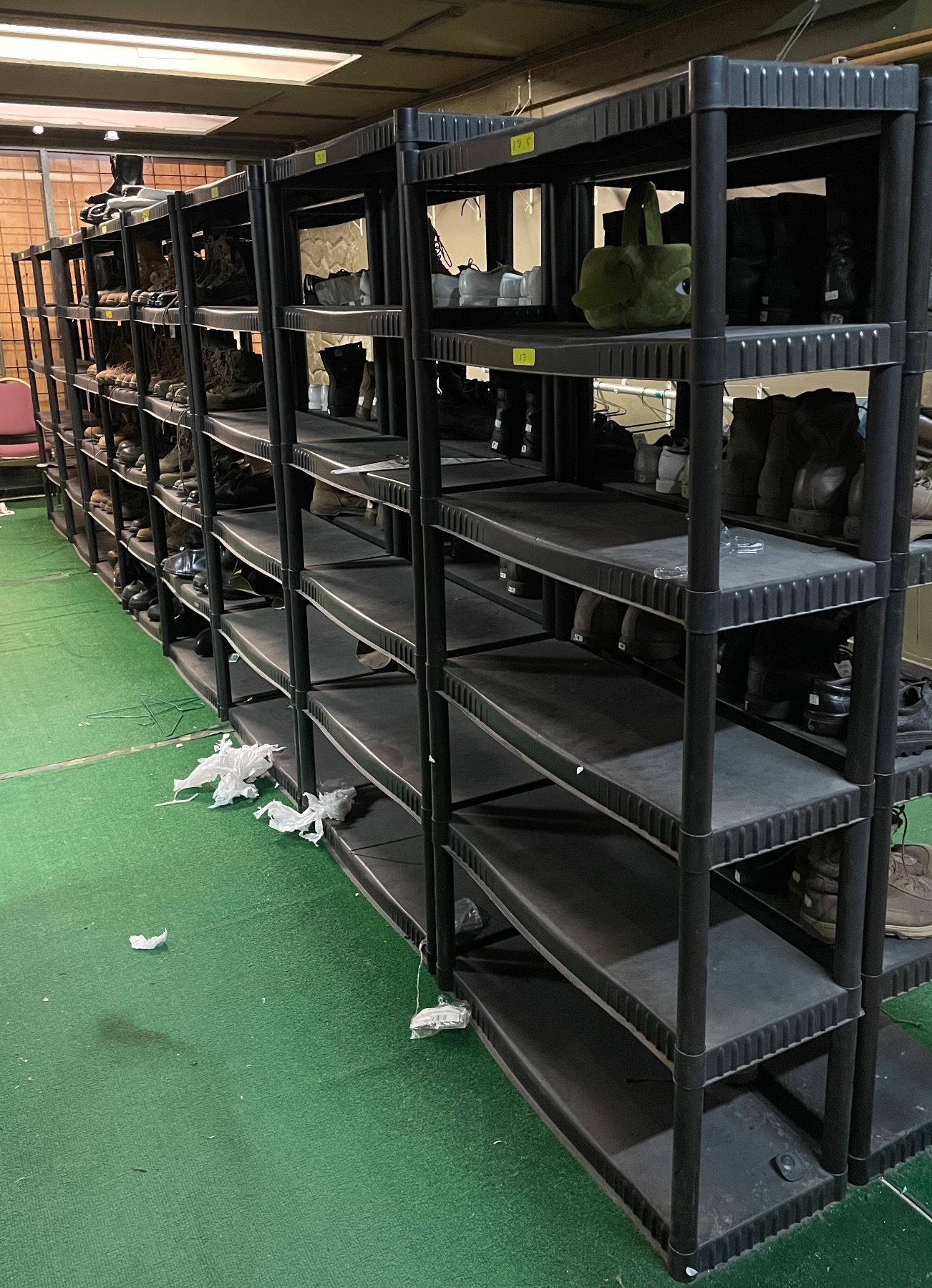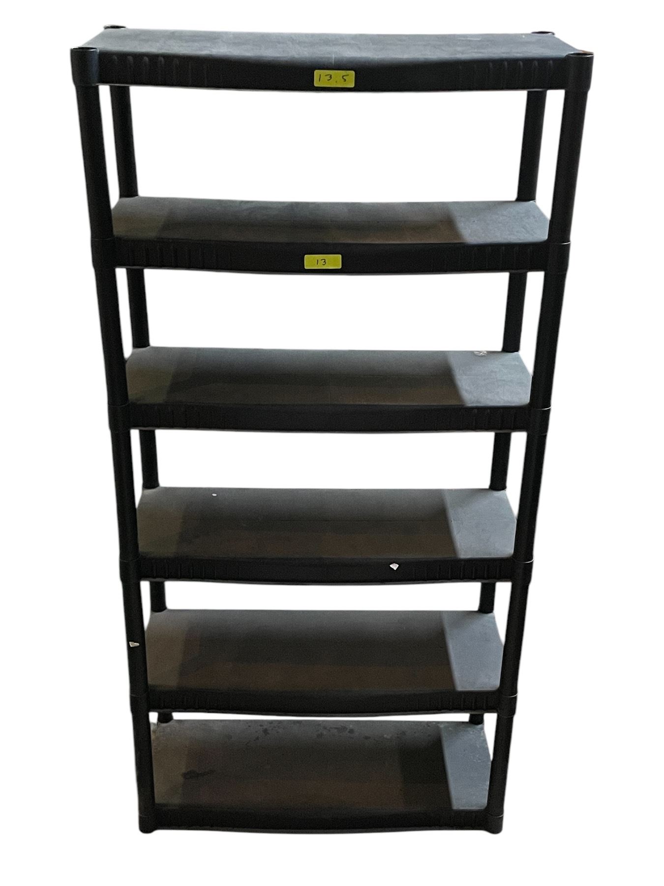 Group of 8 heavy duty 5-6 tier plastic shelving units (approx 34in x 14in x 70in H)