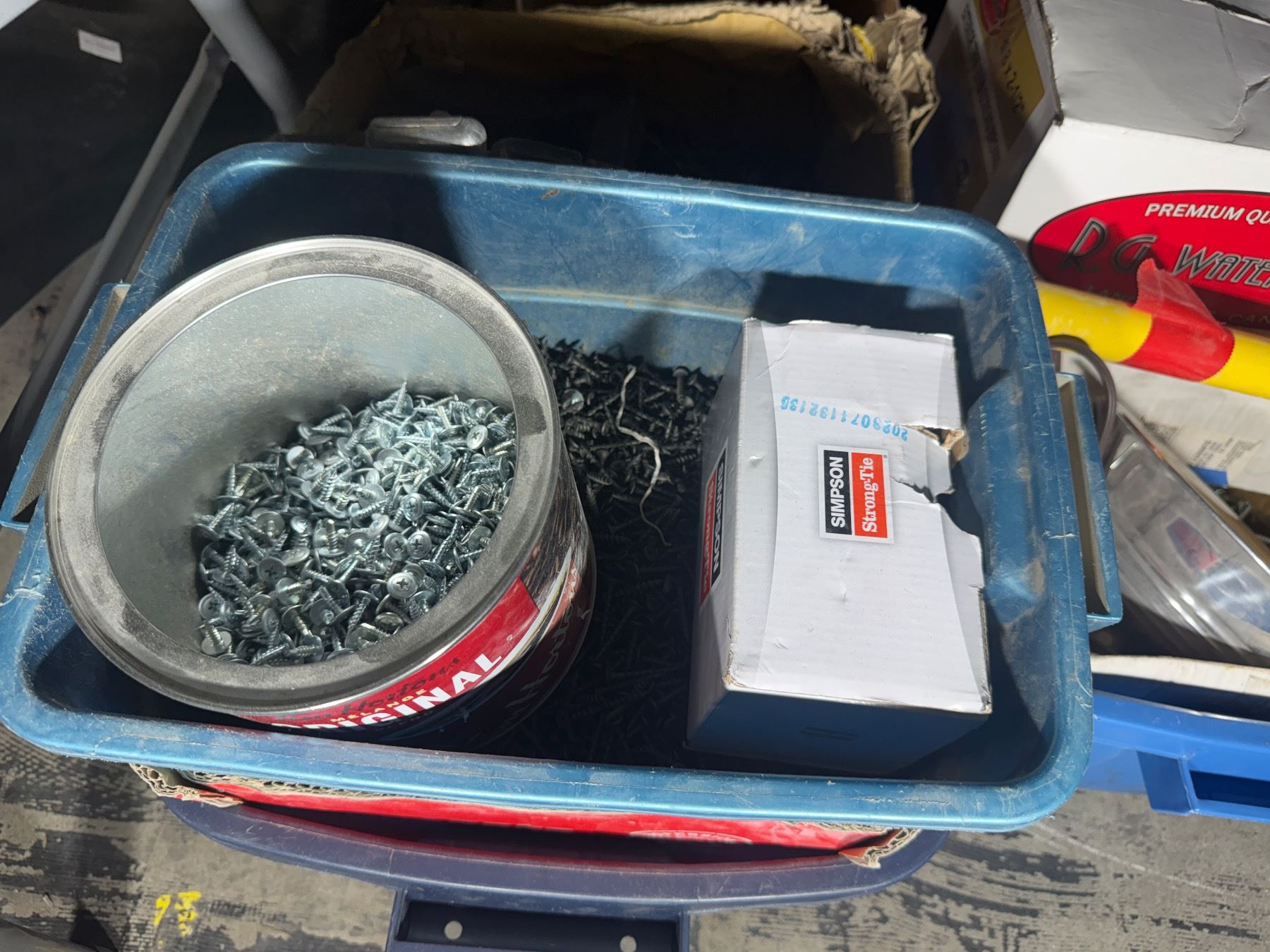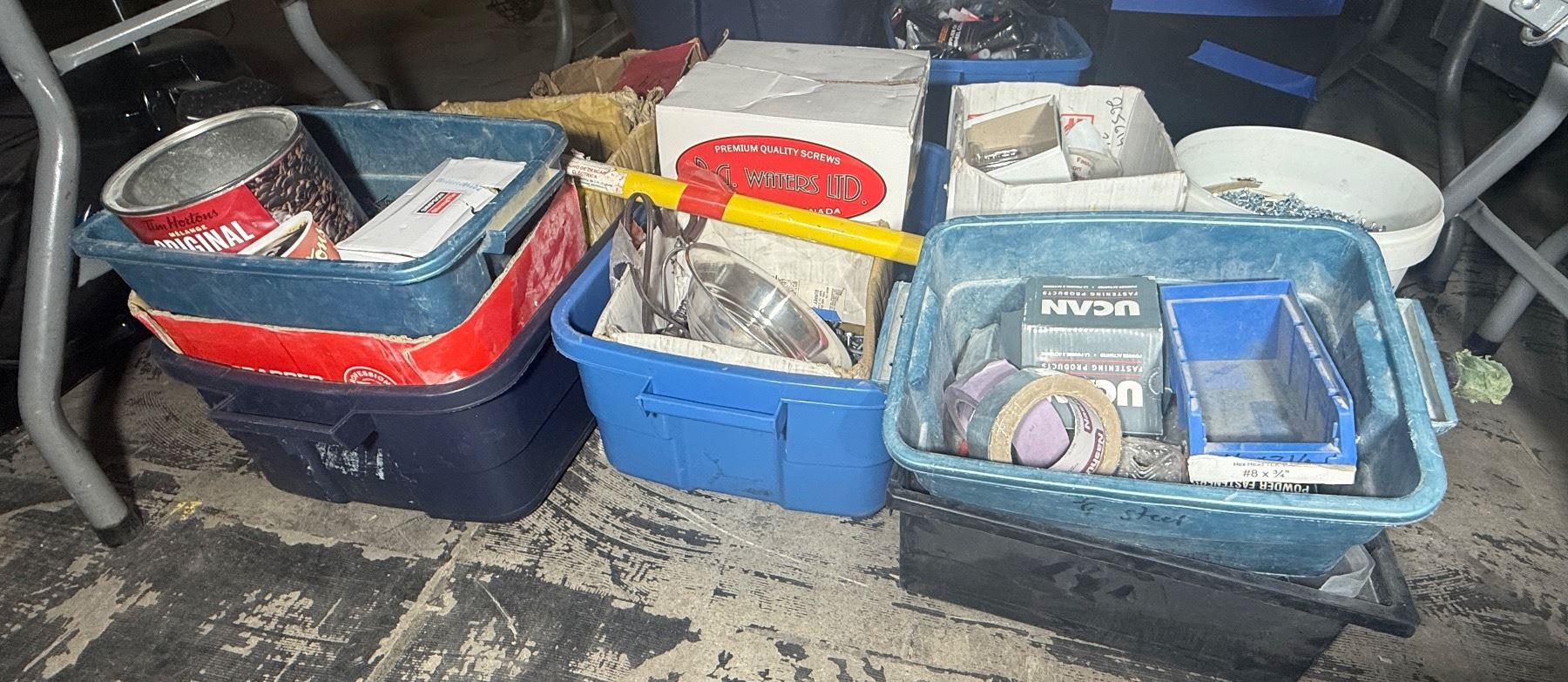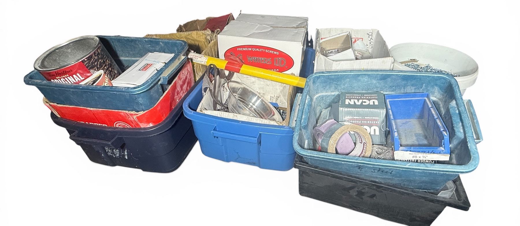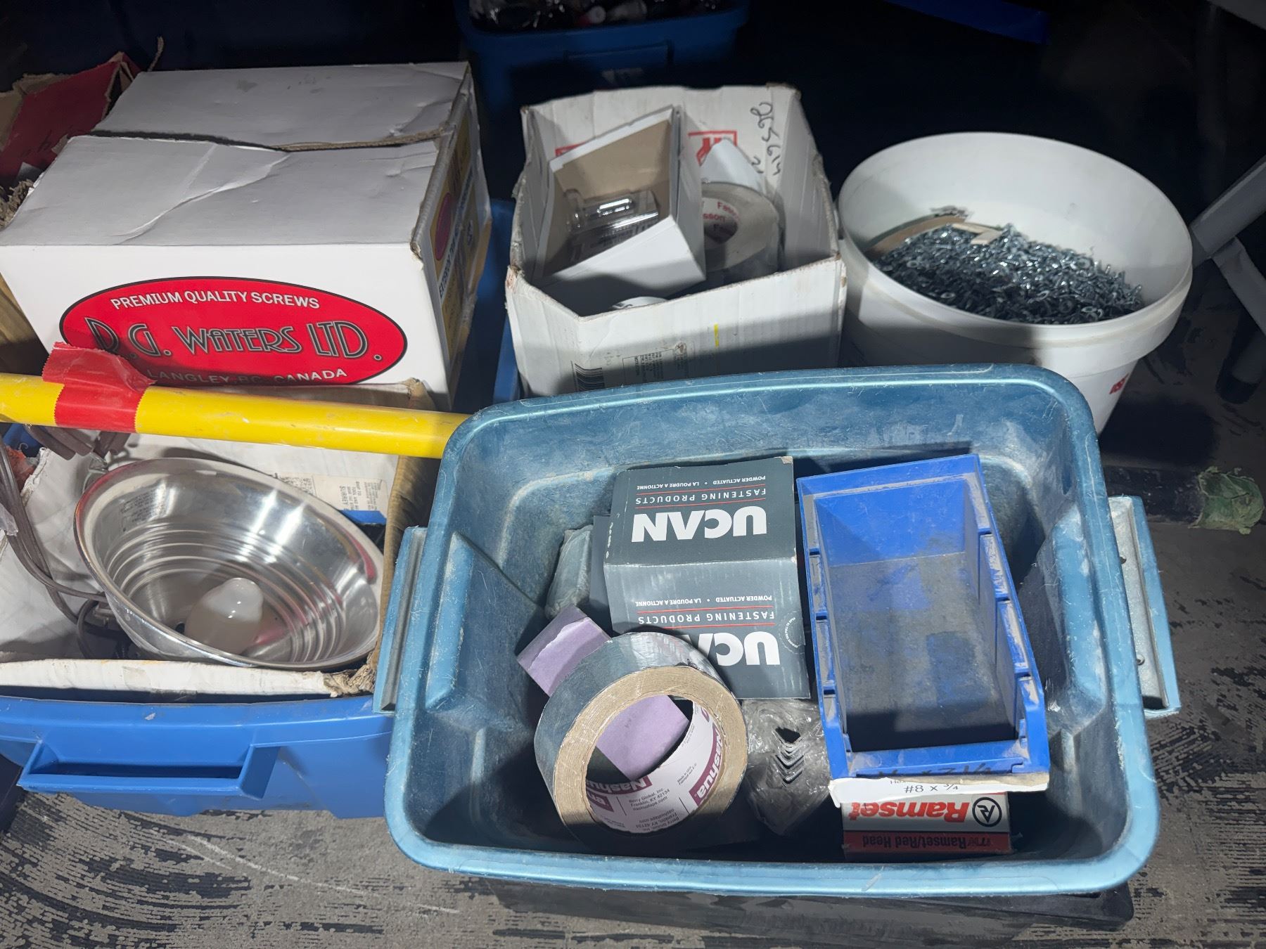 Group of Assorted Bins of Tools - Includes Nails, Screws, Duct Tape etc