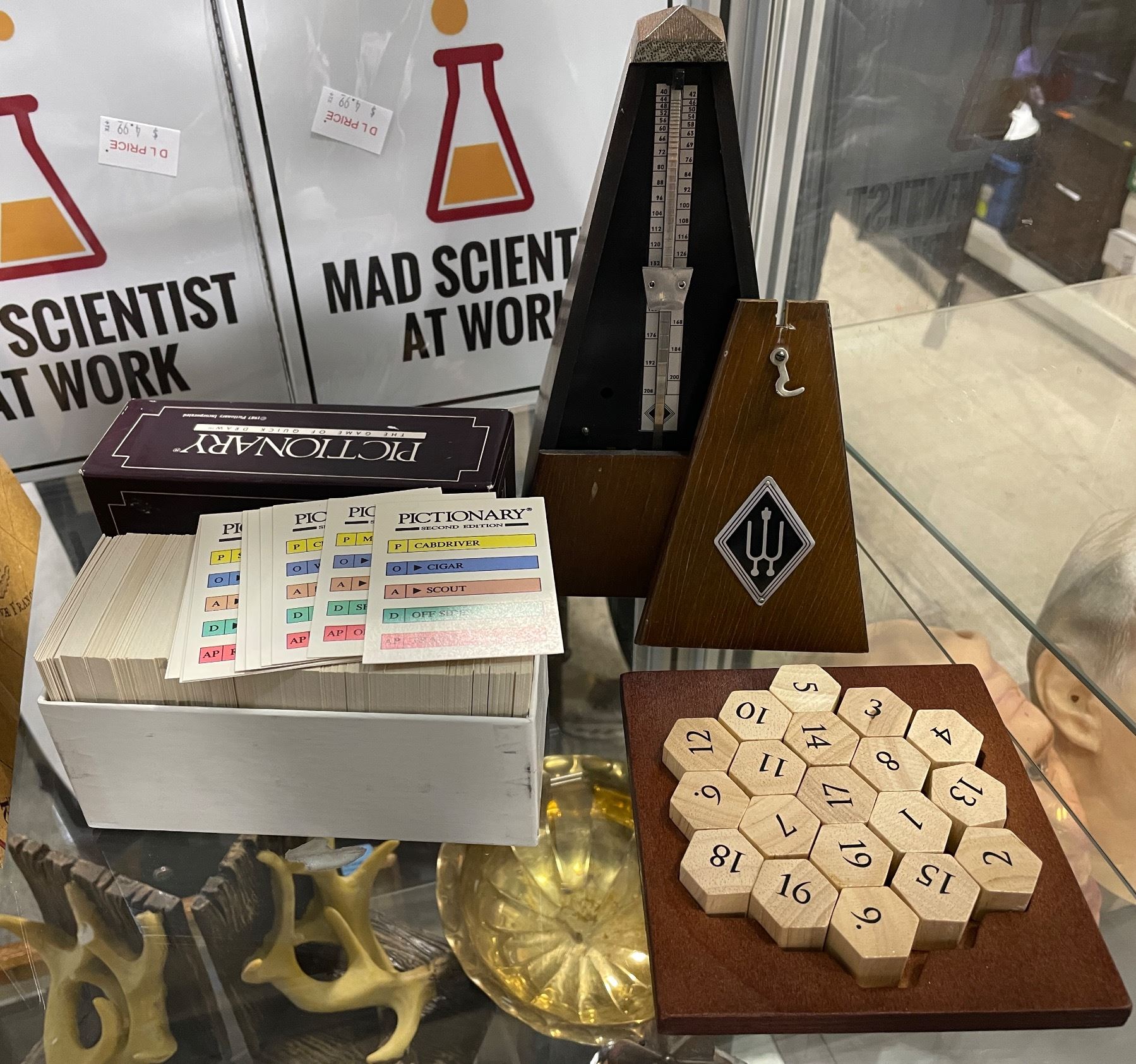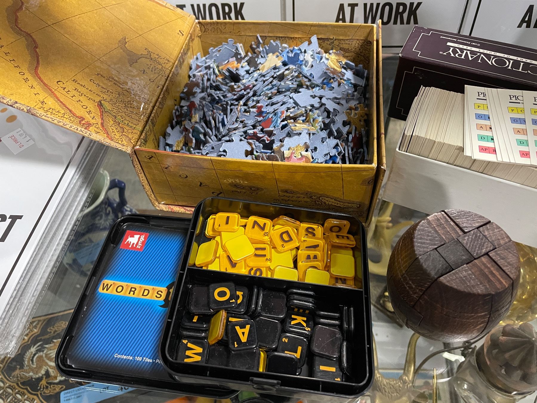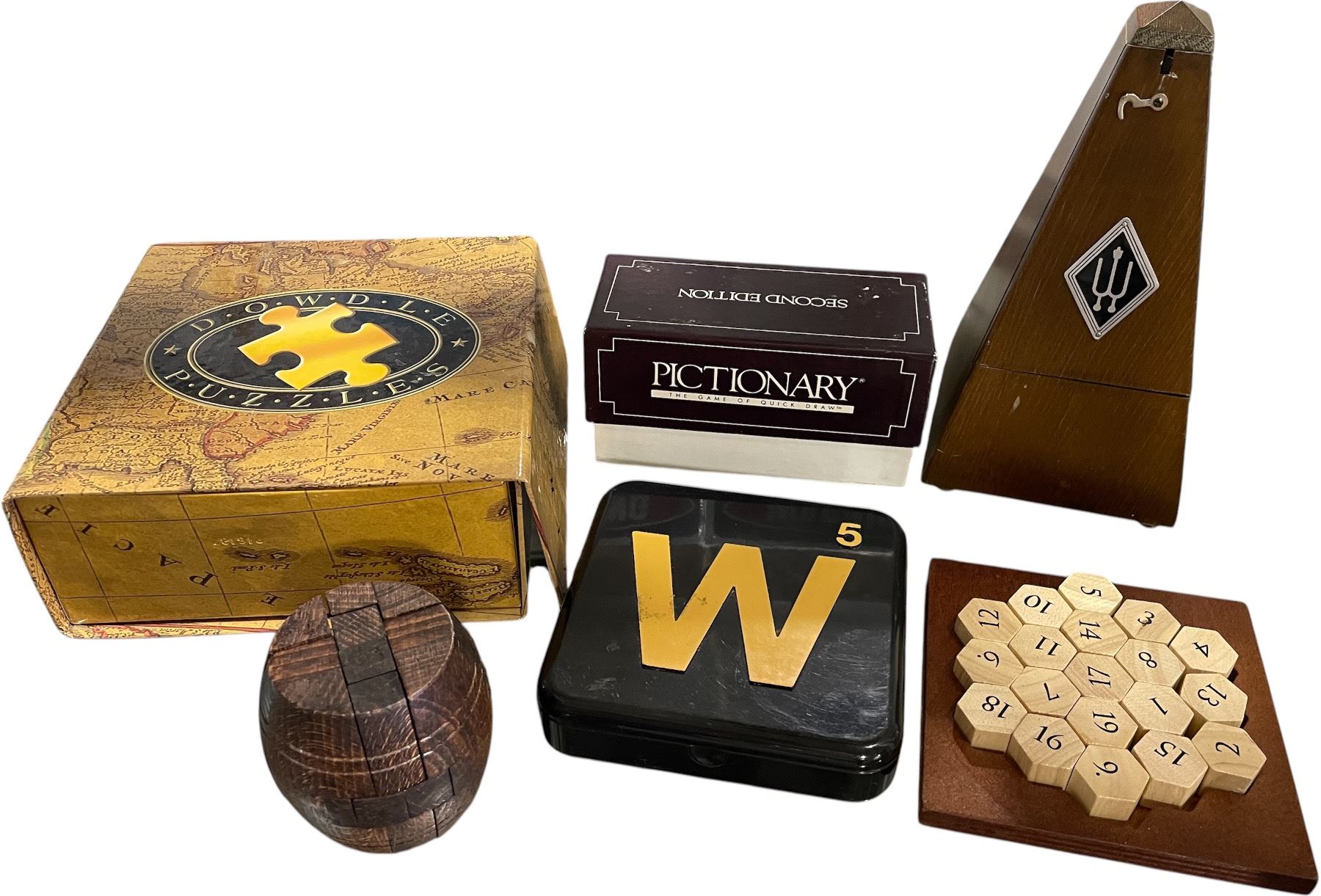 Group of Assorted Games & Puzzles - Pictionary, Word Game, Wooden Brain Teasers, Etc.