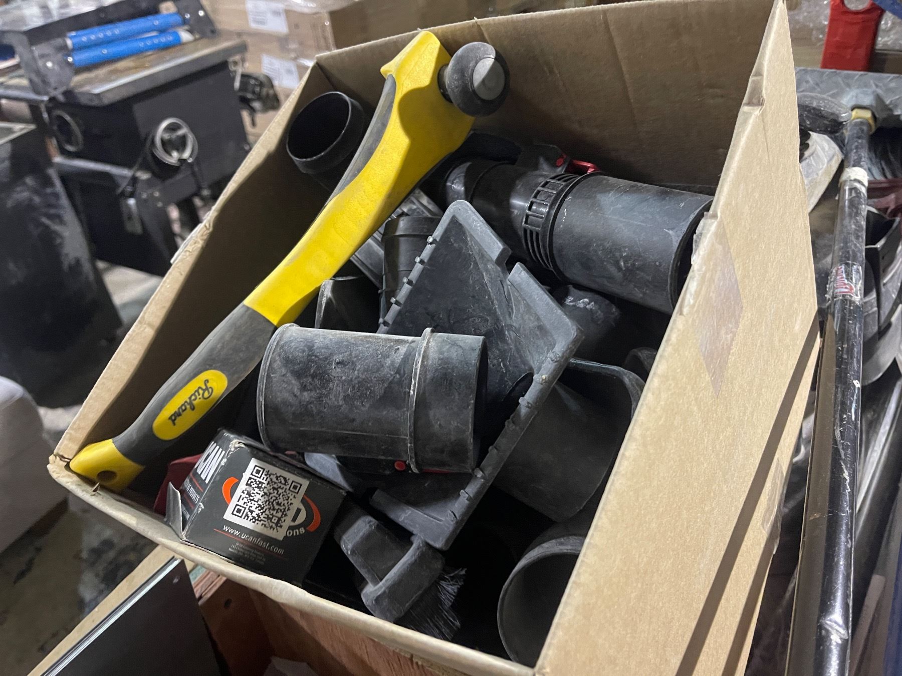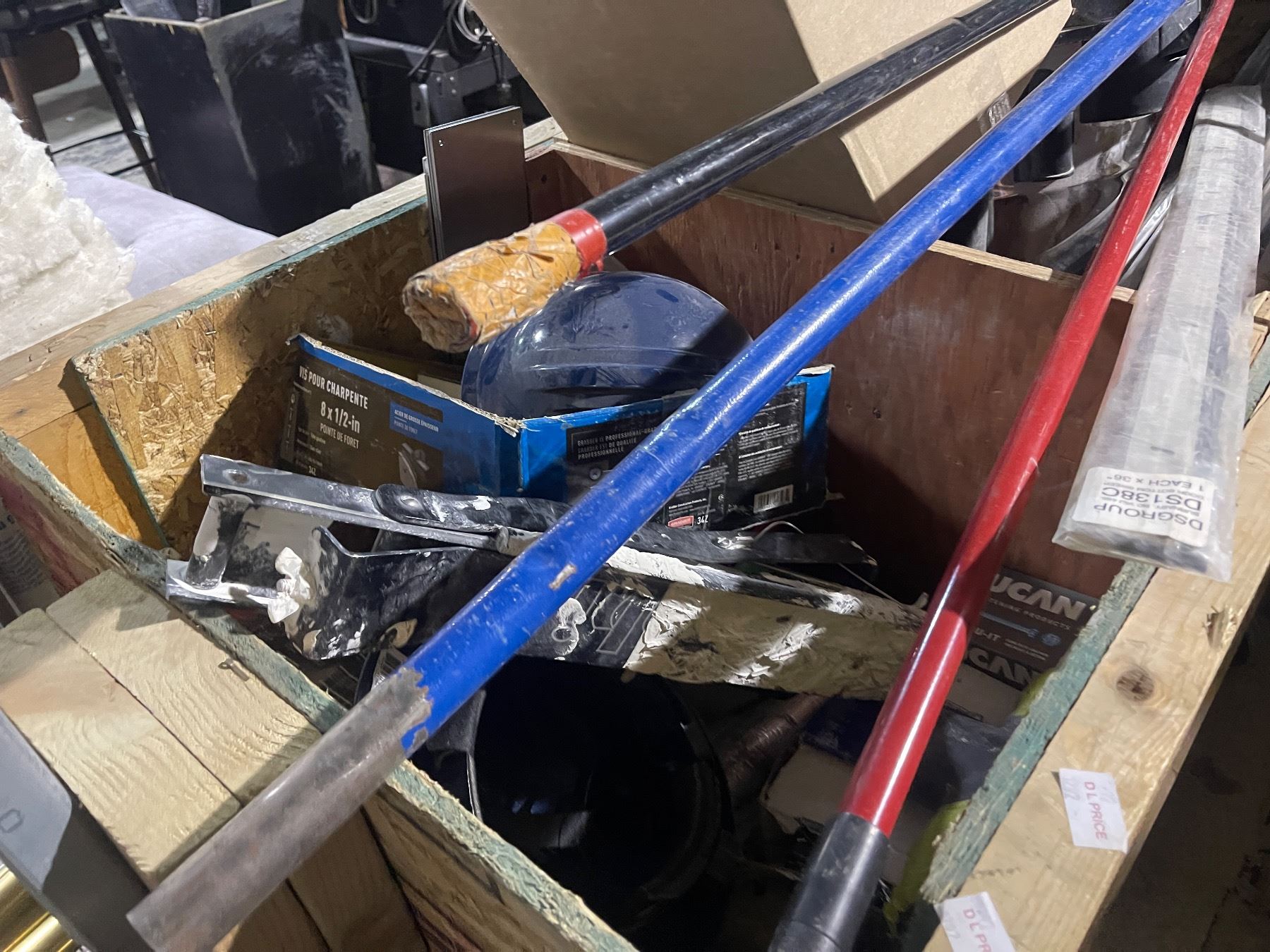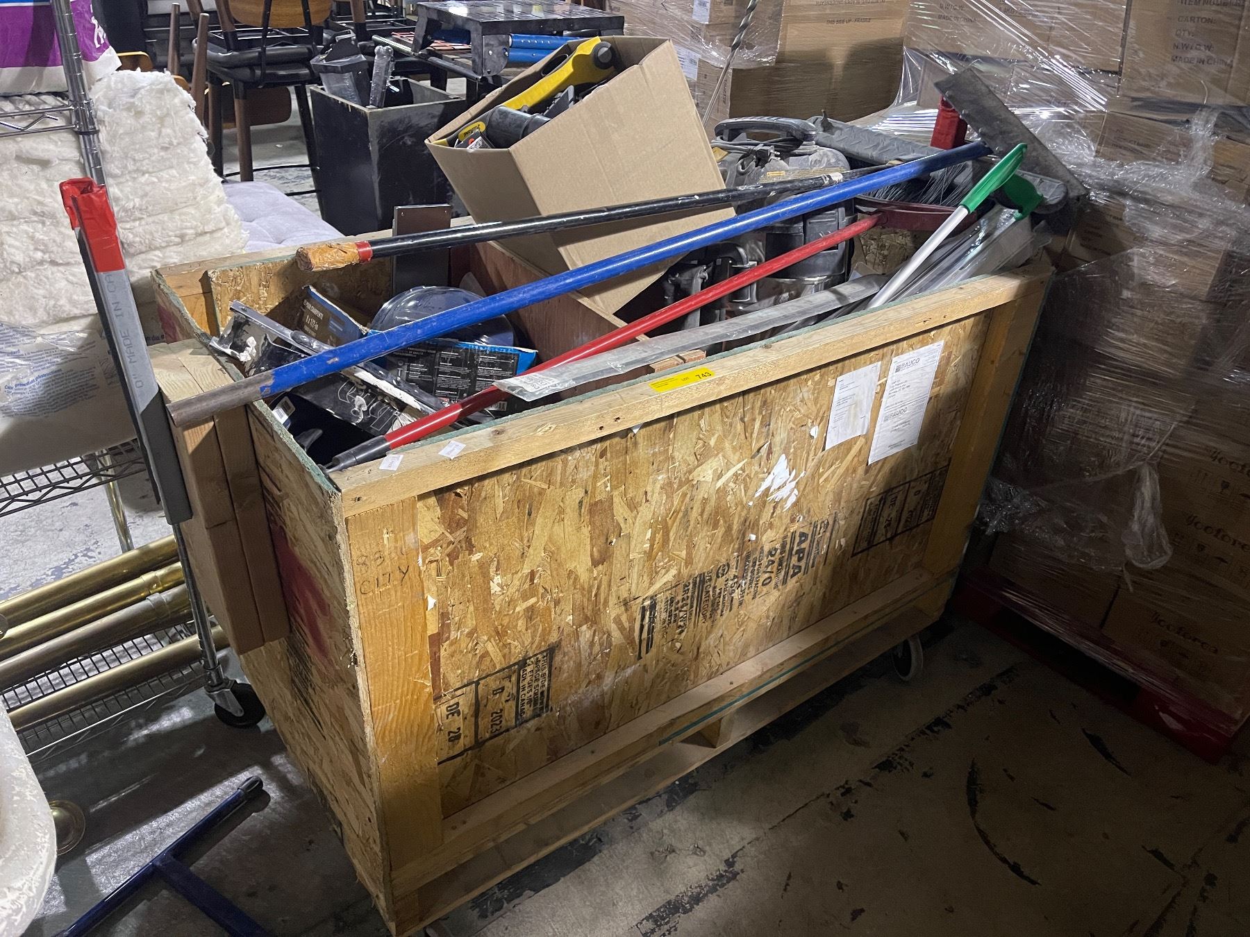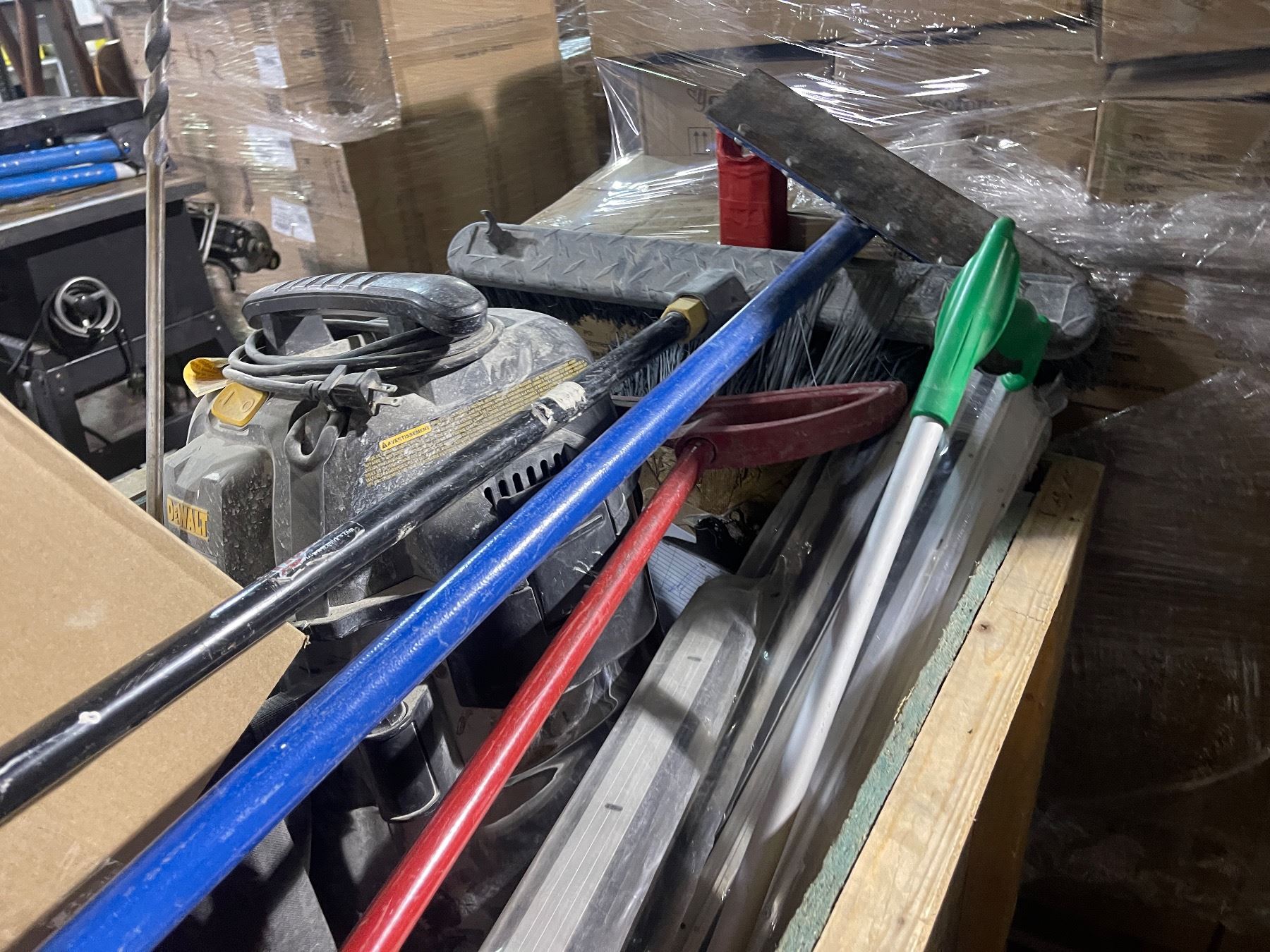 Group of Assorted Industrial Cleaning Items, Wooden Crate on wheels and more