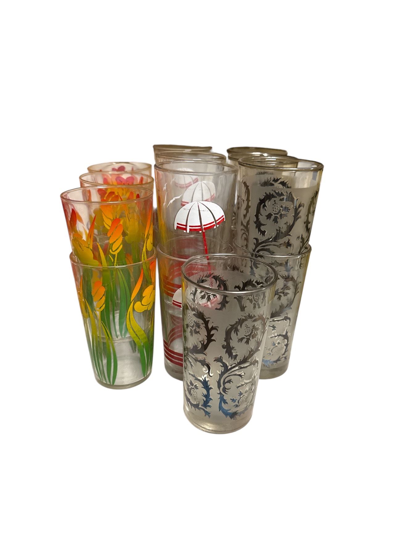 Group of Assorted Juice Glasses - Floral Design, Umbrella, Etc.