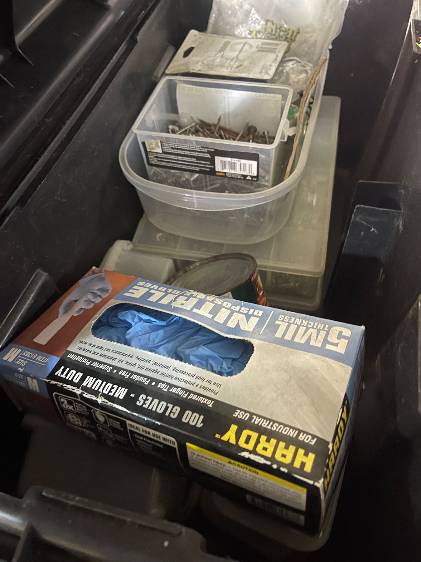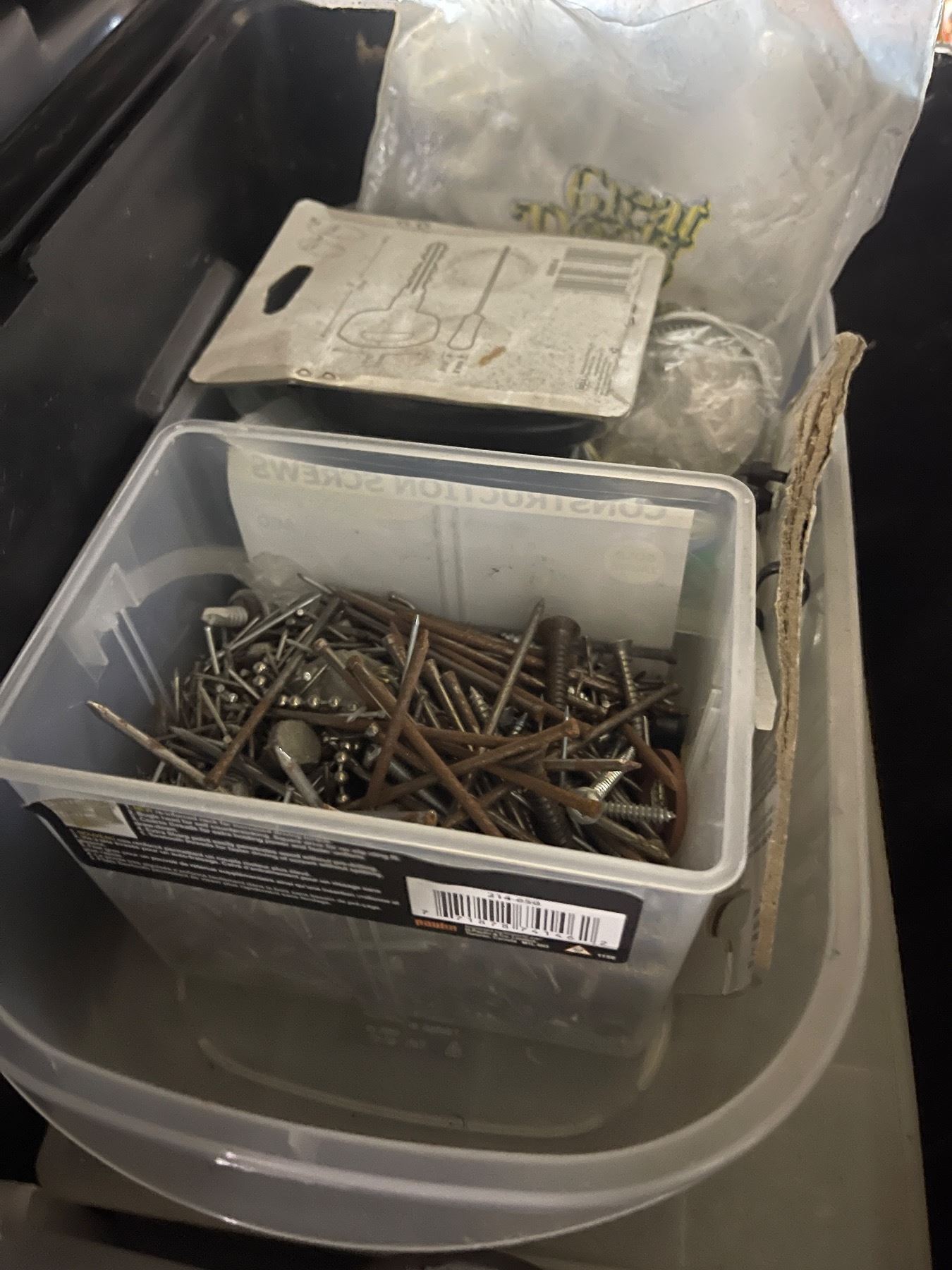 Group of Assorted Nails, bolts, studs and Tool box