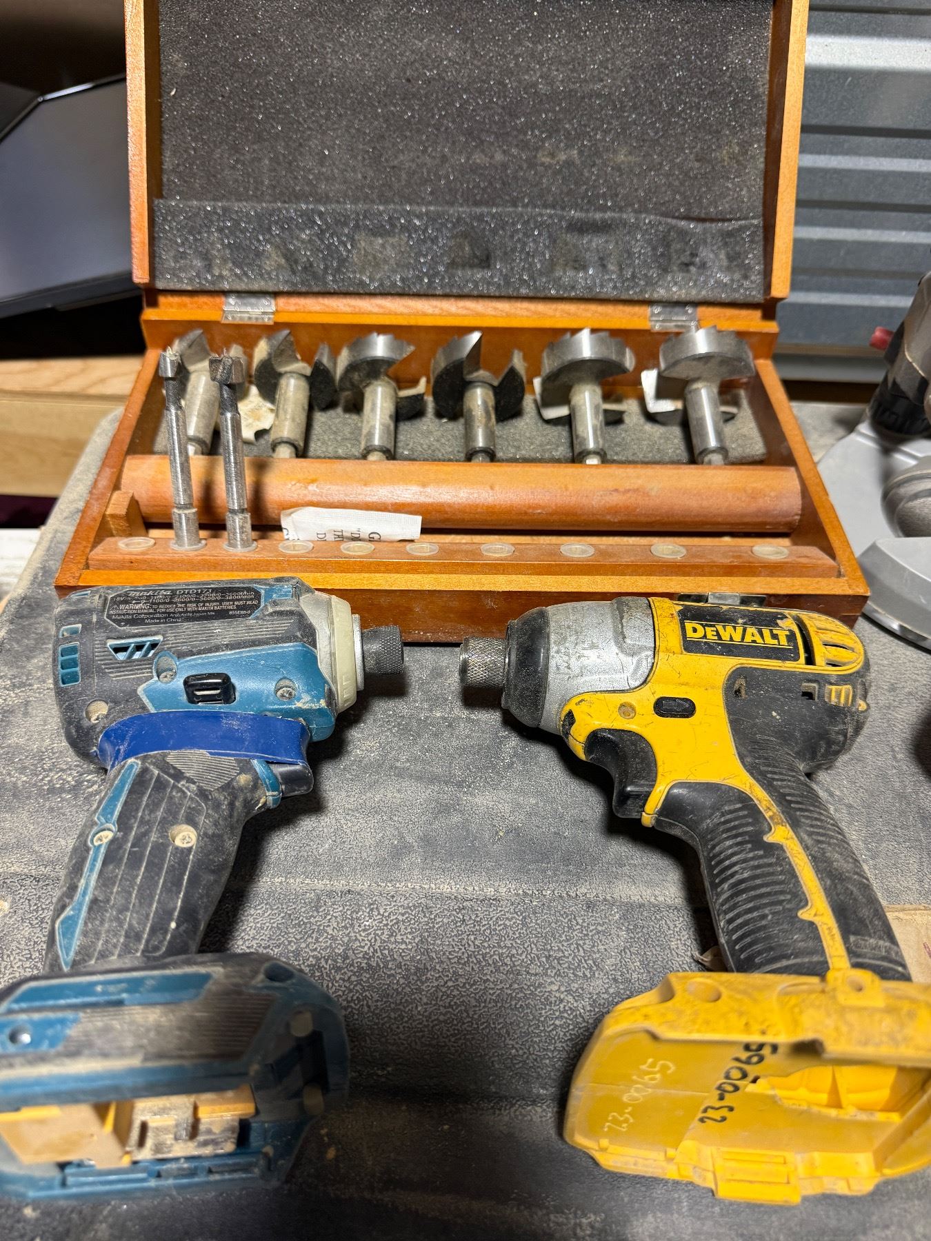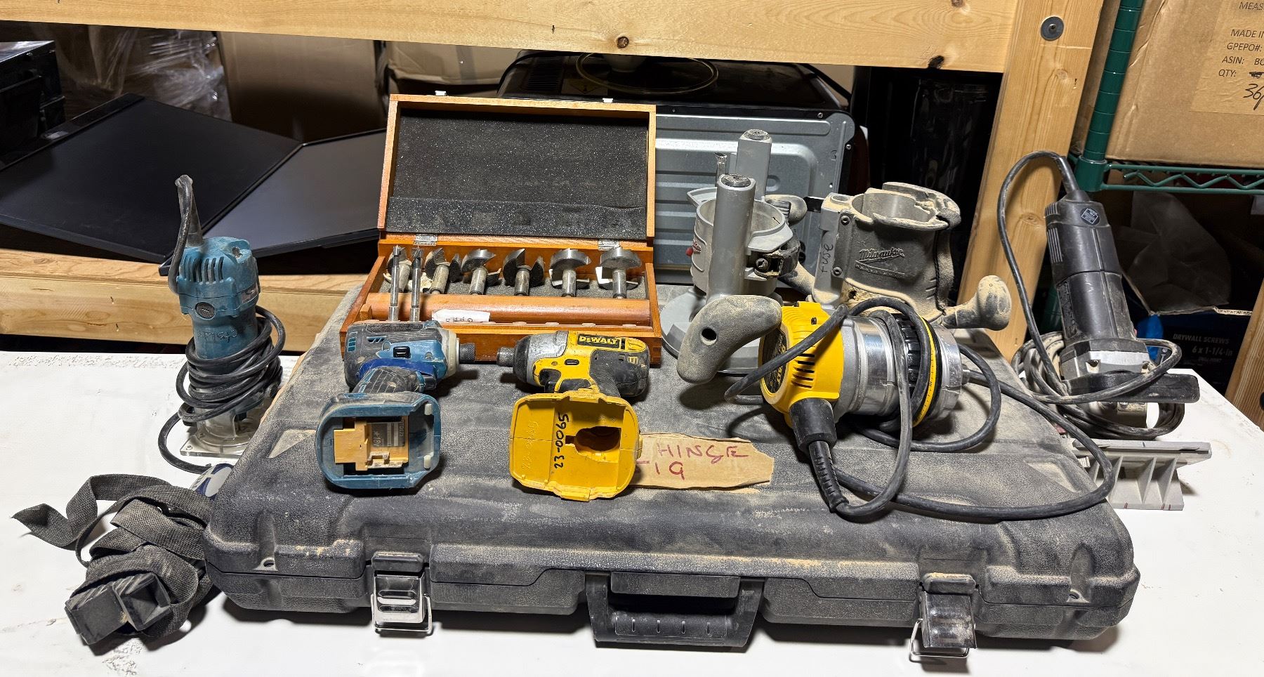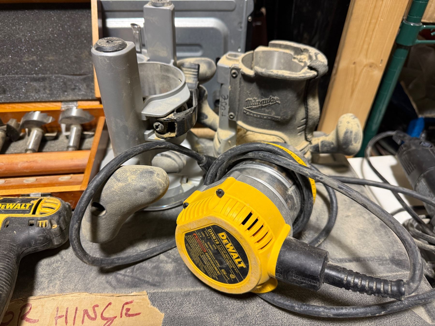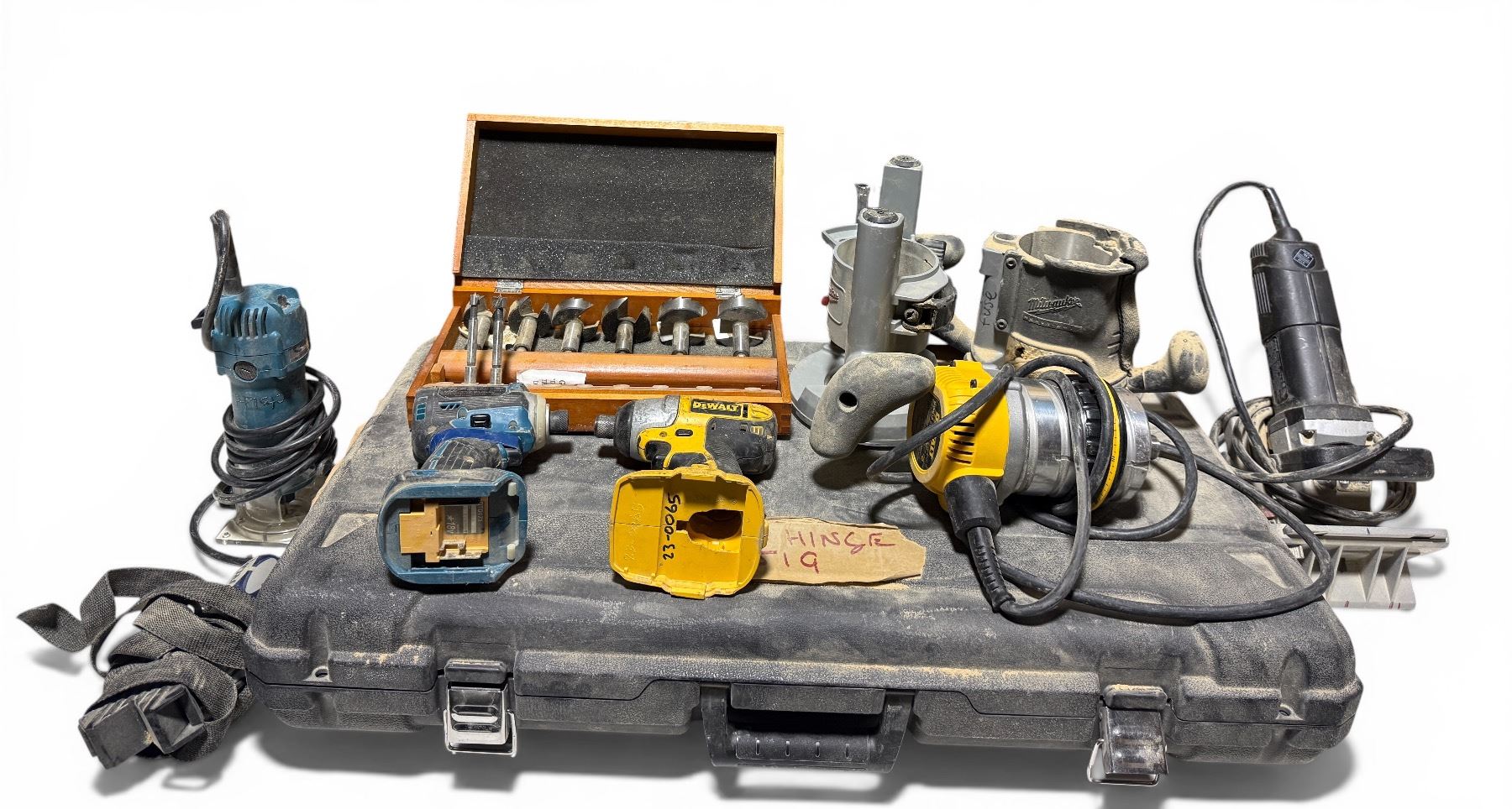 Group of Assorted Tools - Includes Hole saw, Porter Cable Door Hinge, Milwaukee Plunge Router Bases, DeWalt DW618 Router, etc