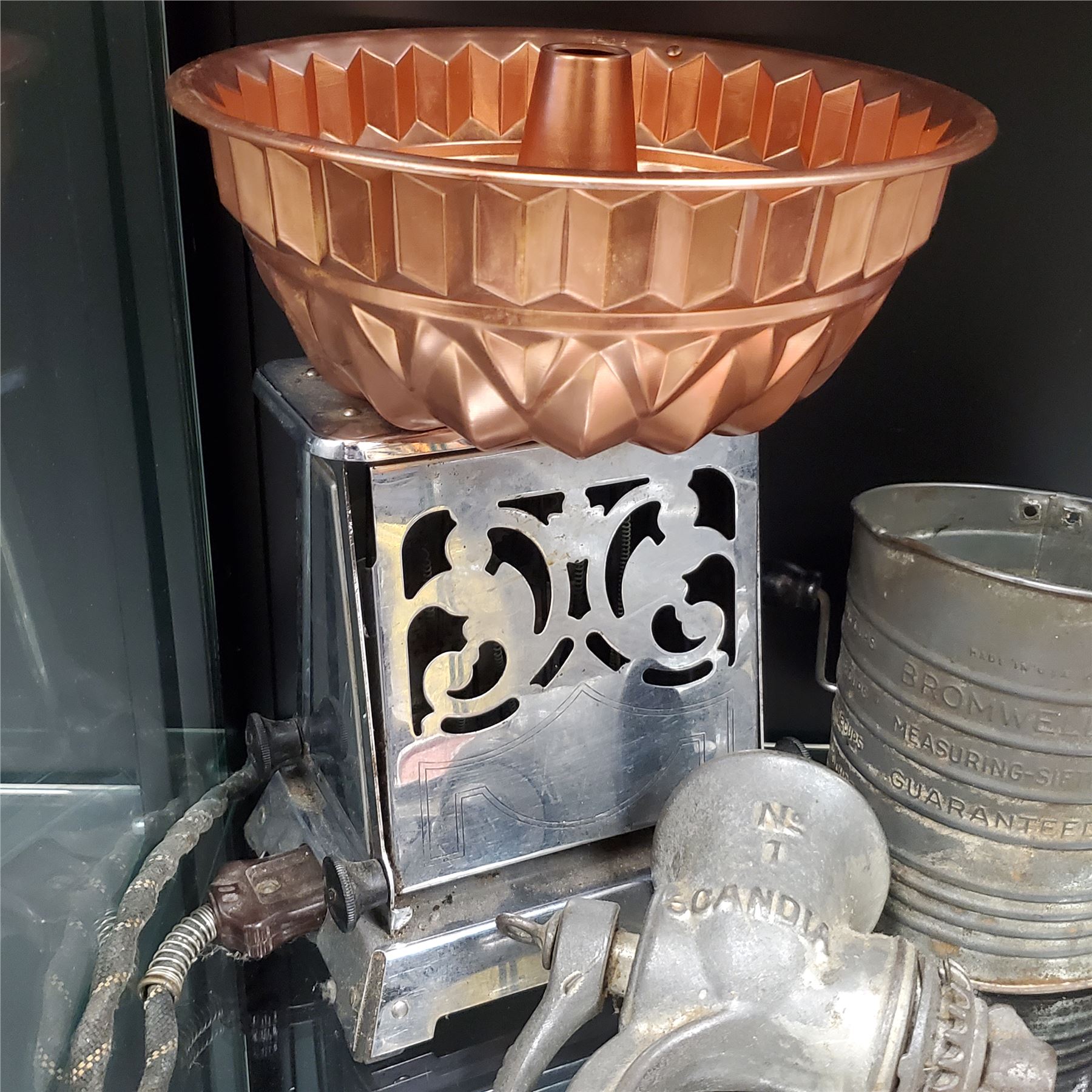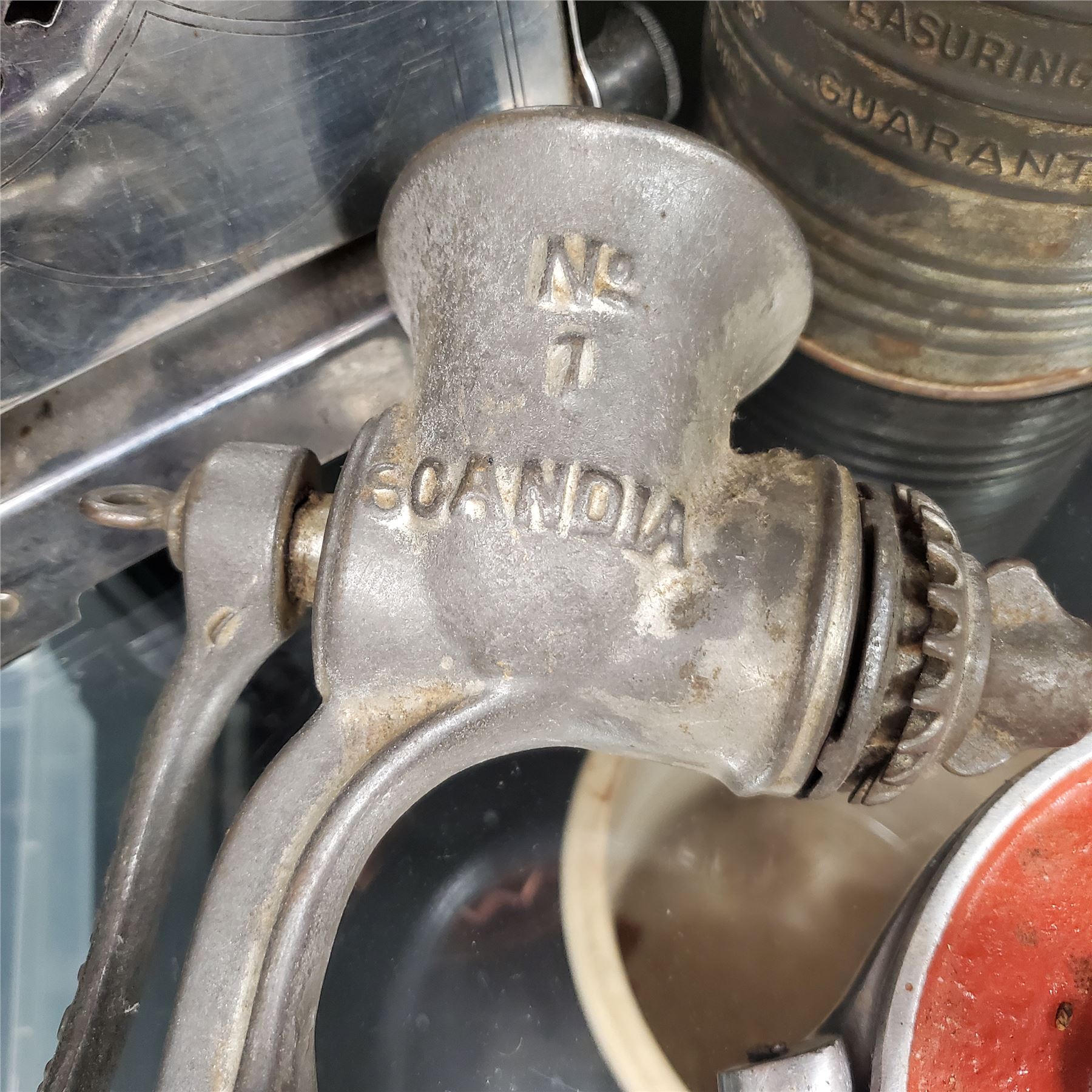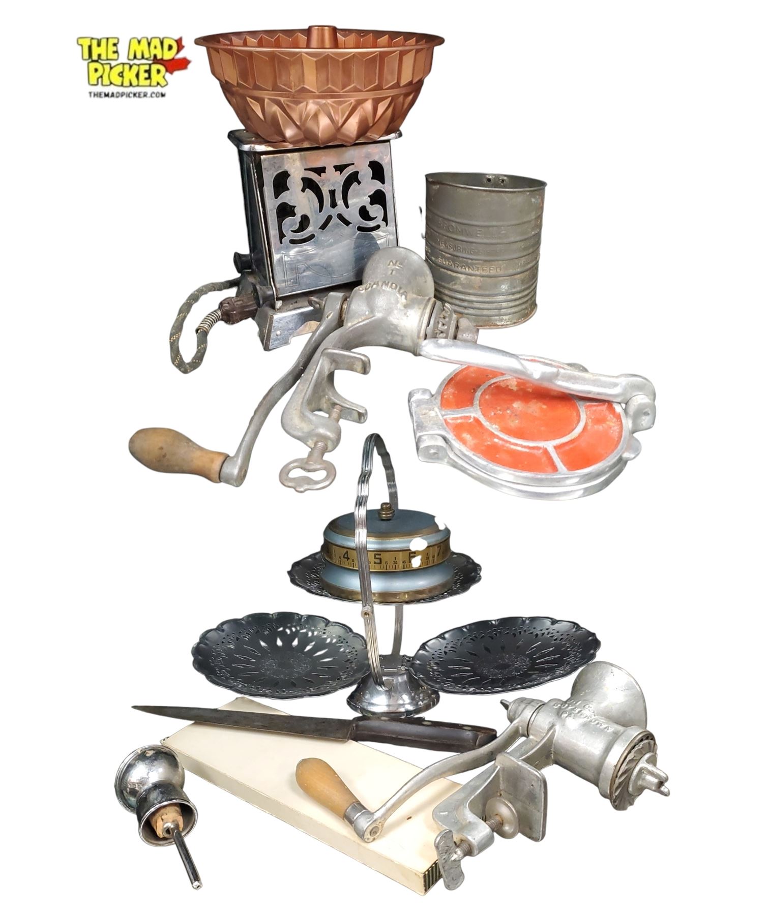 Group of assorted vintage kitchenware - meat grinders, accessories, timer etc.