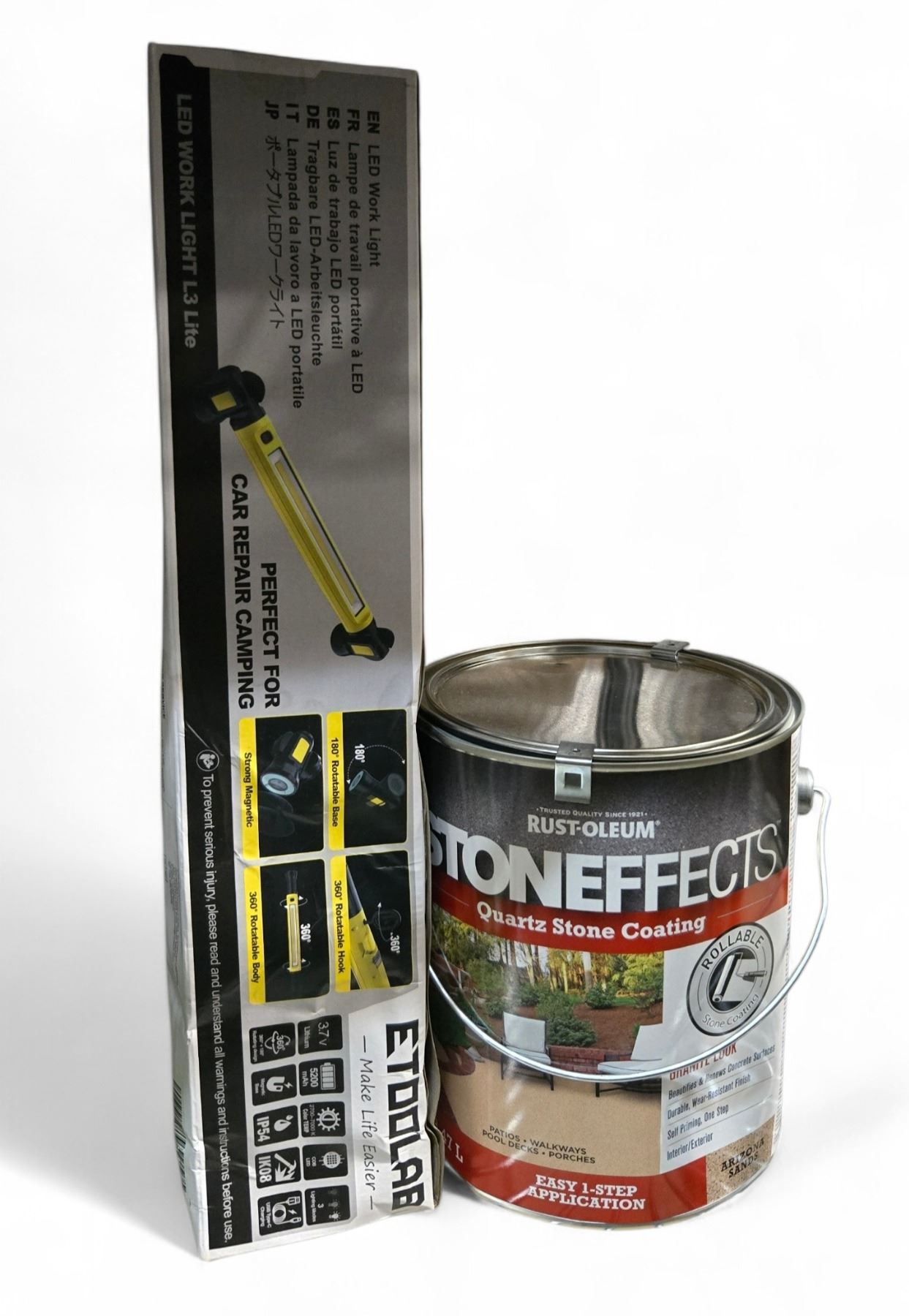 Group of BNIB Etoolab LED Work Light L3 Light & Rust-Oleum Stoneffects Decorative Quartz Stone & Concrete Coating Paint, Arizona Sands Retail $114