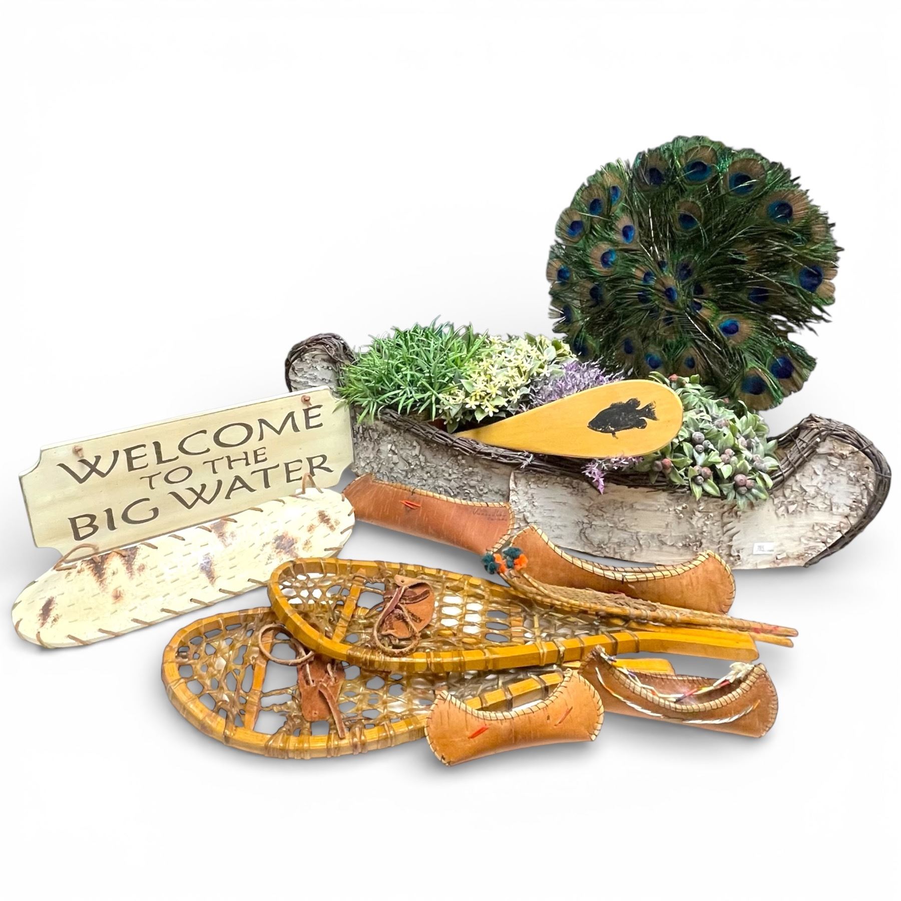 Group of Bark Canoes, Mini Snowshoes, Vase and more (Larges Canoe is 24" long)