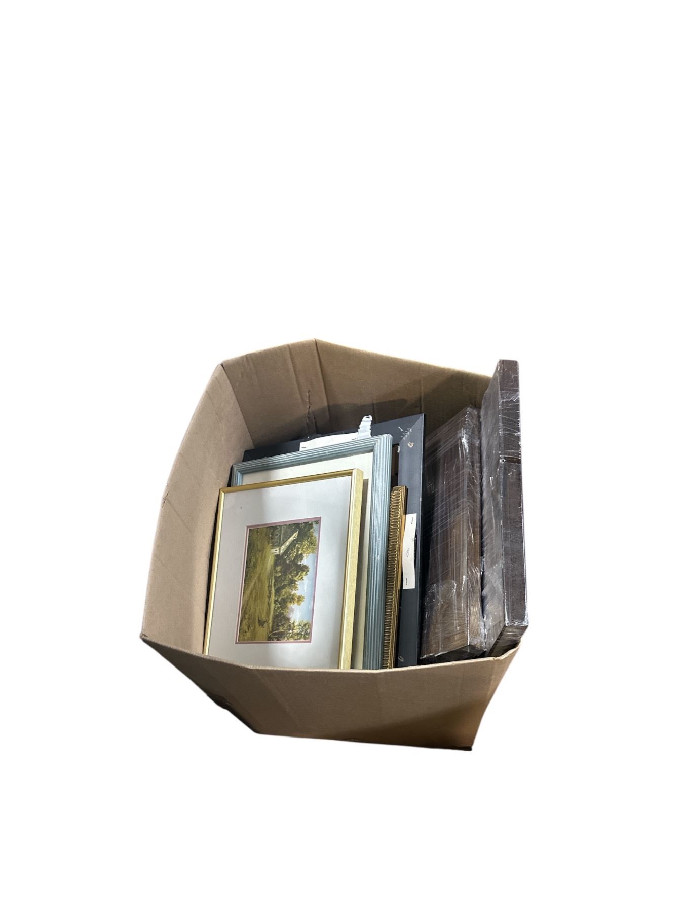 Group of Box of Various Framed Art & Kitchen Plates & Utencils
