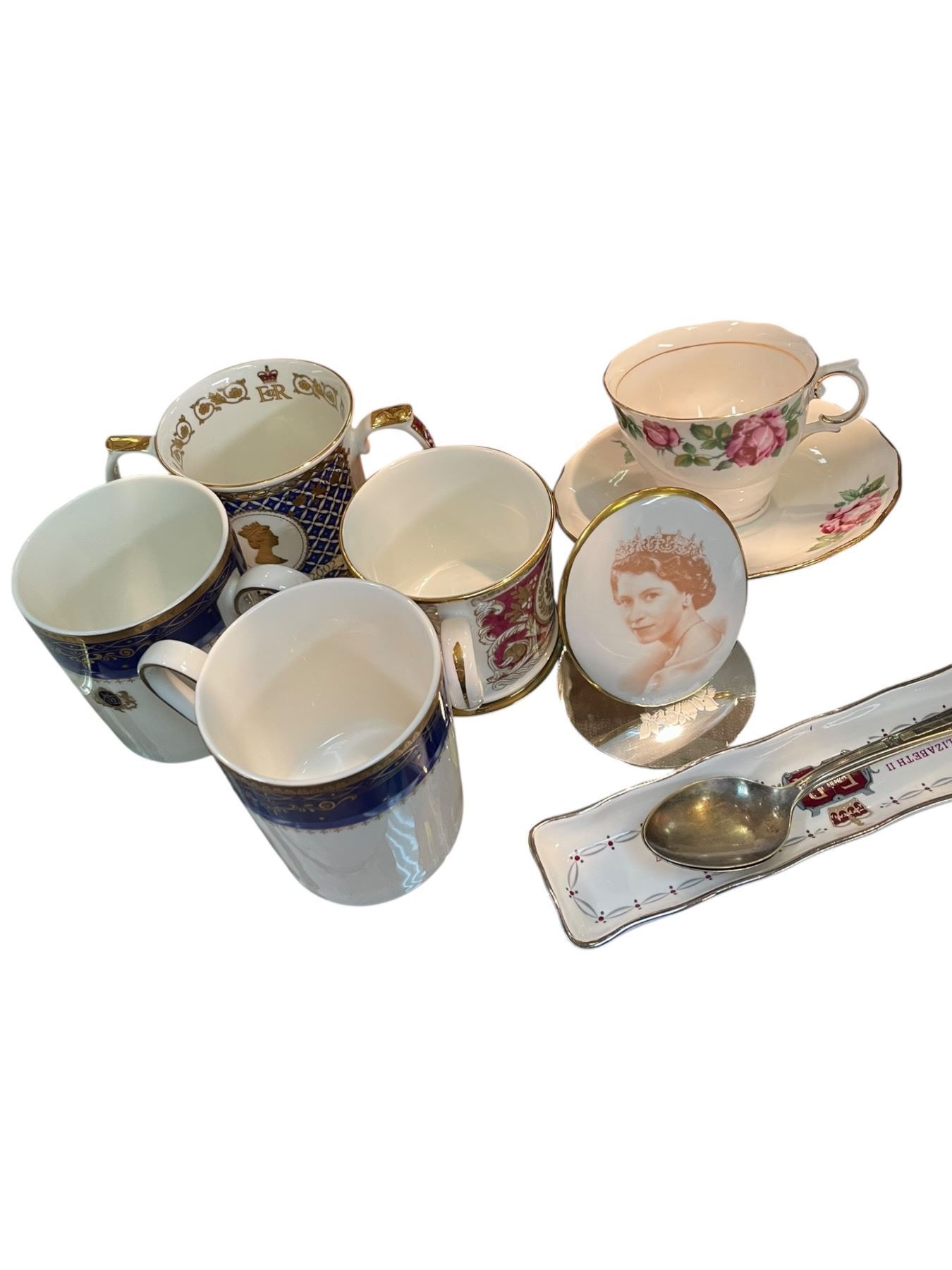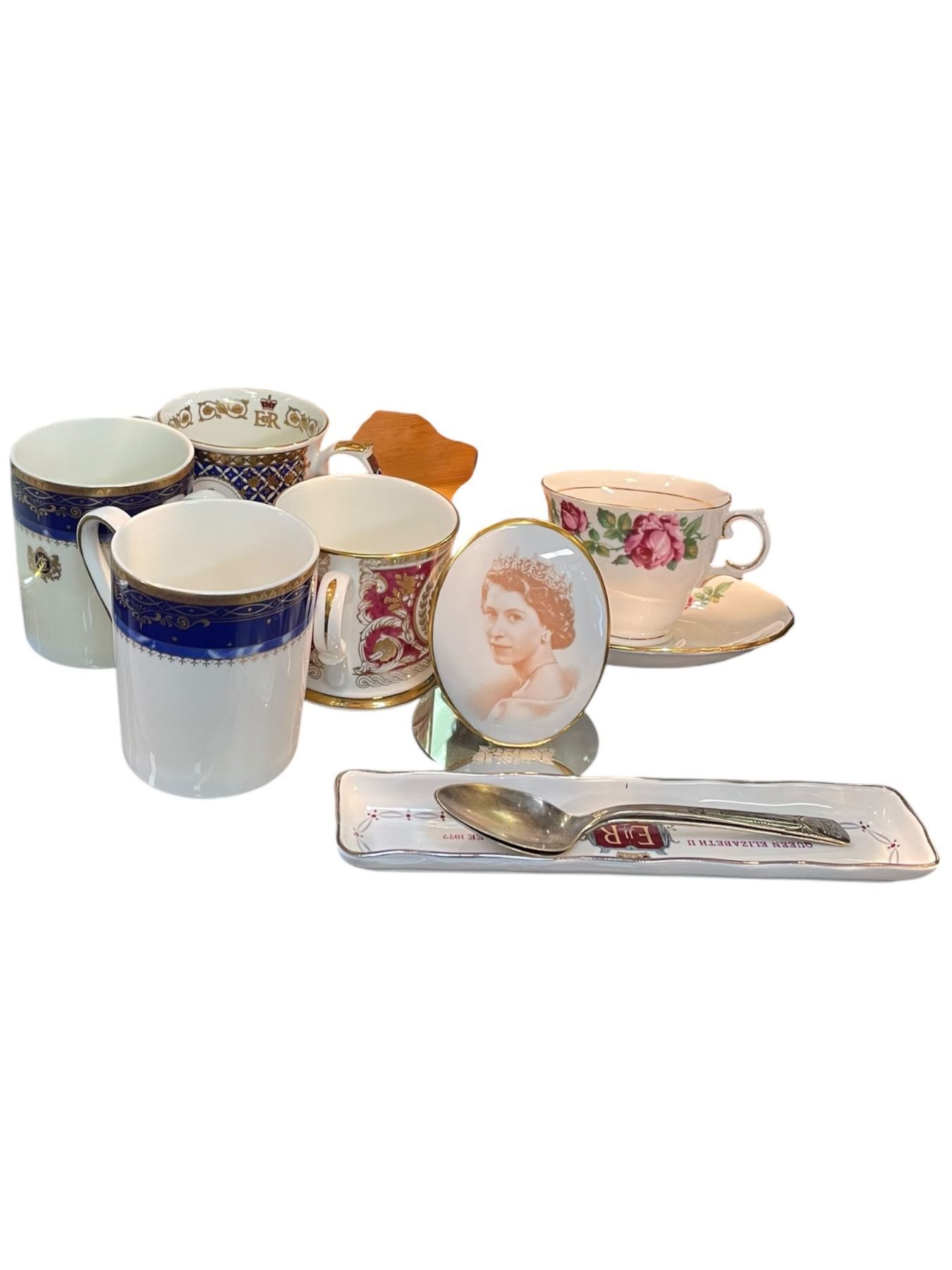 Group of British Commemorative China, Wood Angel and Narrow Framed Print