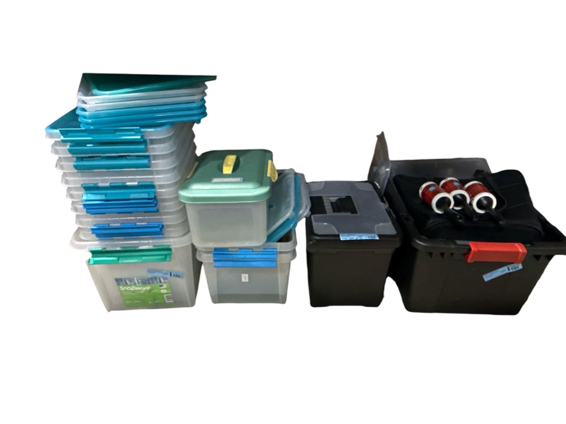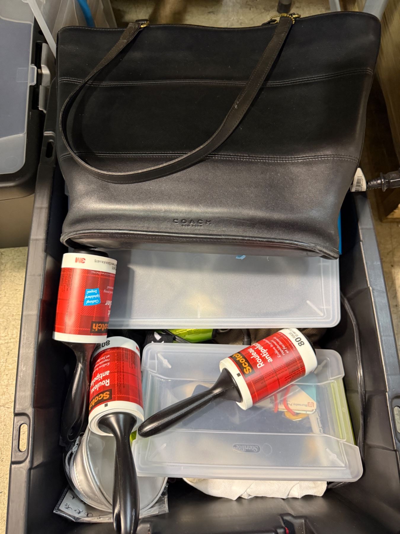 Group of Bulk Lot of Plastic Storage Bins, Lids, Totes & Lint Roller
