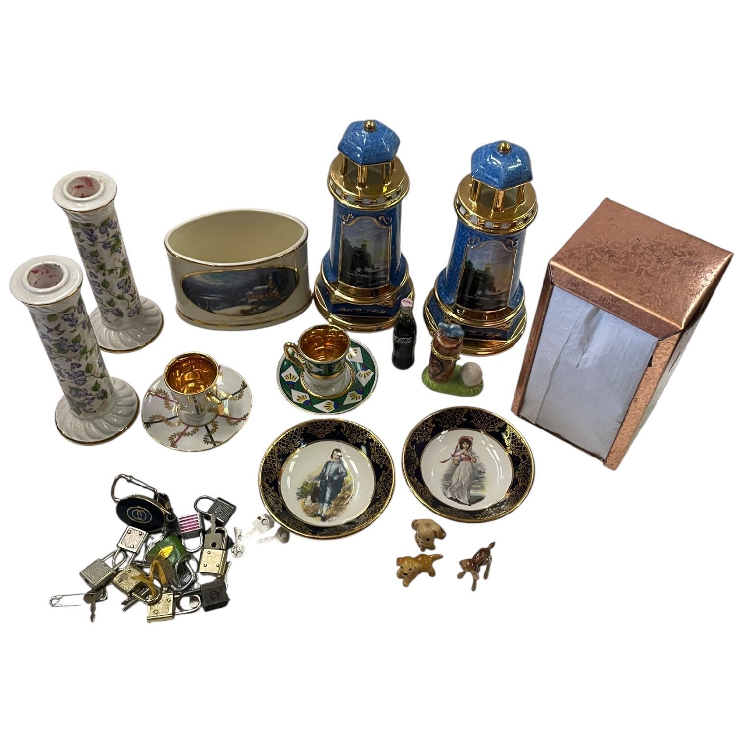Group of China Collectibles, Metal Serviette Dispenser & Many Tiny Locks