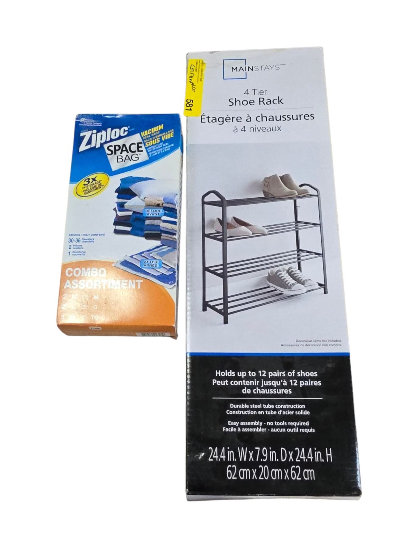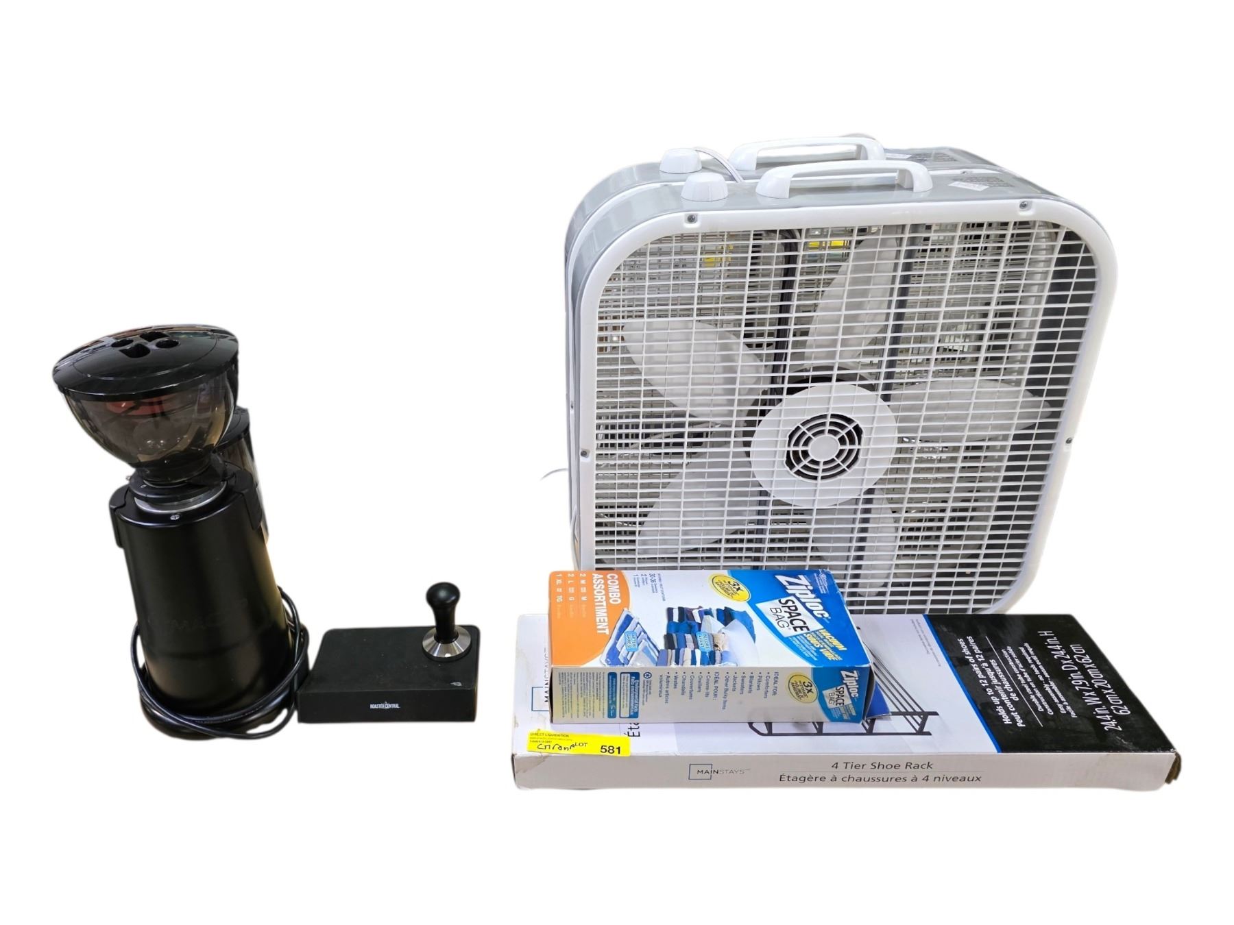 Group of Coffee Grinder, 2 Fans, 4 Tier Shoe Rack & Ziploc Bags