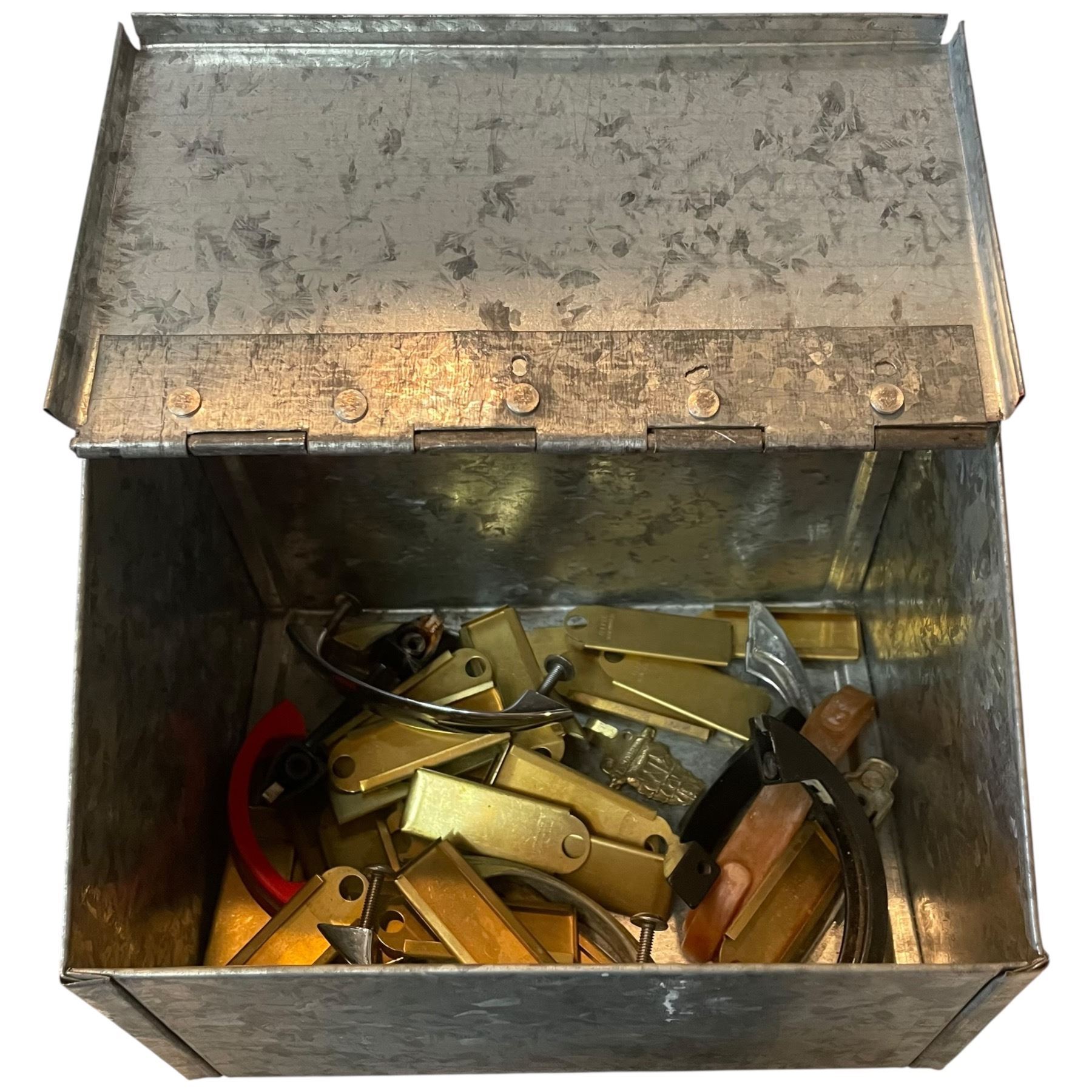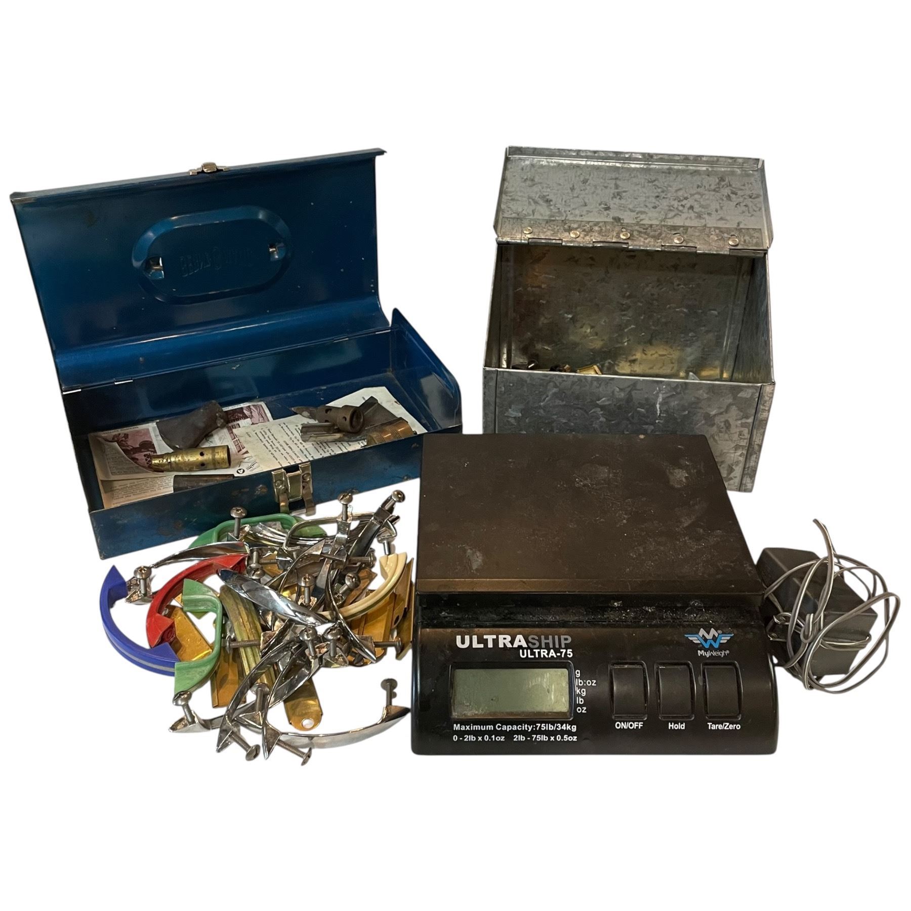 Group of Drawer Pulls, Small Boxes, Shipping Scale and Tools
