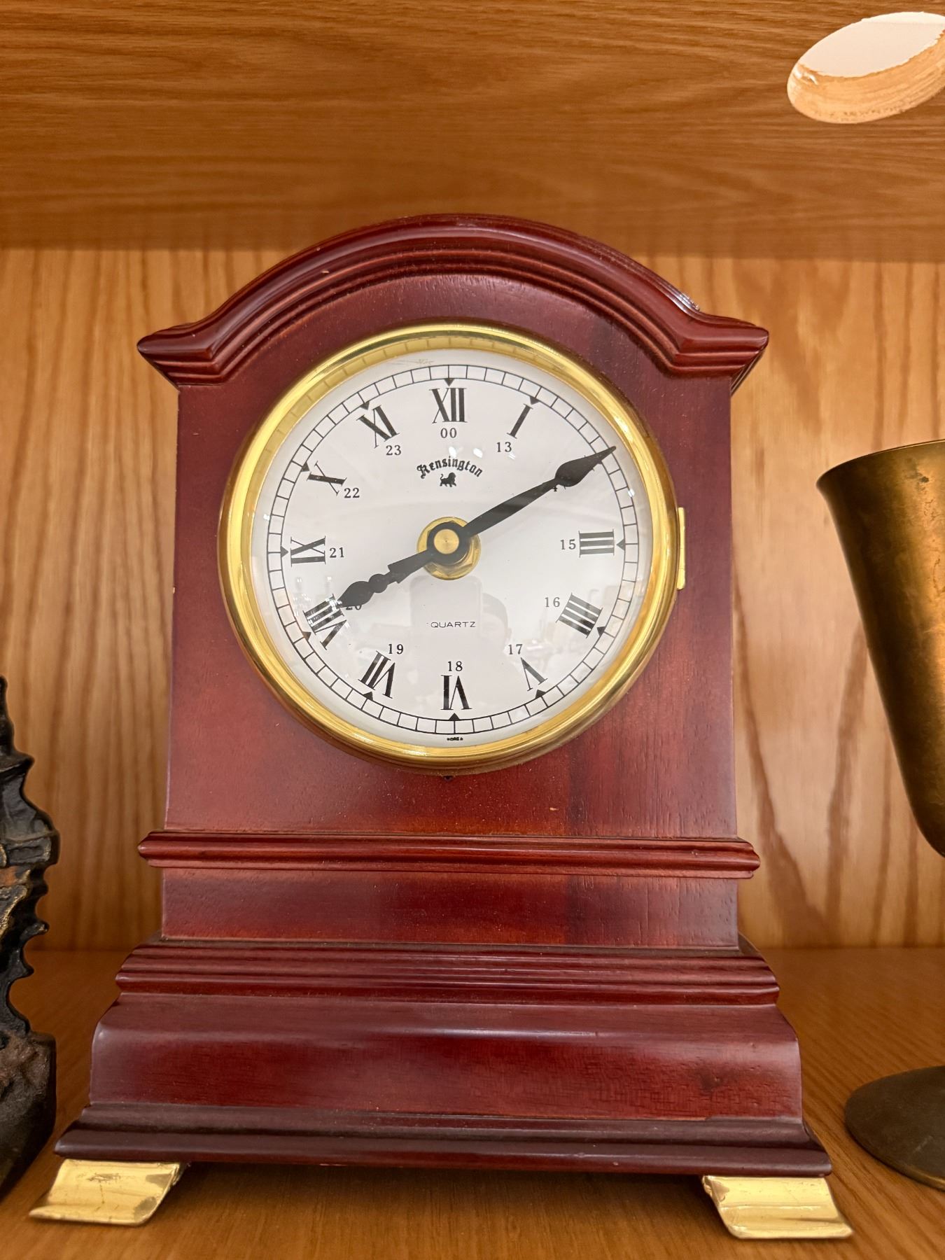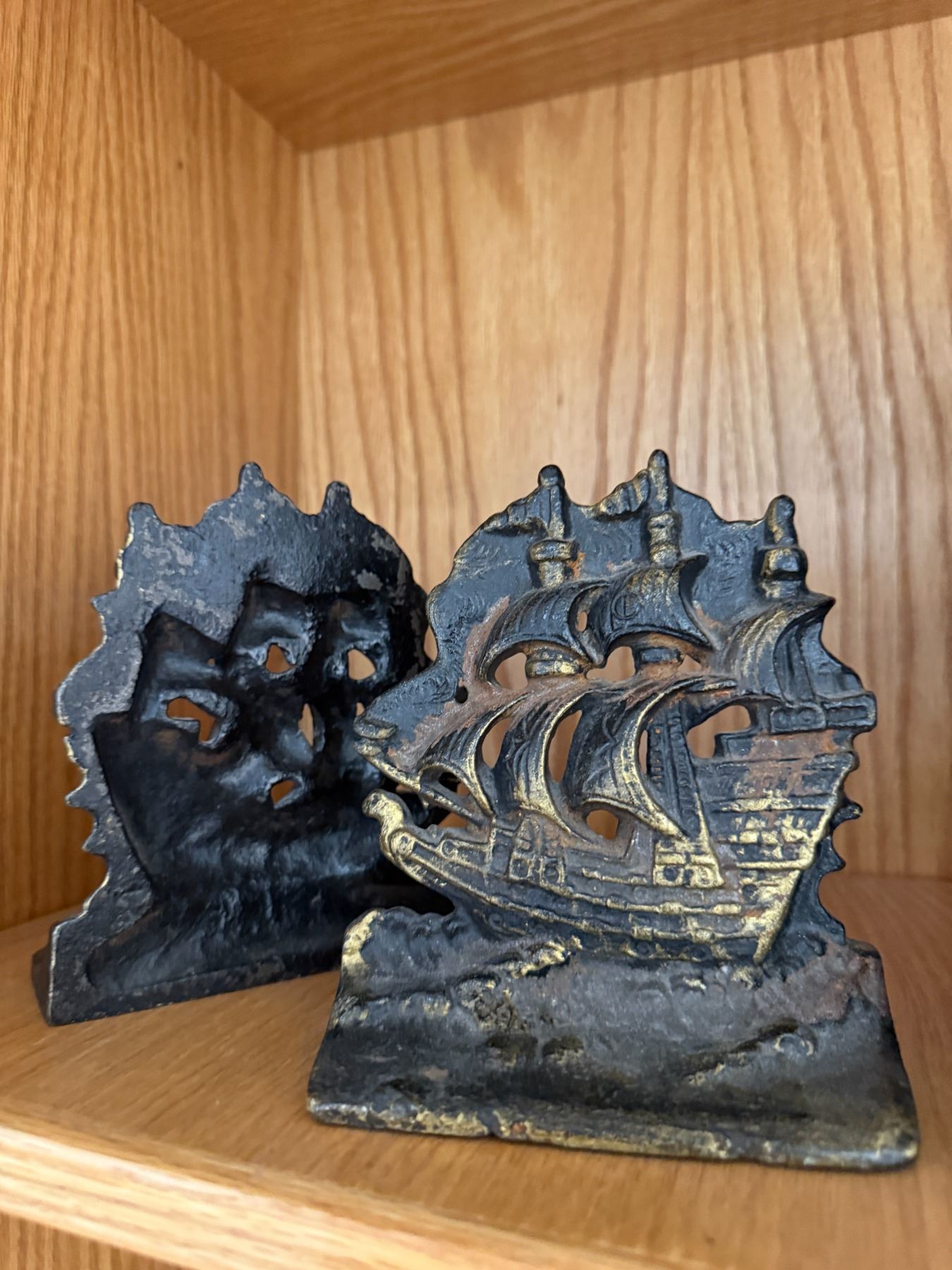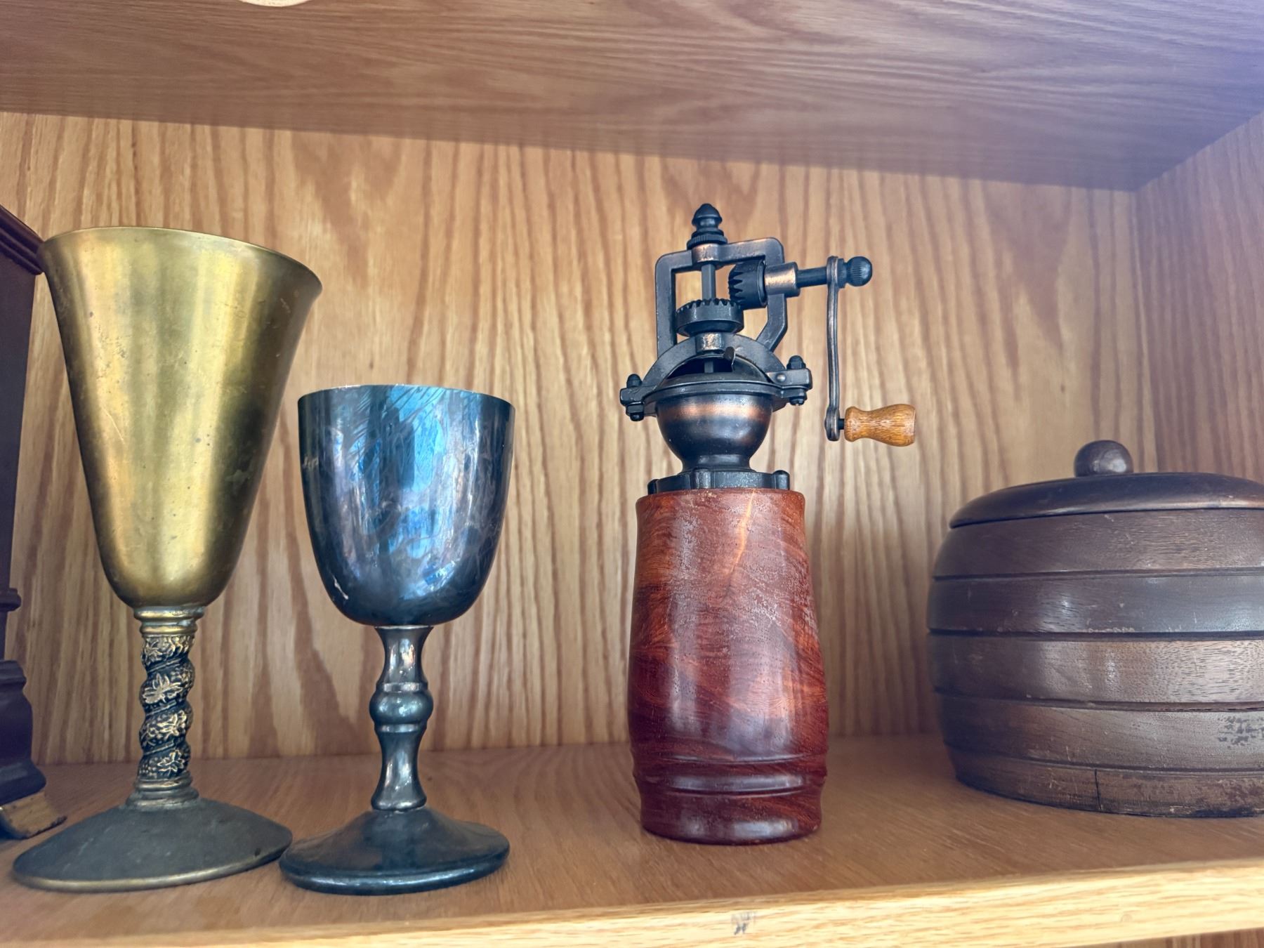 Group of : Mantle Clock, Goblets, Tobacco Jar, Grinder and Vintage Bookends
