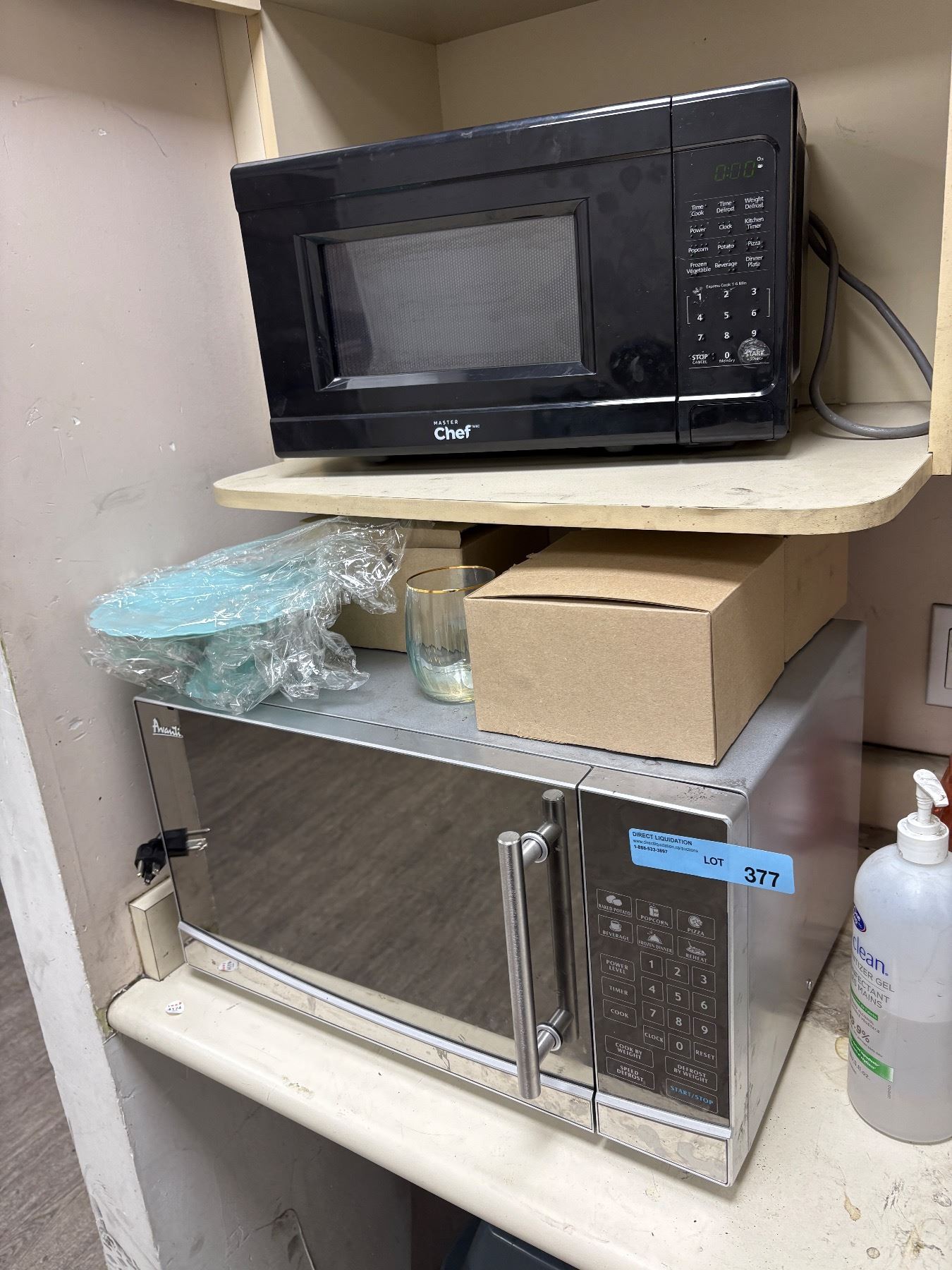Group of Misc - Avanti Microwave, Master Chef Microwave, Hand Sanitizer, Soap, Etc.