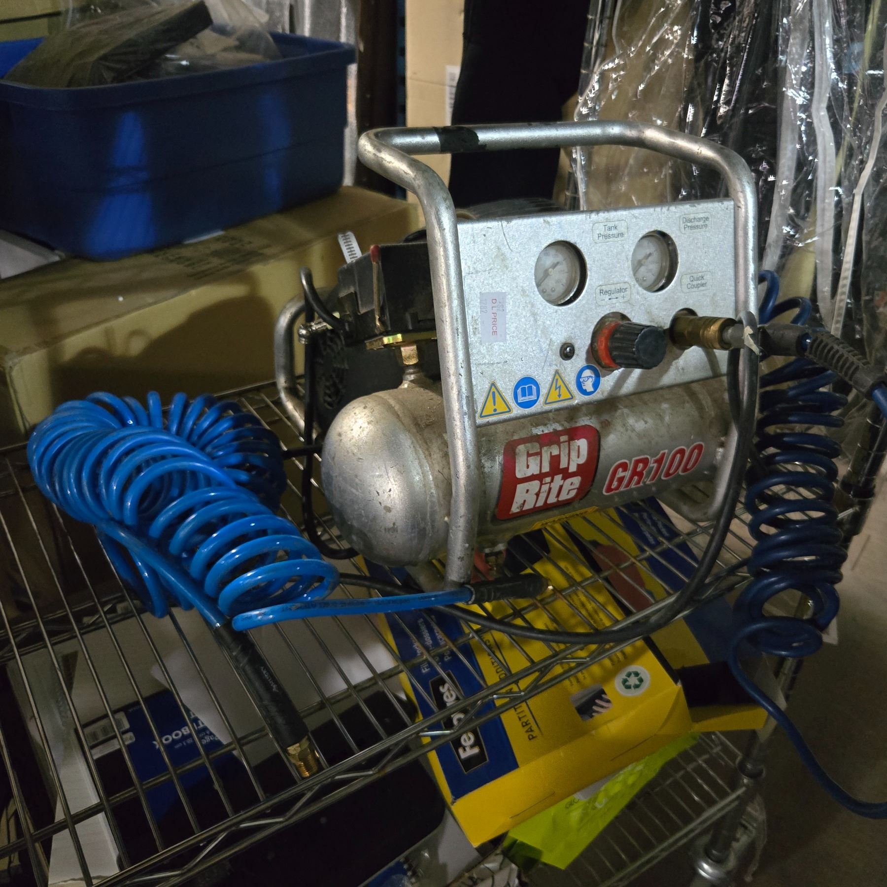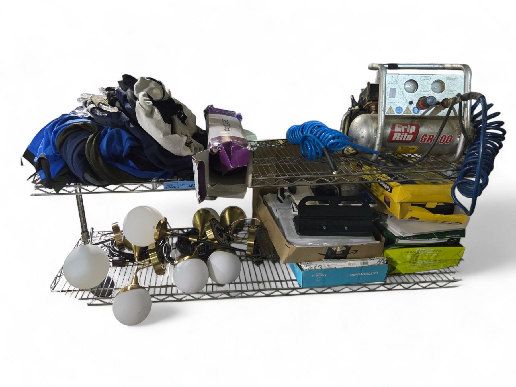Group of Misc - Brass Decor, Lighting, Clothing & Grip Rite Air Compressor