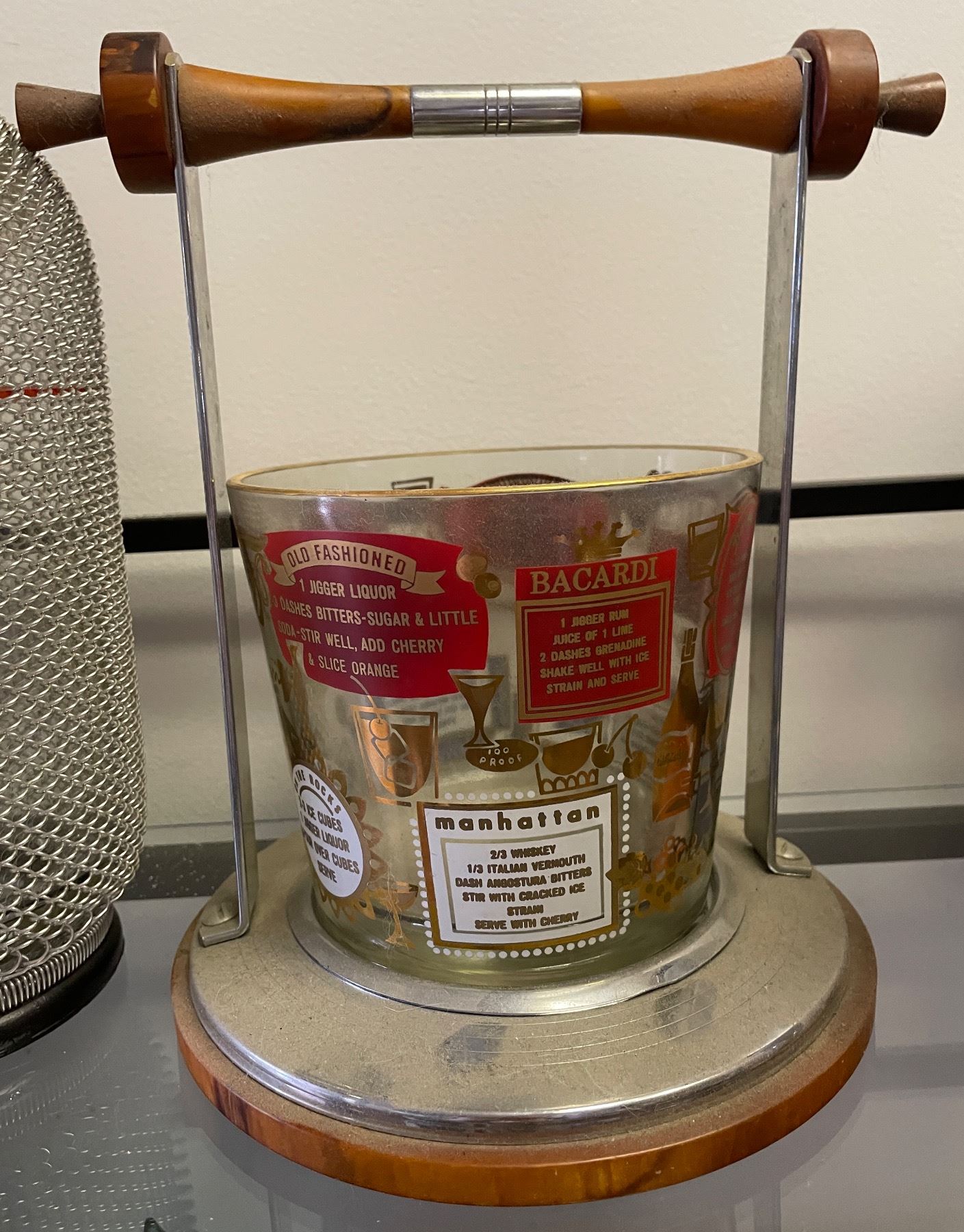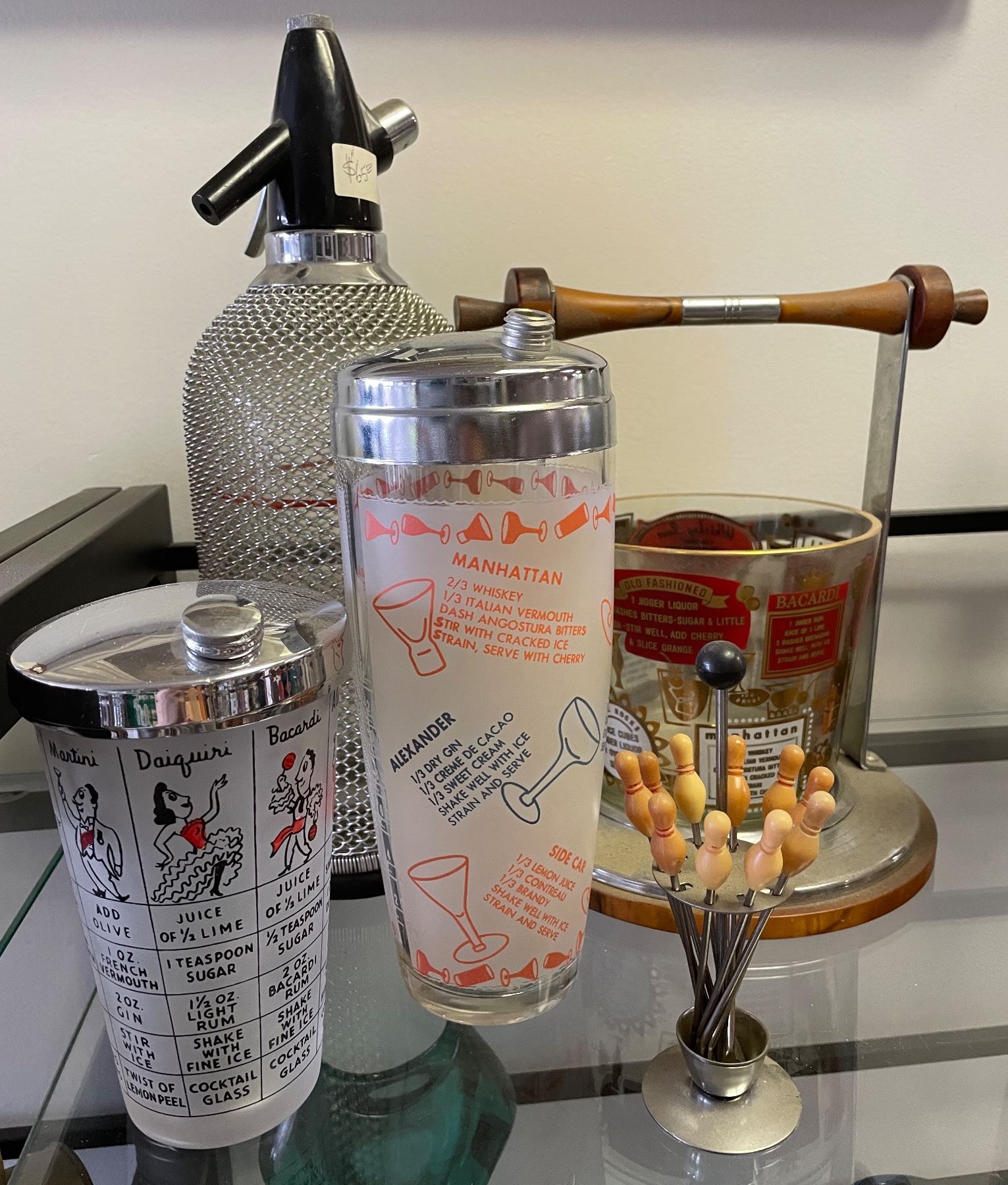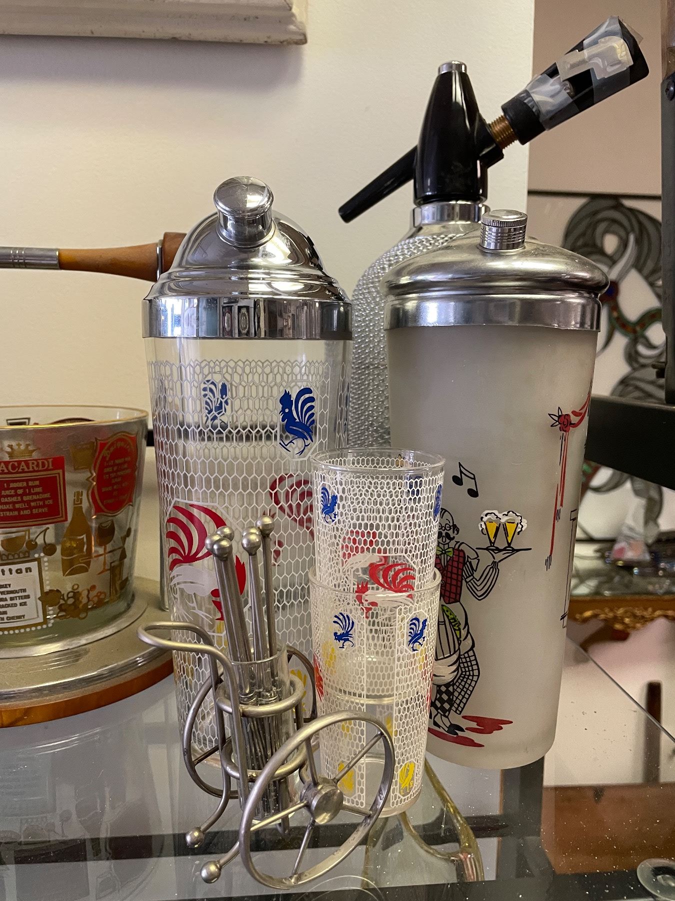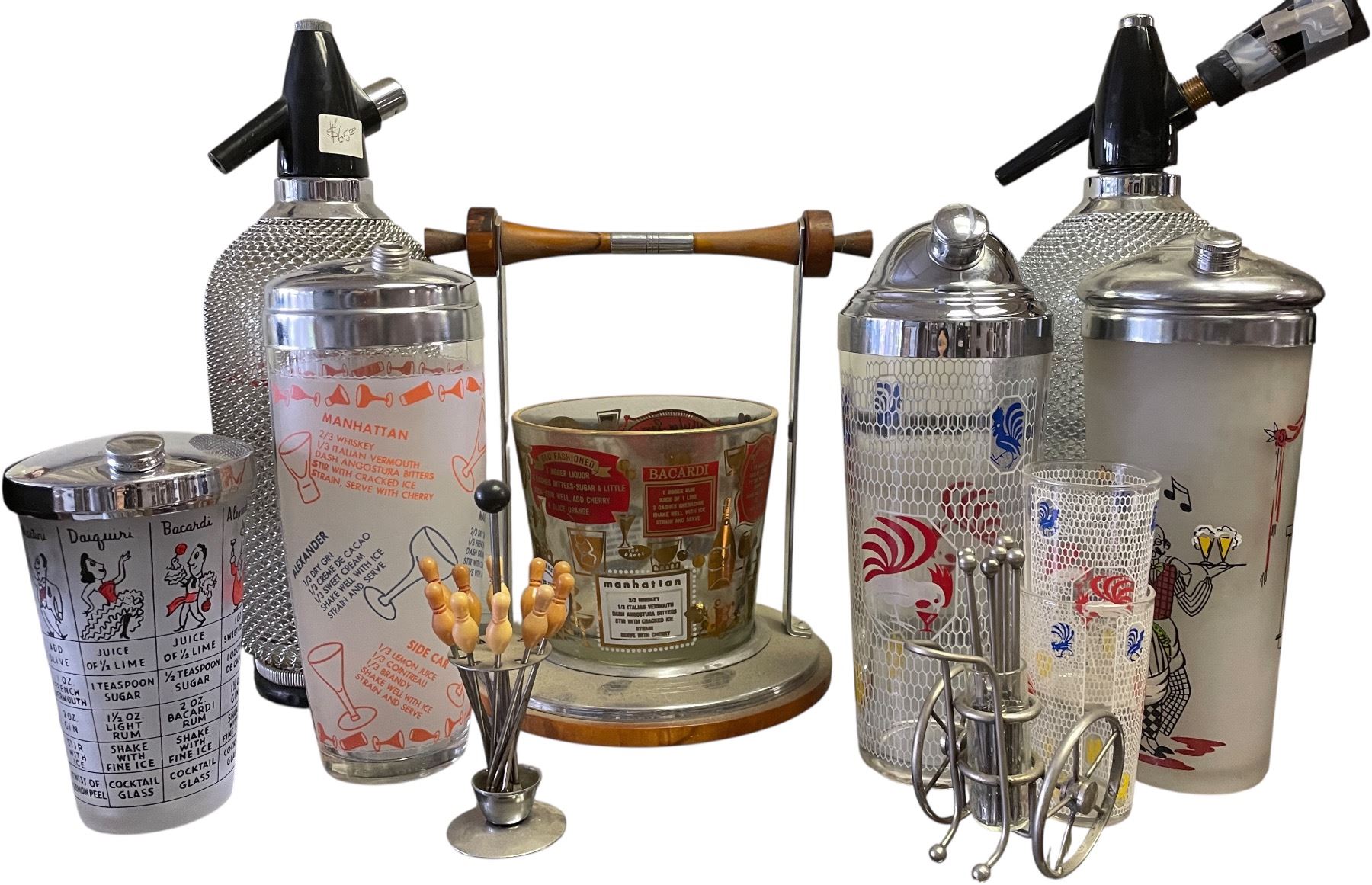 Group of Misc - Drink Mixer Glasses, Soda Siphon, Barware Set, Bowling Ball Mixers, Etc,