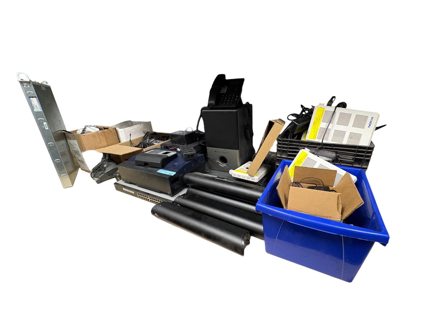 Group of Misc Electronics - TDA30 Hybrid IP-PBX, Battery Packs, Bass Speaker, Wifi Components, Headp
