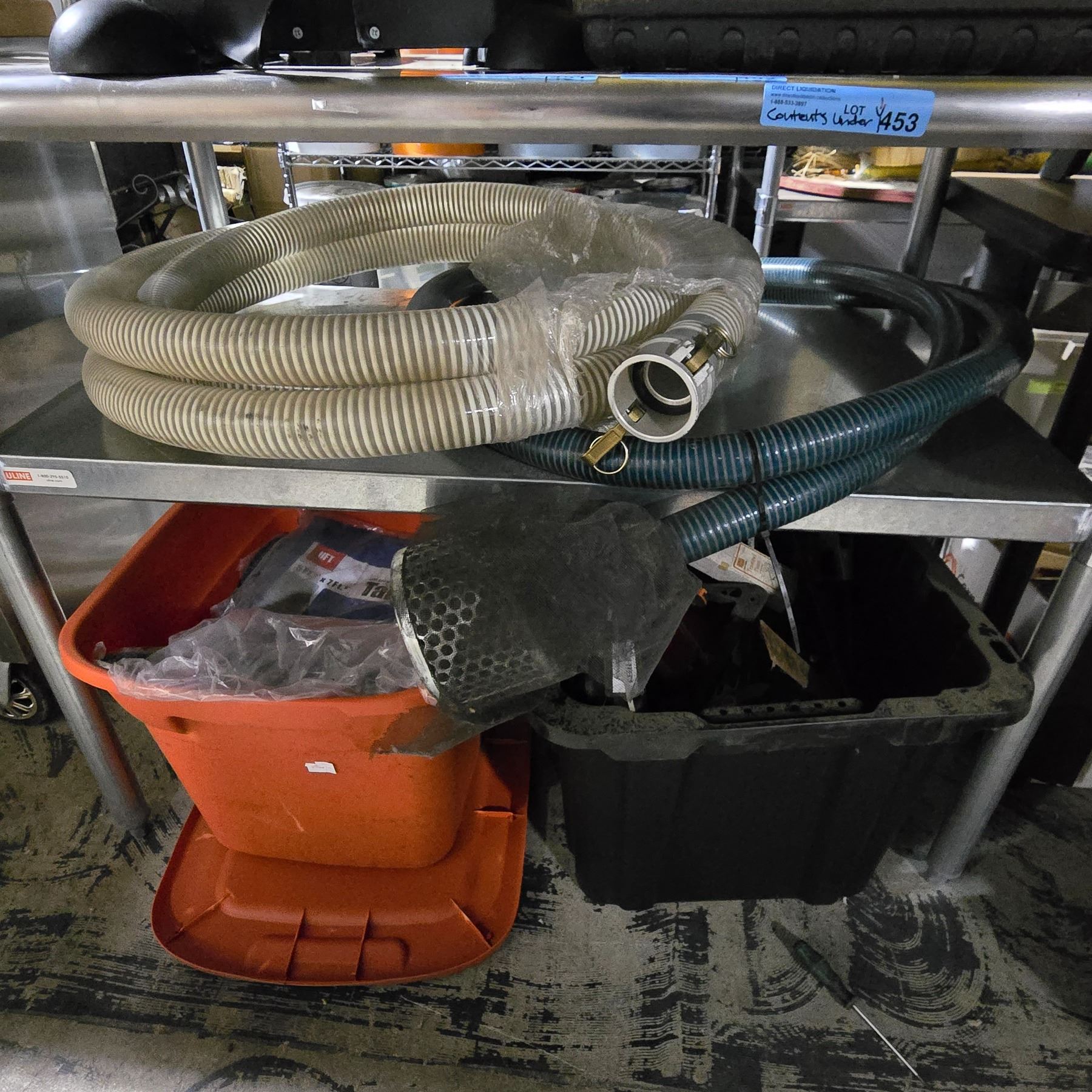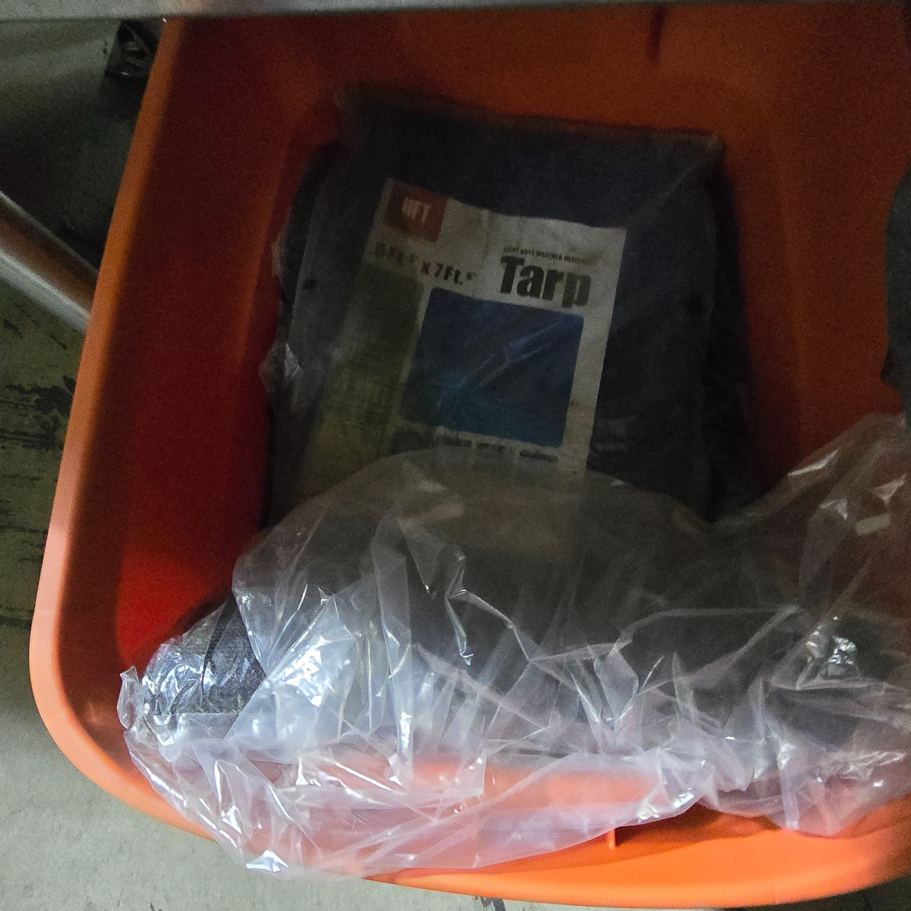 Group of Misc - House Vacuum Hose, Tarp, & Tote Full of Various Hardware Tools, Etc.