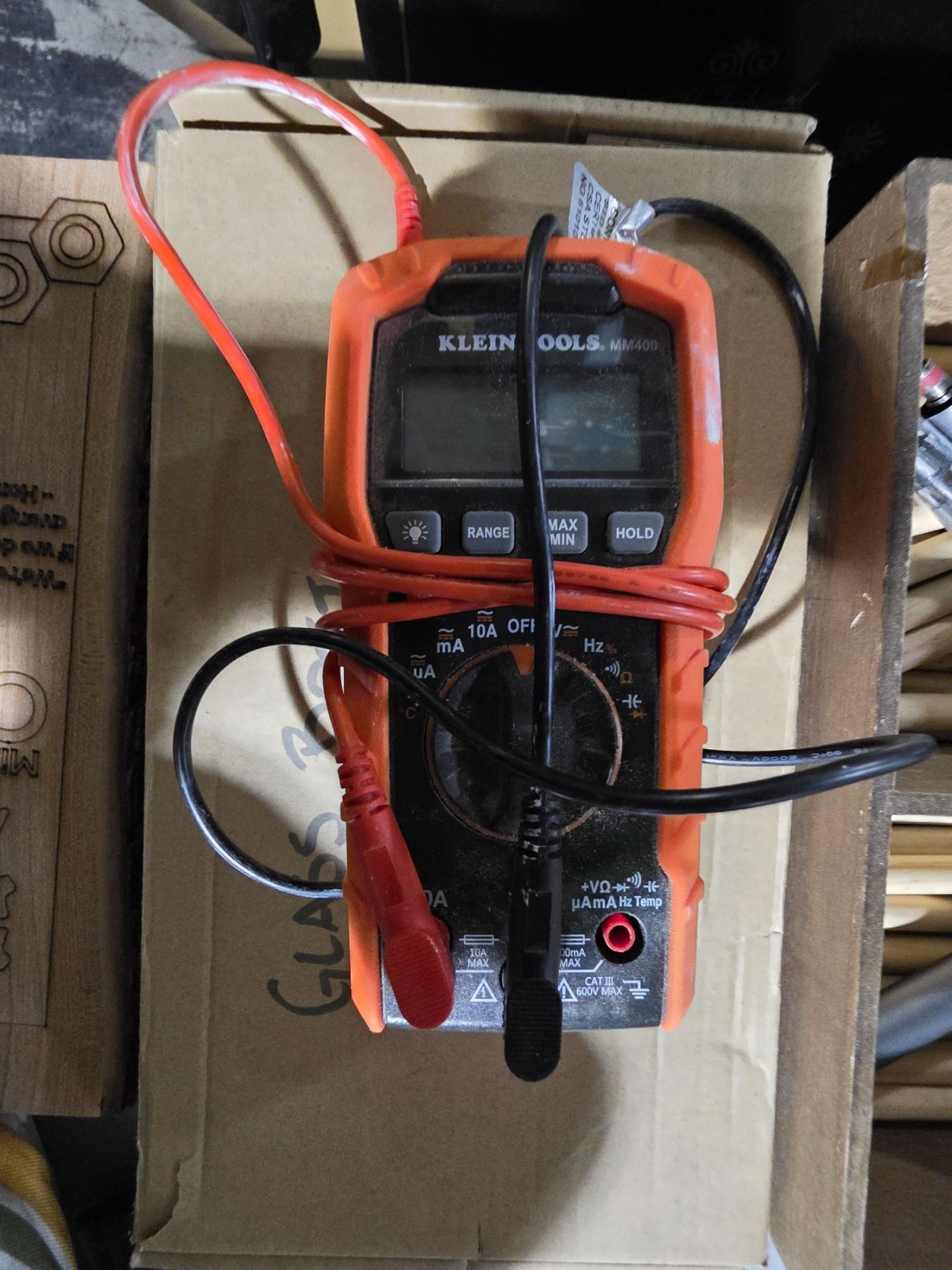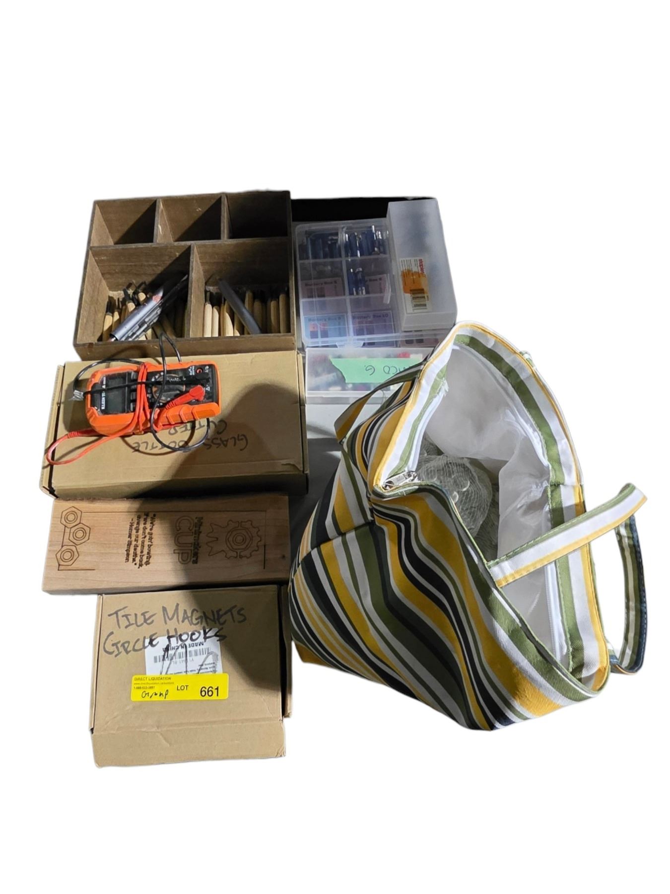 Group of Misc Makers - Tile Magnet Circle Hooks, Battery Box, Klein Tools MM400 Digital Multimeter w/Test Leads