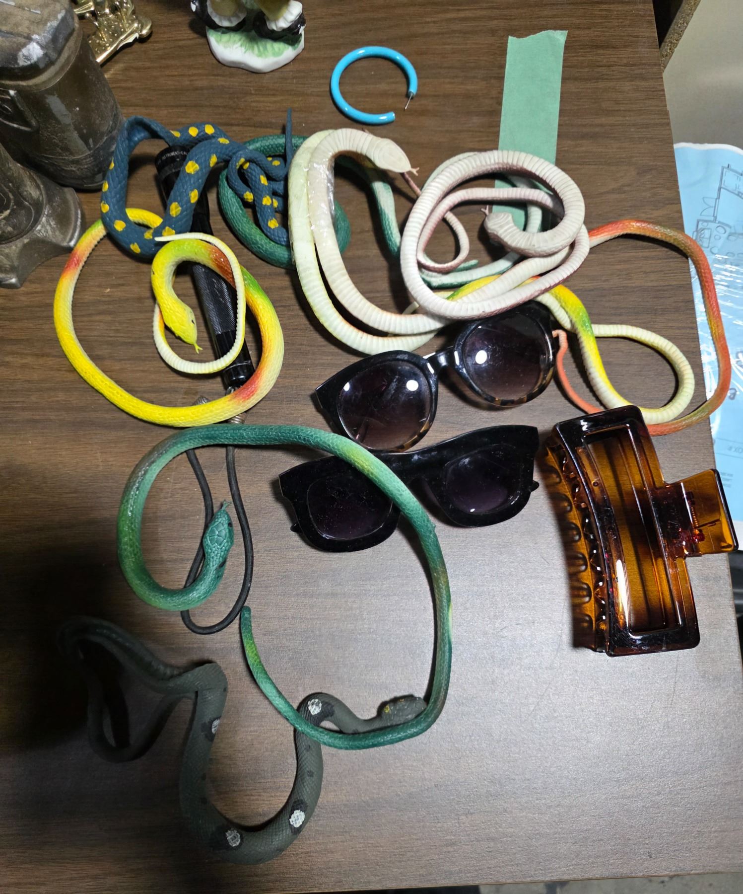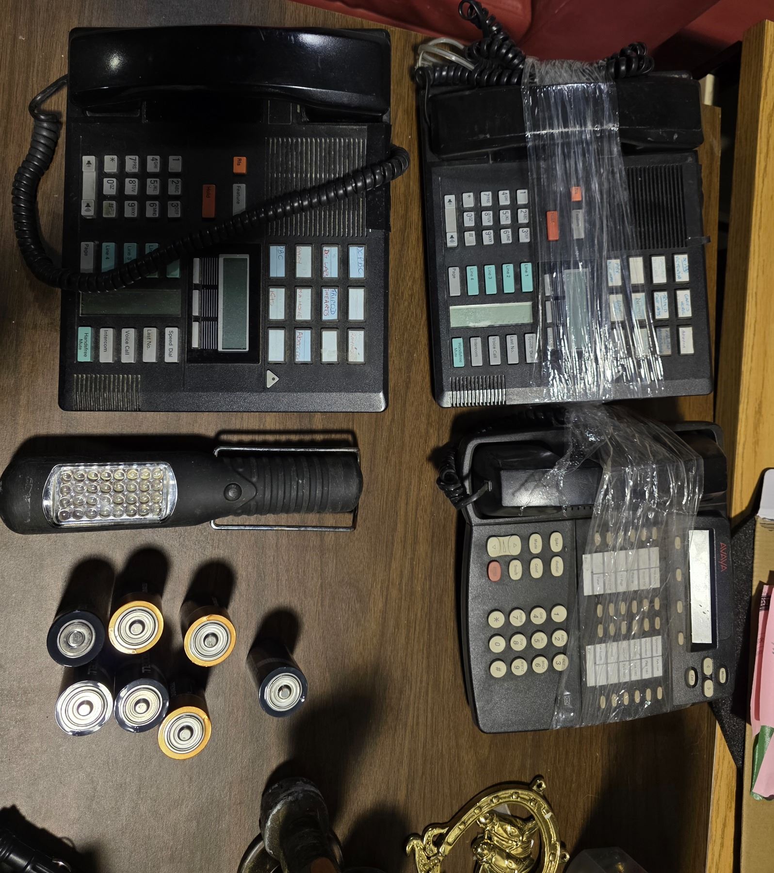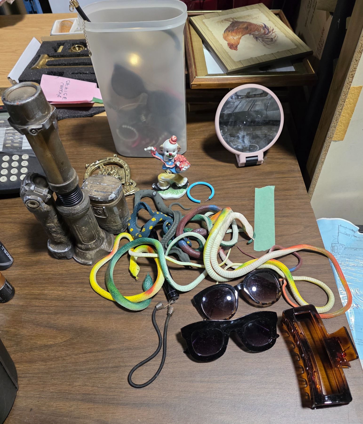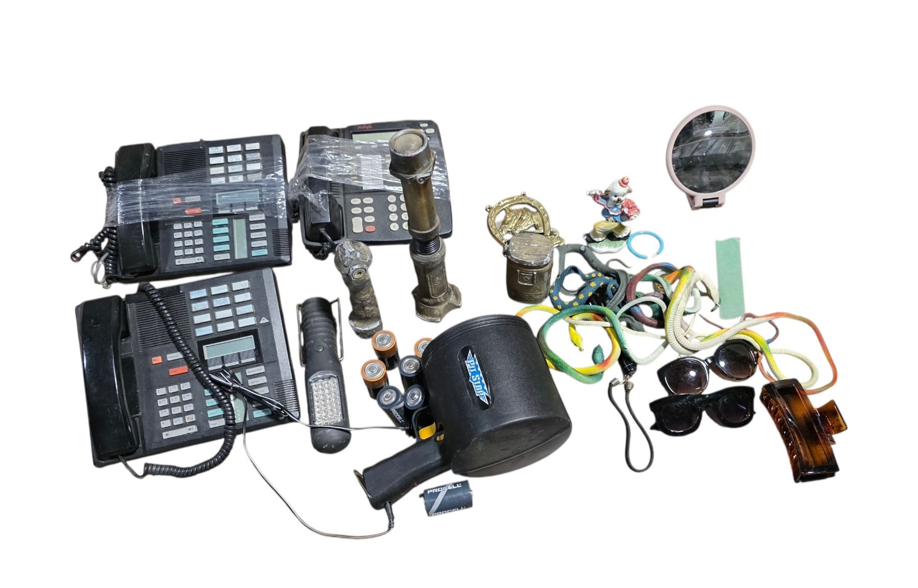 Group of Misc - Metal Frame/Wood Table Desk, Flashlight, Office Phone, Toys, Sunglasses, Props, Etc.