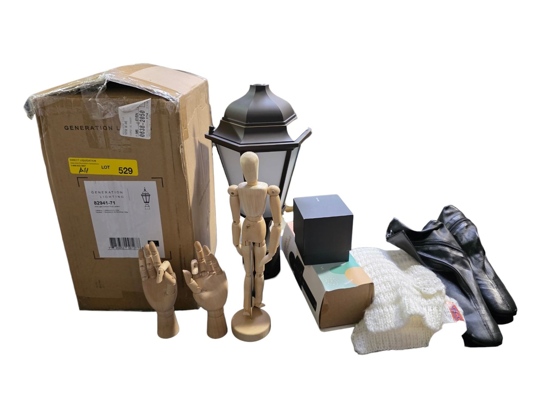 Group of Misc - Outdoor Post Lantern, Wood Decor Hands/Body, Lamp Post, Shoes, Karaoke Mic, Casio Watch Etc.