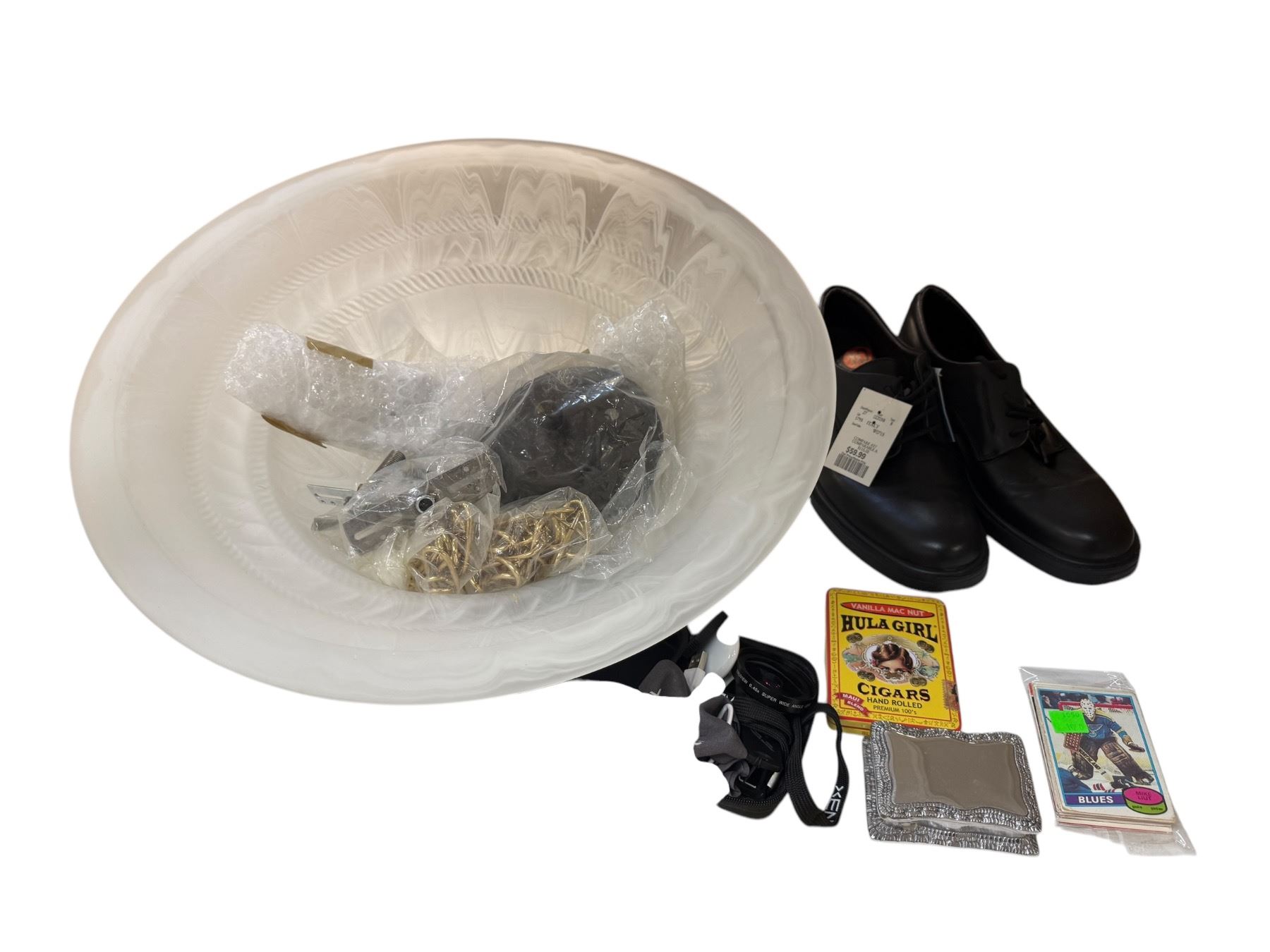 Group of Misc - Pair of New Formal Shoes Size 10, Glass Ceiling Light Fixture, External Phone Camera Lens, Etc.