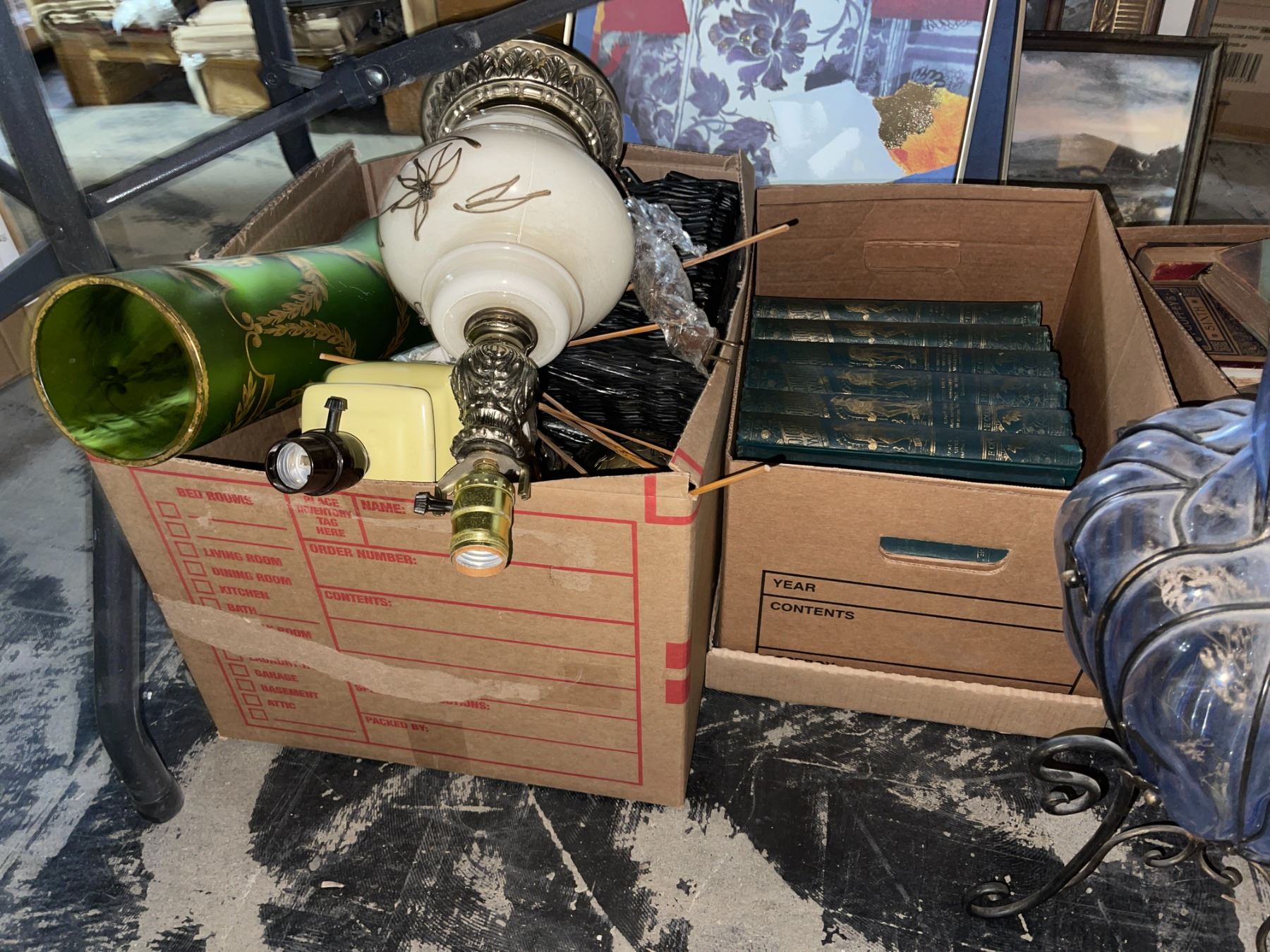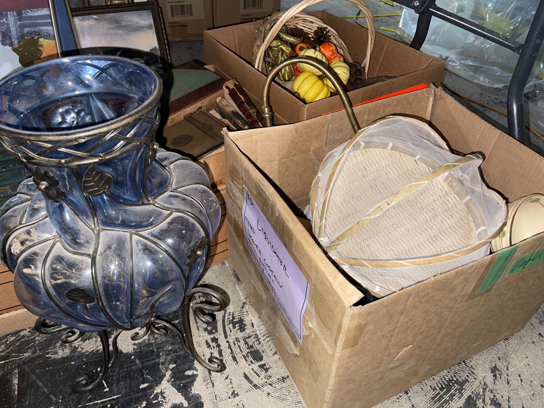 Group of Misc Set Dec - Books, Faux Fruit, Blue Swirl Glass Vase, and More