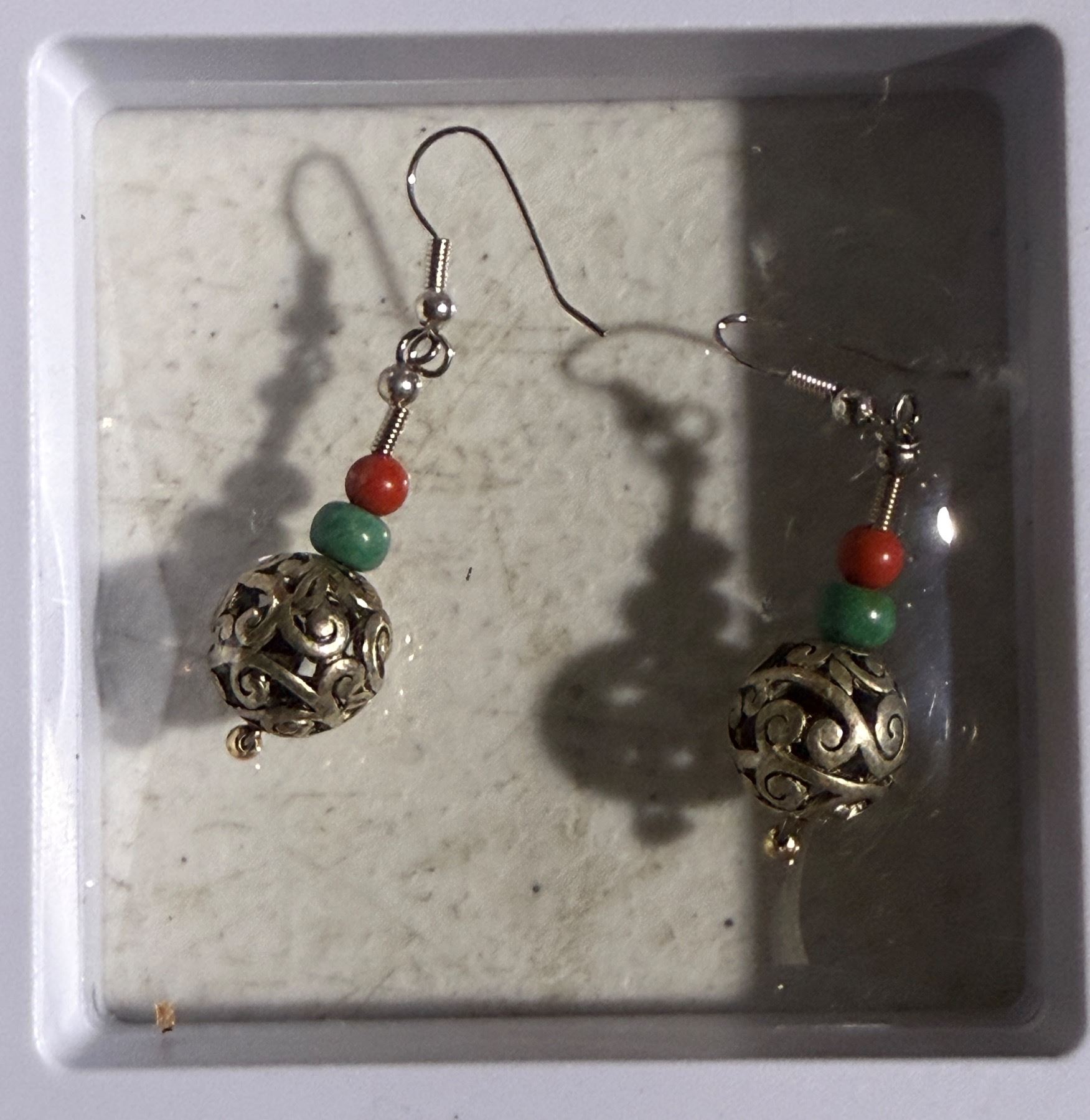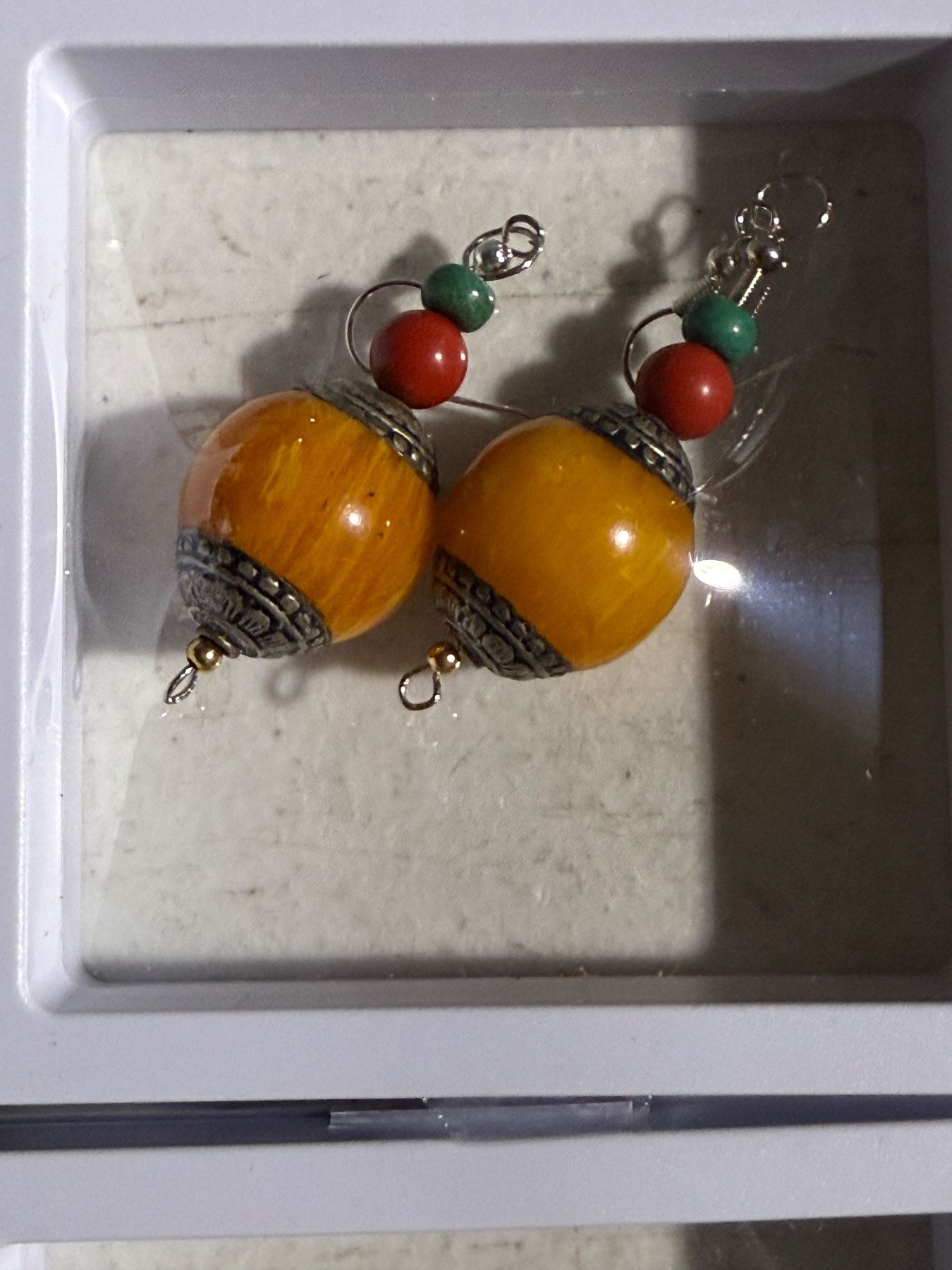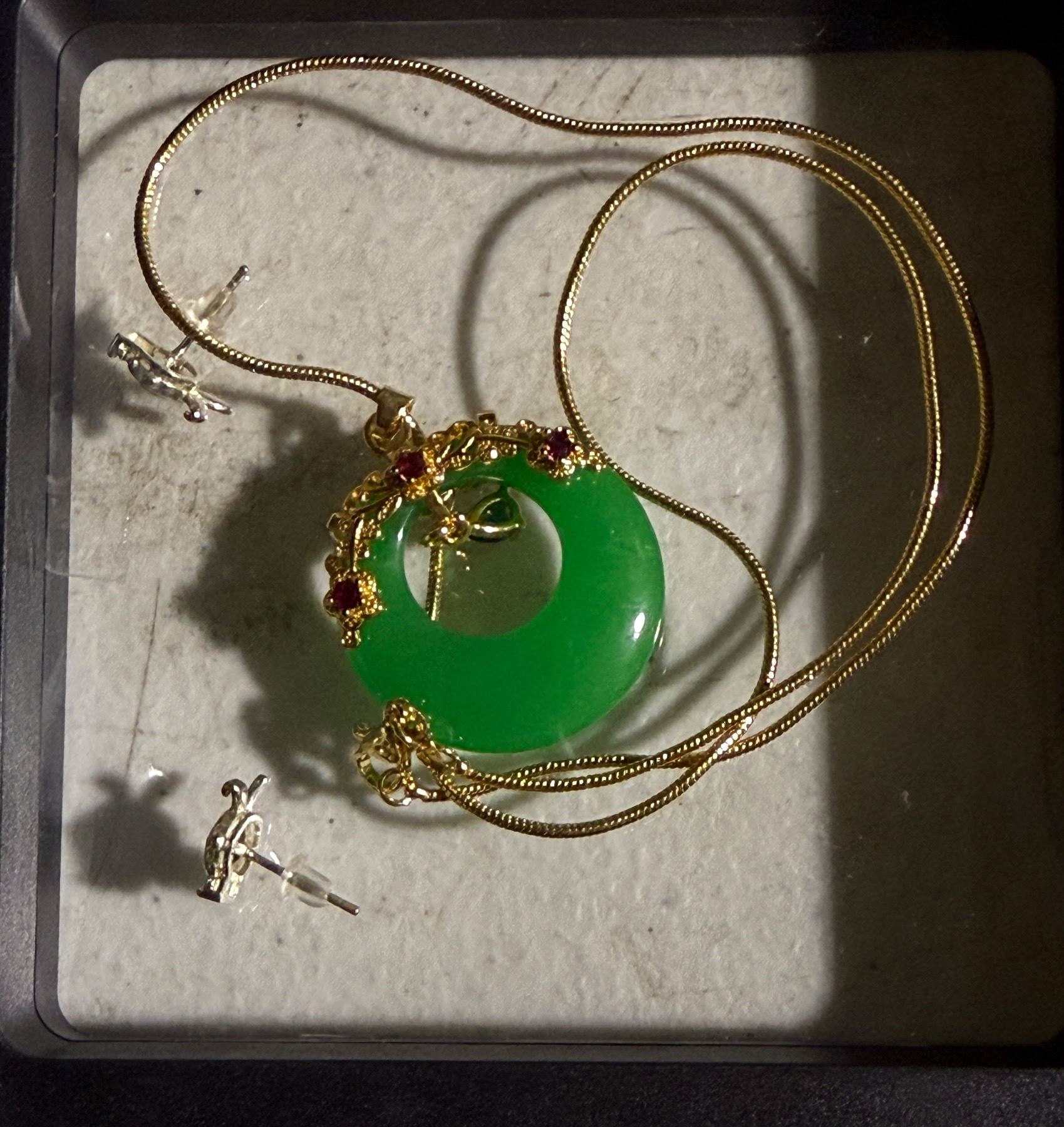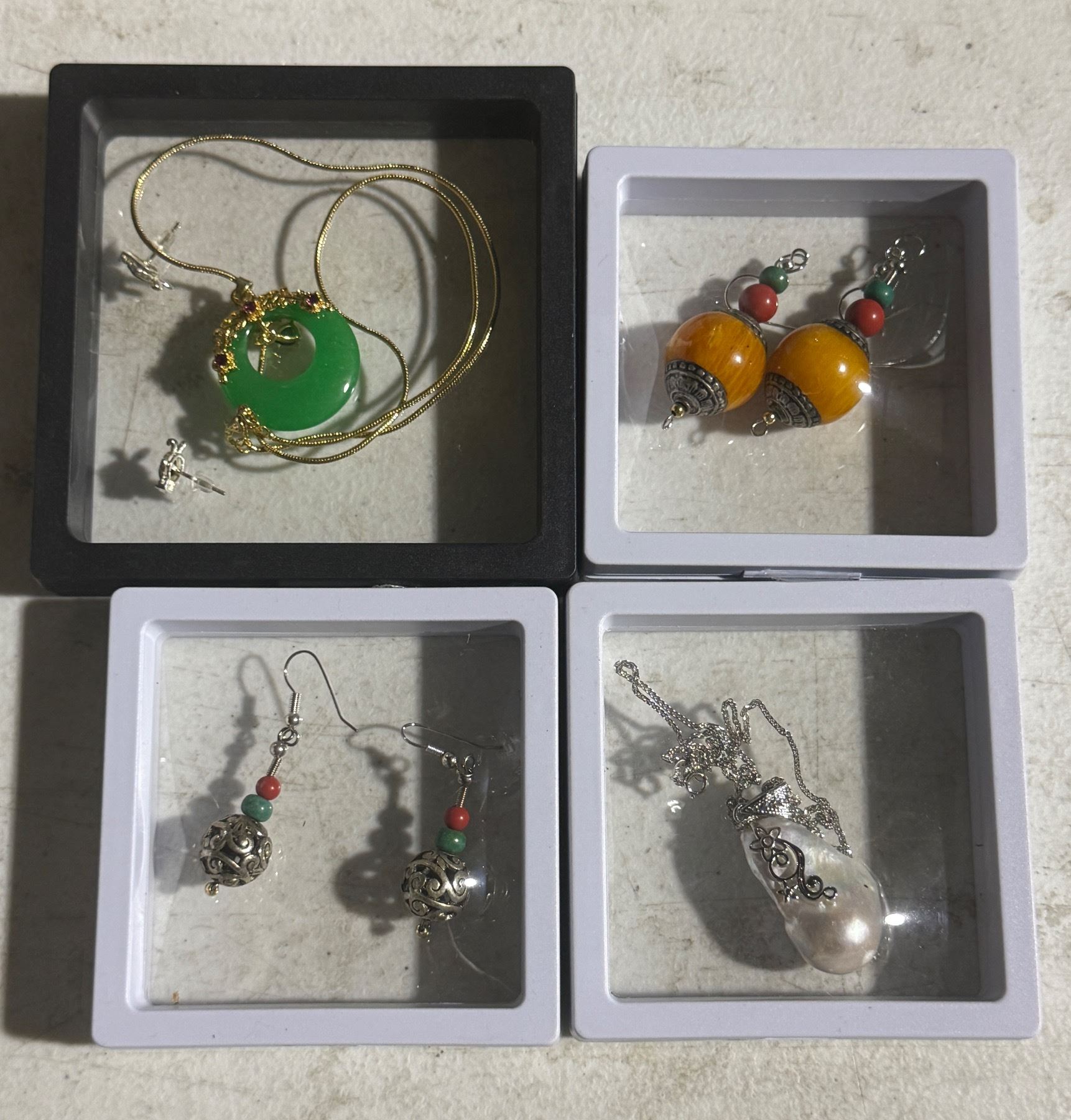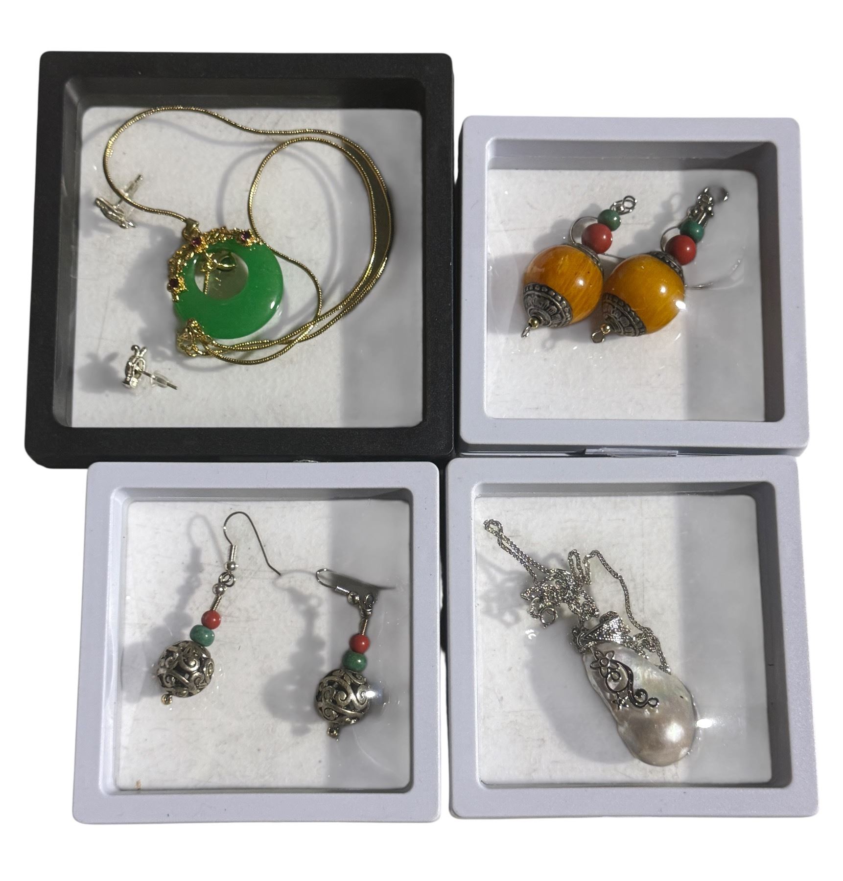 Group of Misc - Spinach Green Jadeite Pendant and Earrings, Pair of Openwork Sino-TIbetan Earrings, Japanese Sea Baroque Pearl Pendant, Pair of Sino-Tibetan Earrings