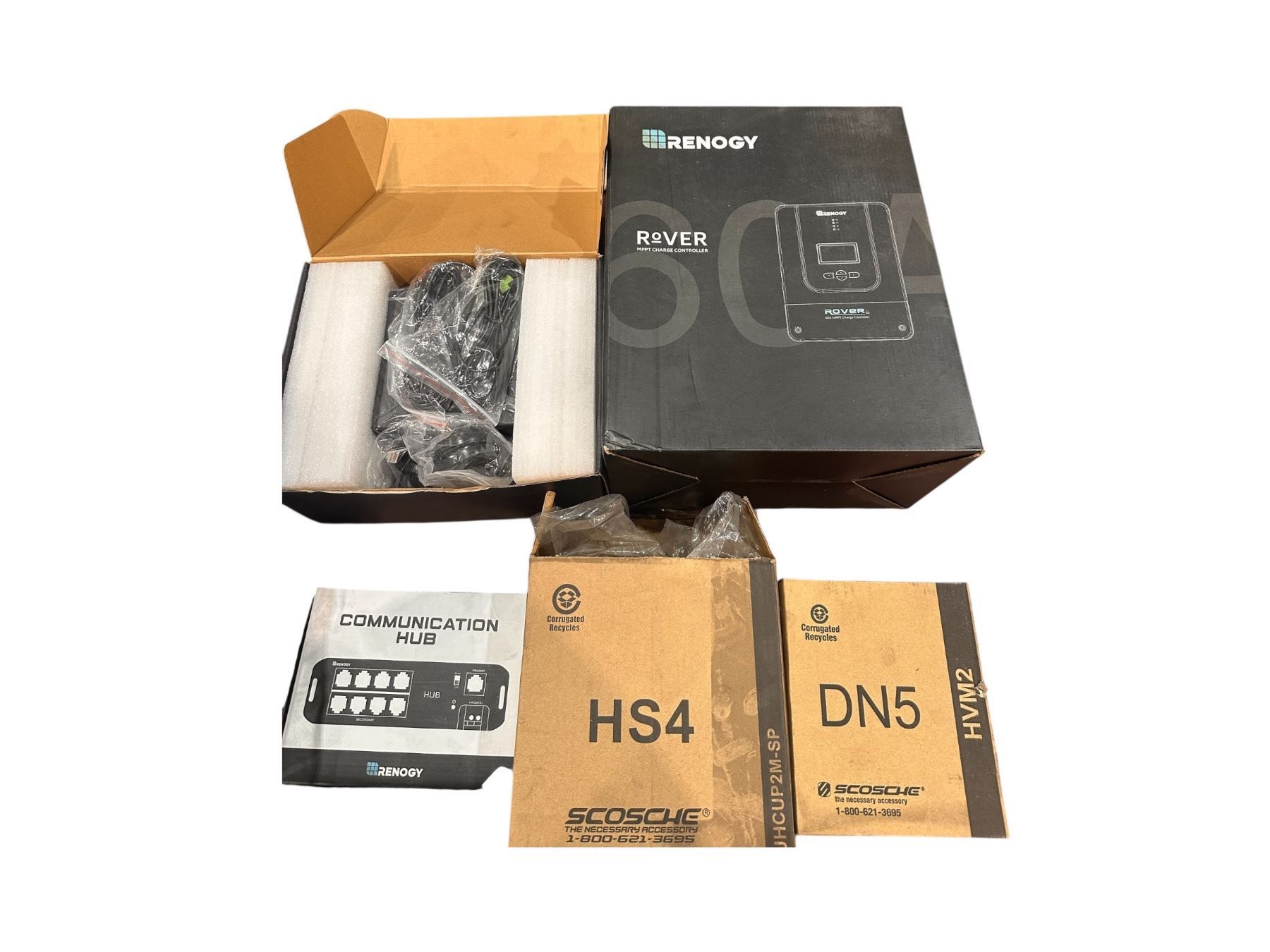 Group of Misc - Universal Phone Mount, Communication Hub, HS2 ATHS1A-4PKSP, Rover Charge Controller, Panel, Etc.