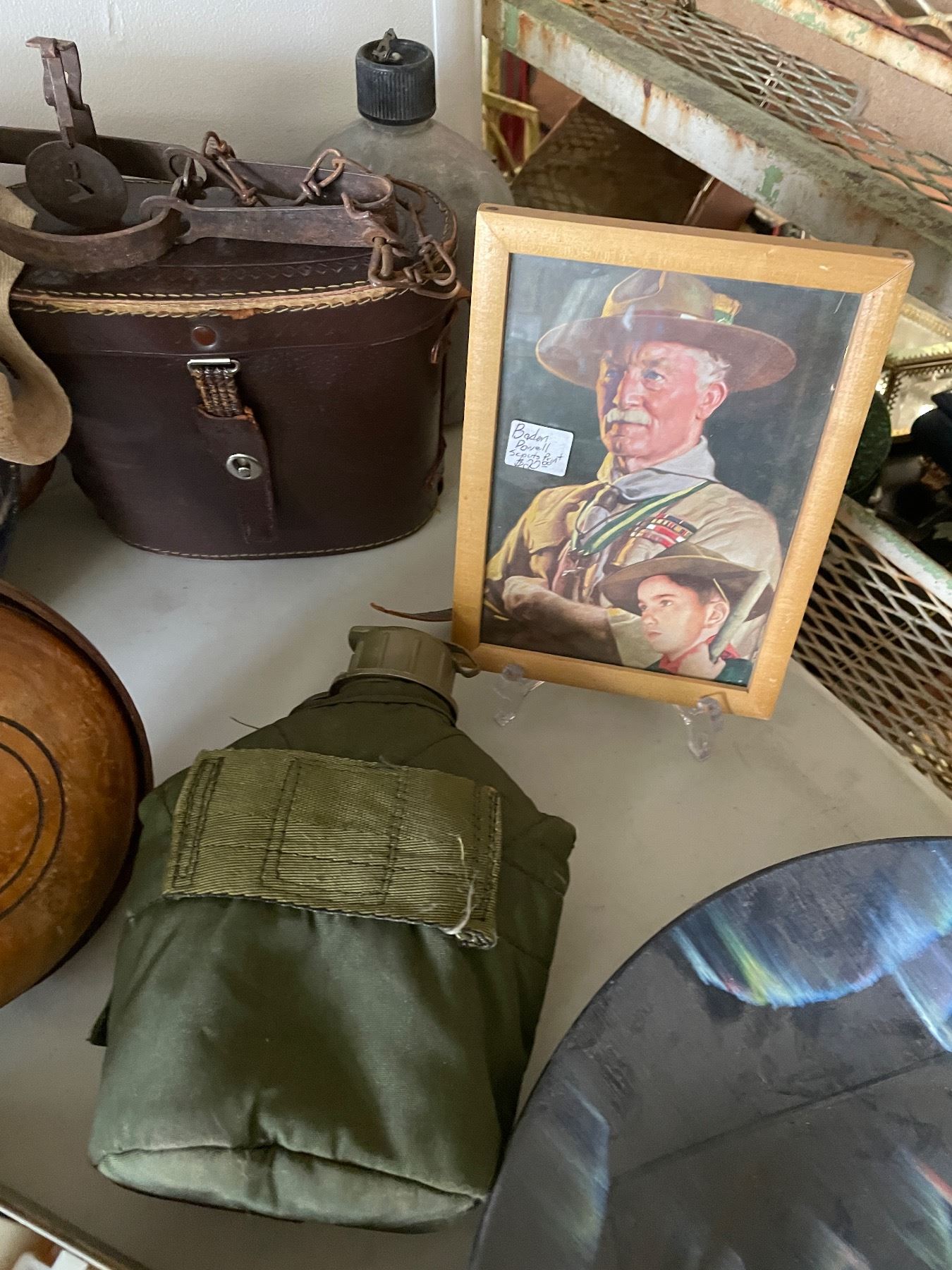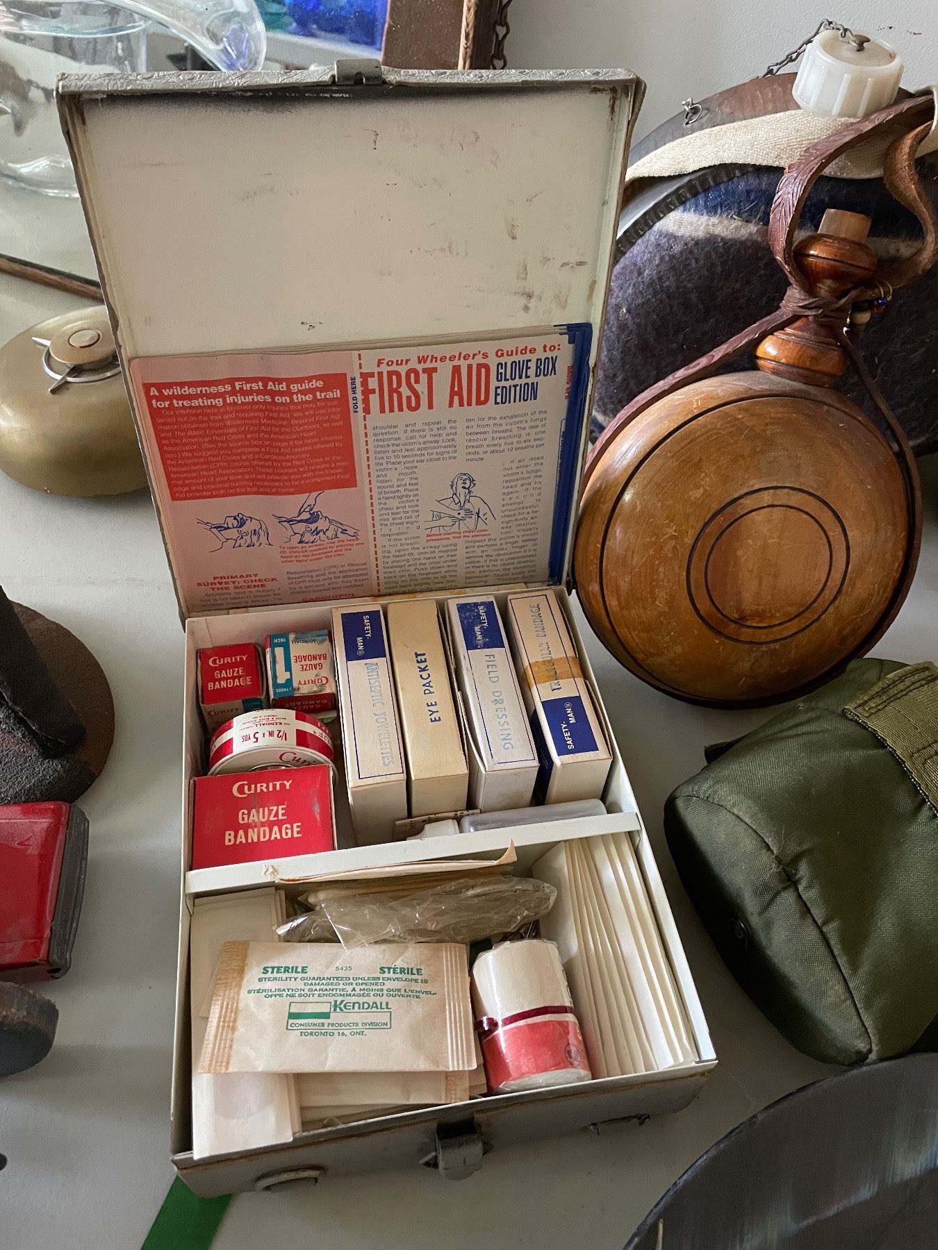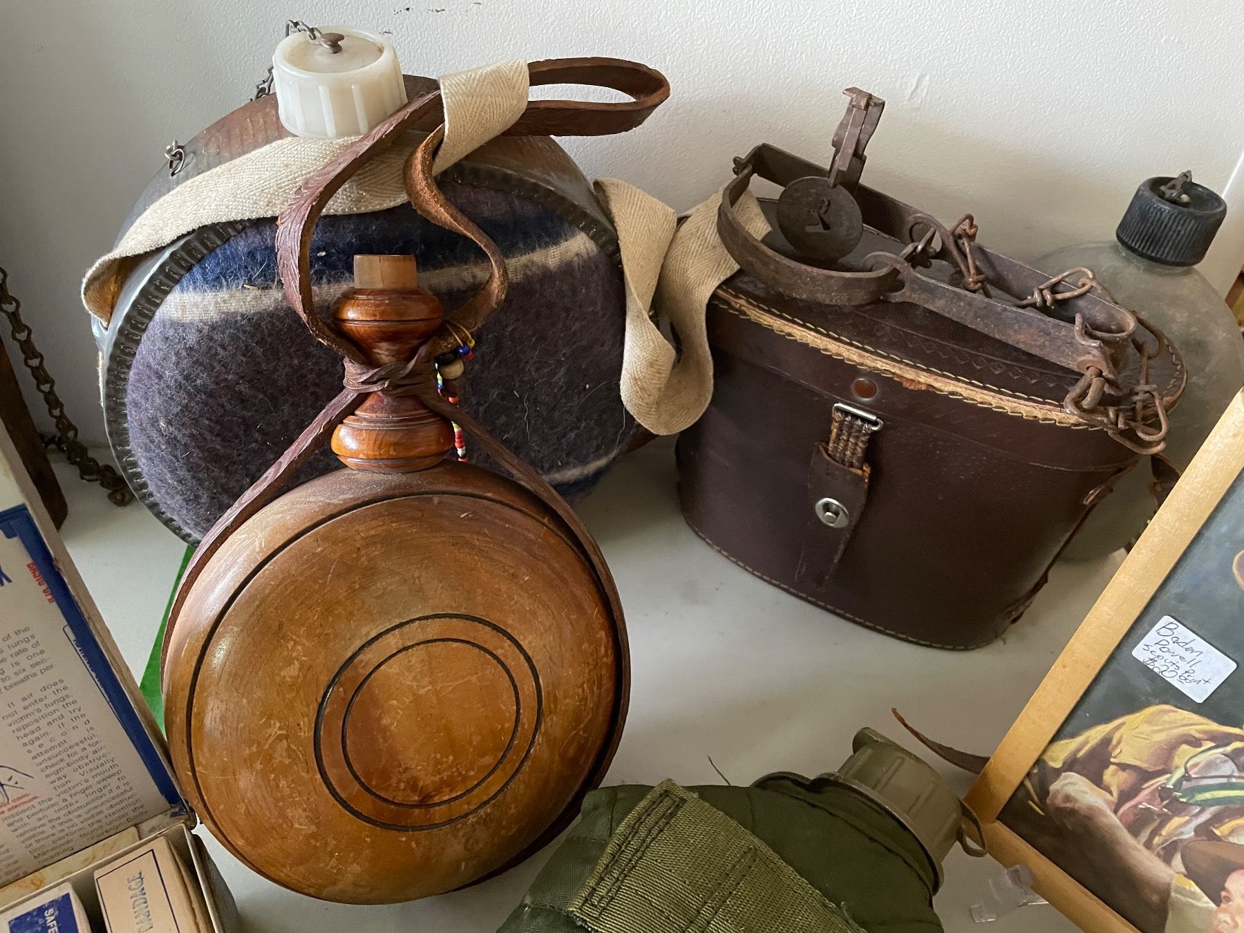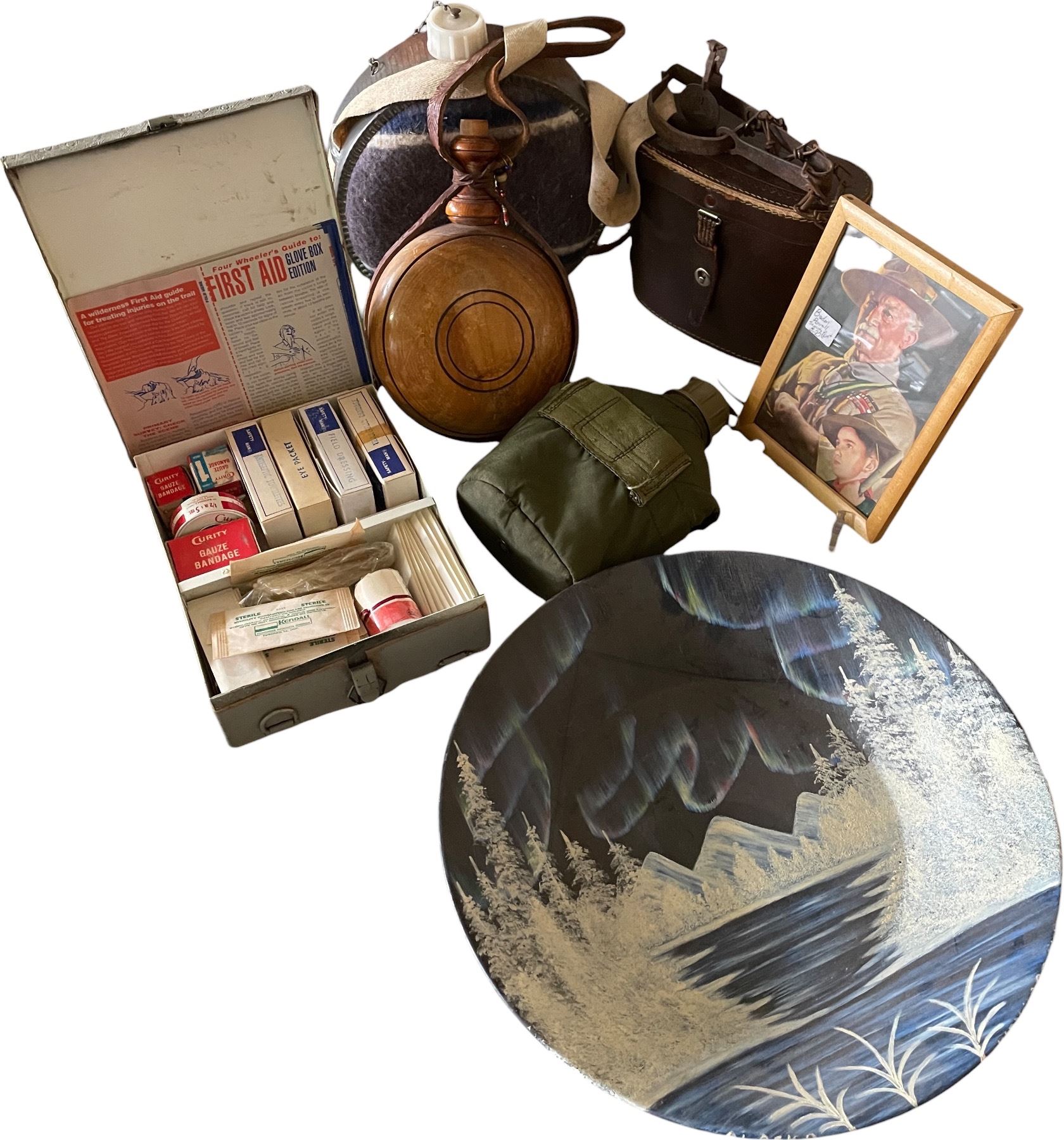 Group of Misc - Vintage First Aid Kit, Aurora Borealis Bowl, Water Canteen, Scout Picture, Etc.
