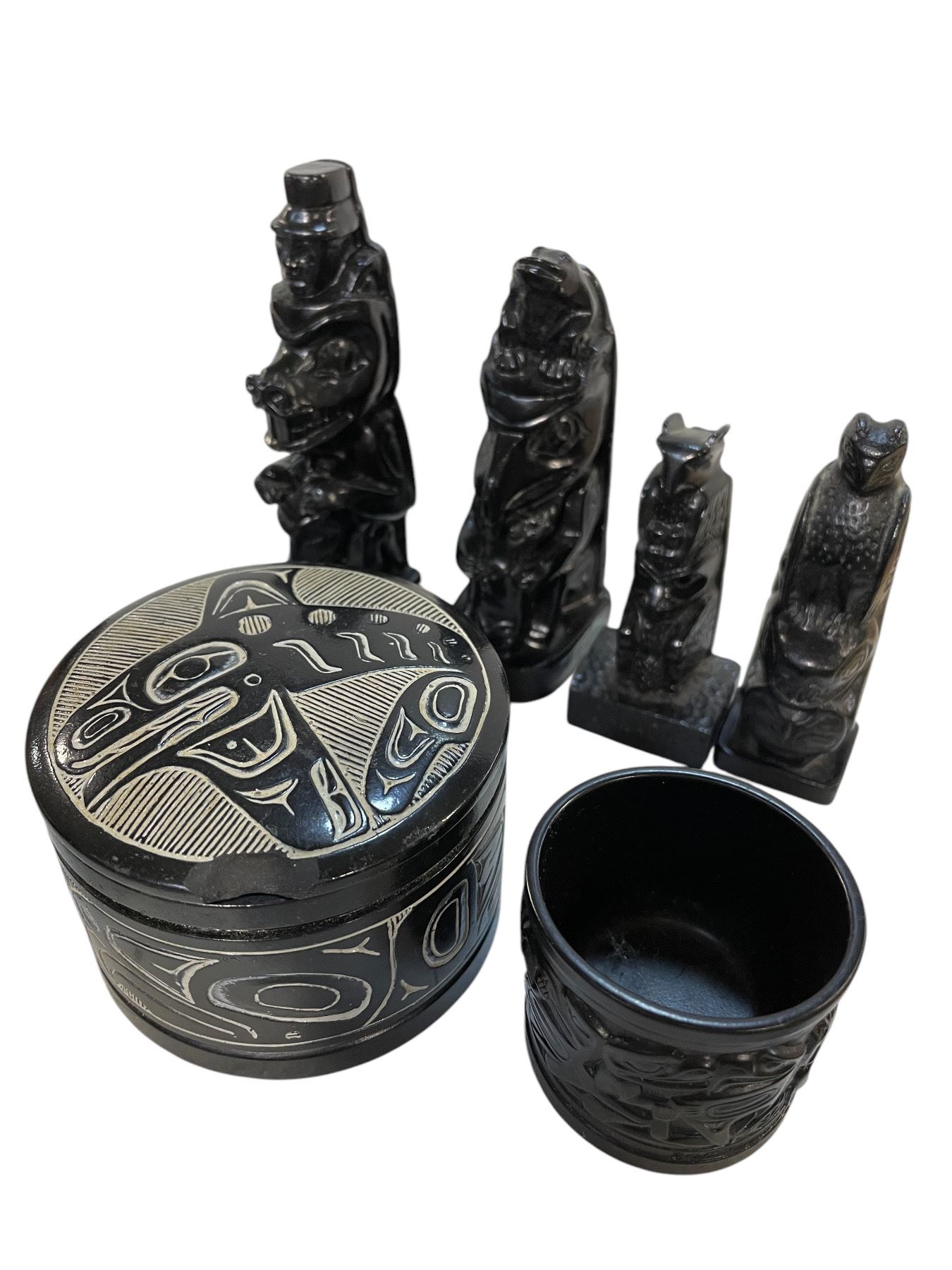 Group of Native Art assorted decorative items - includes 4 Blackware Style Totems Pole/ 1 handcrafted 1970's Boma Orca & Eagle Lidded Trinket Box