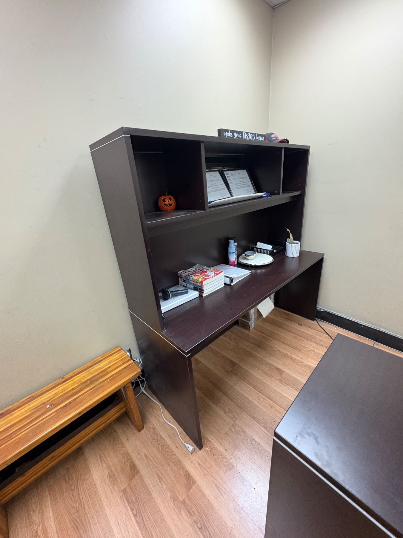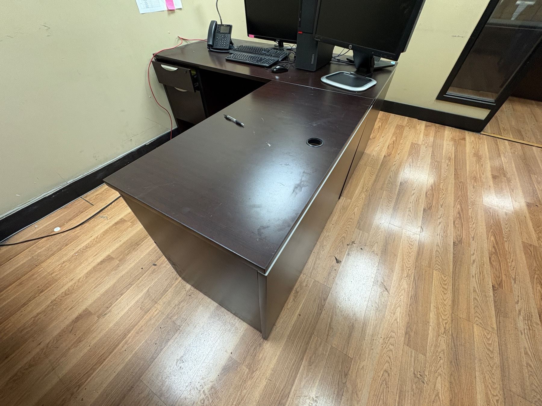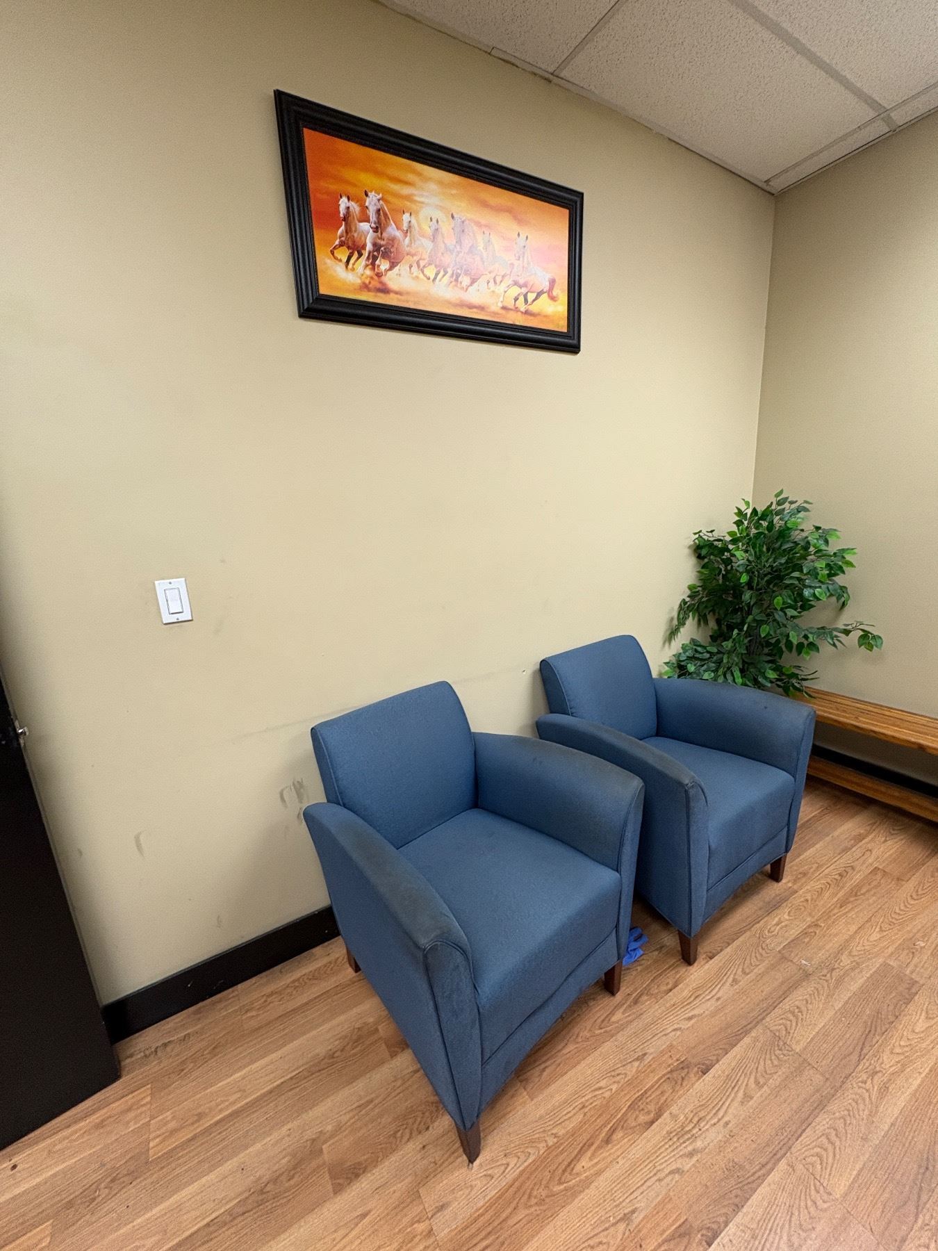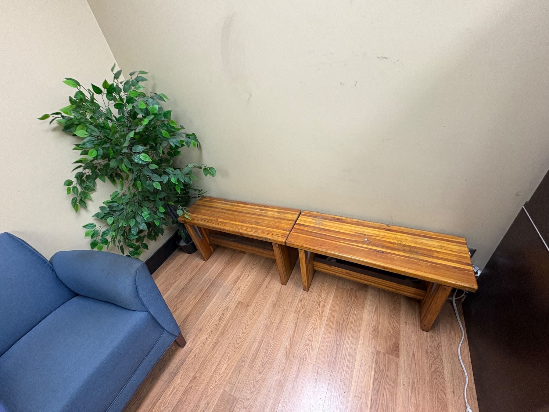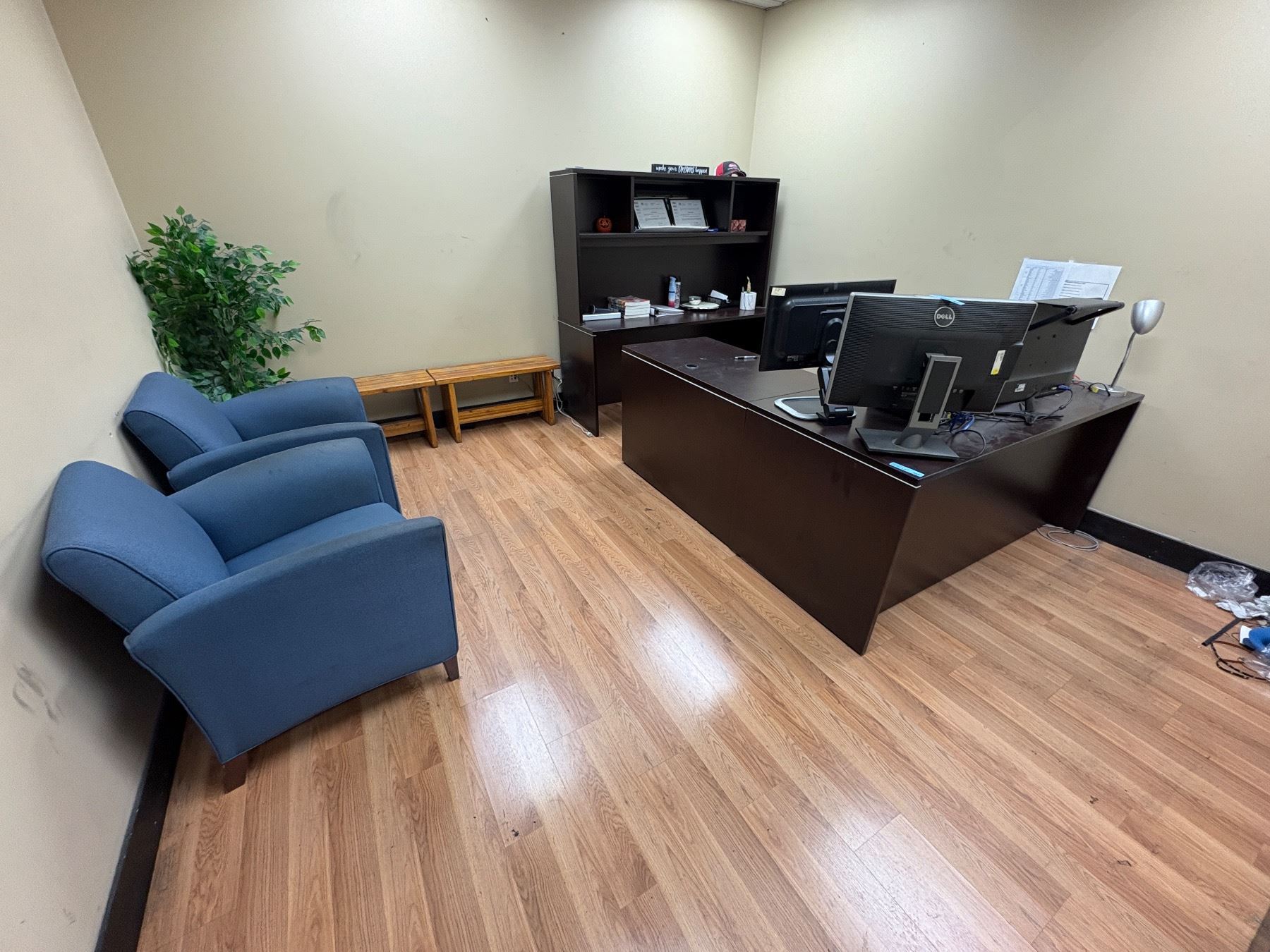 Group of Office Desk, Office Cabinet, 2x Blue Chairs & Faux Plant (Electronics Not Included)