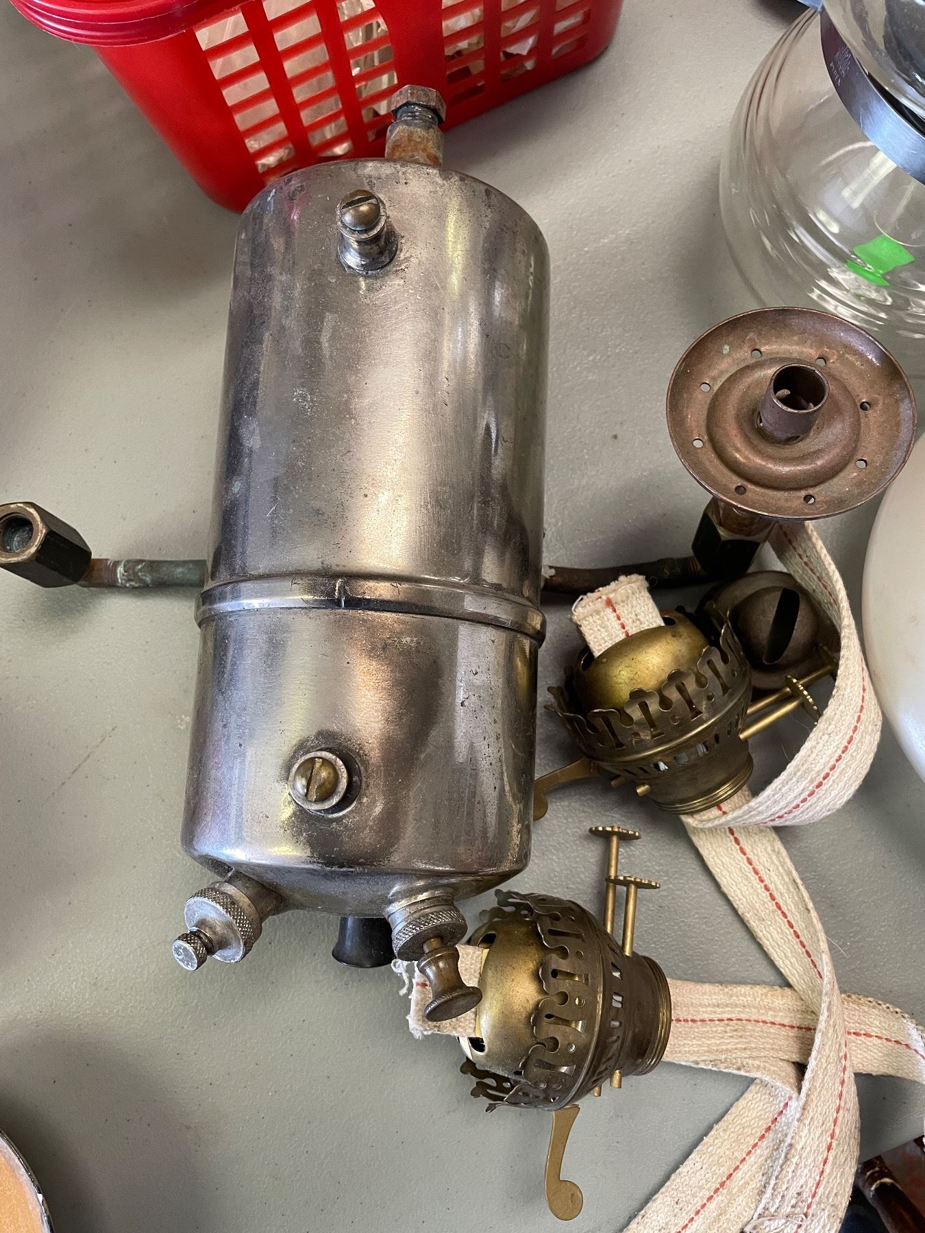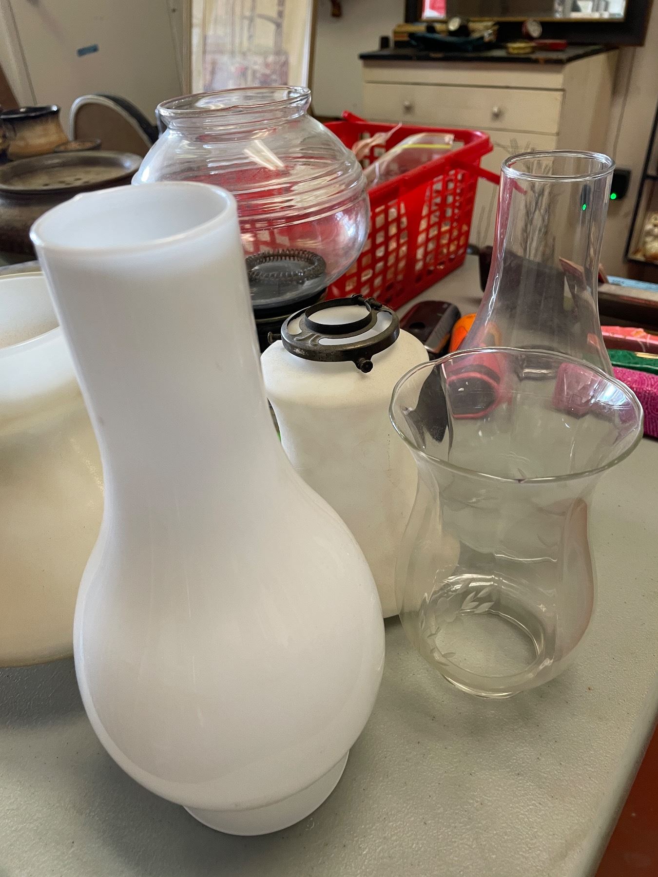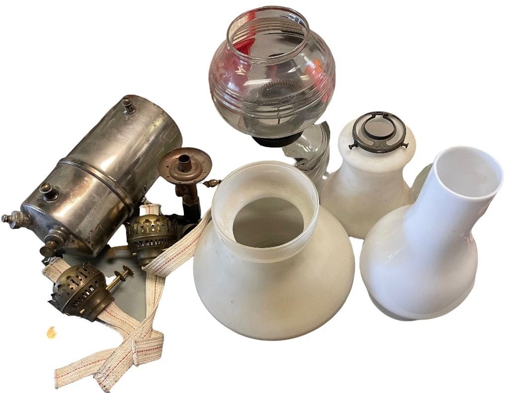 Group of Oil Lamp Parts - Metal Tank, Brass Burners & Assorted Glass Shades