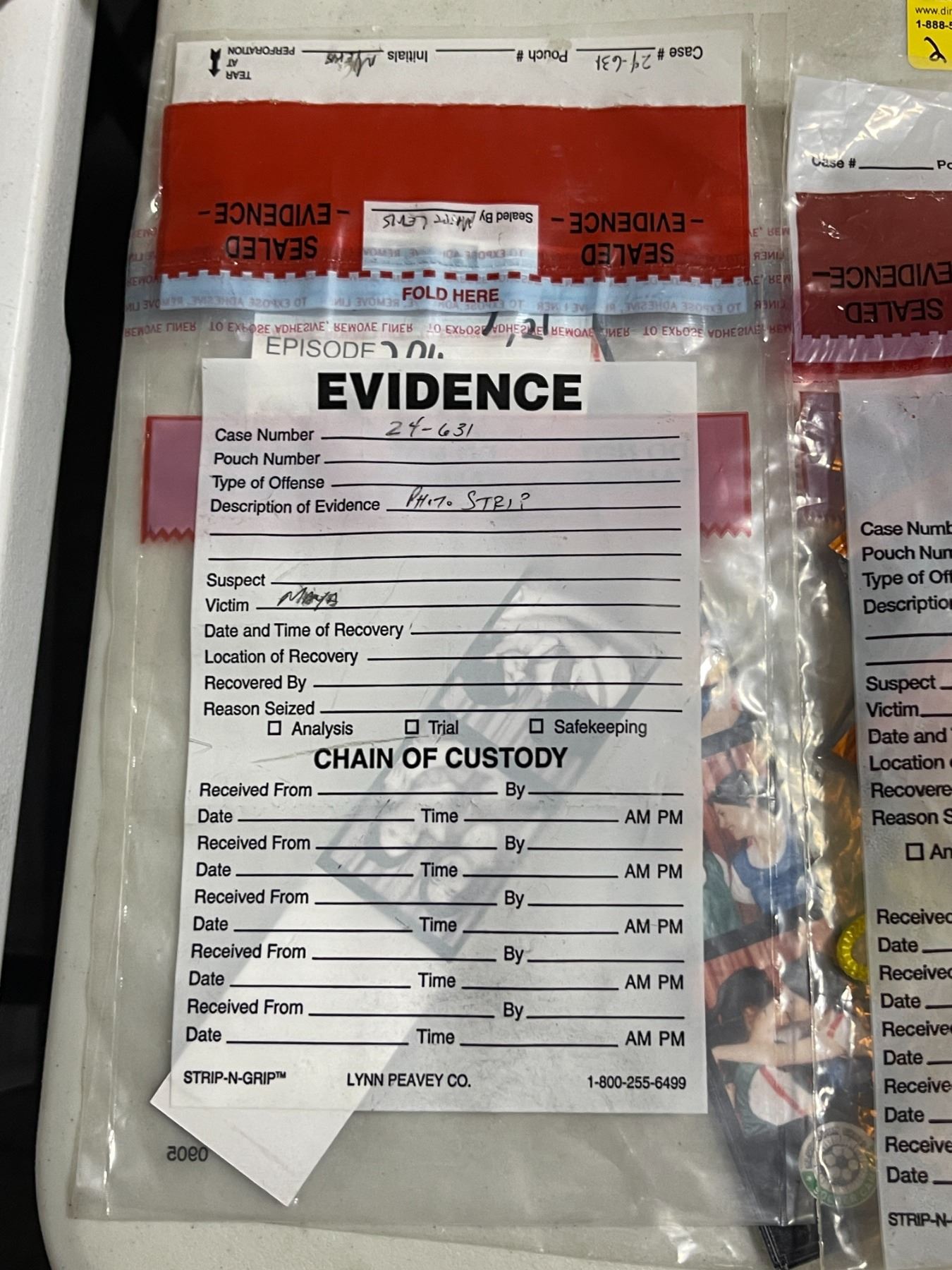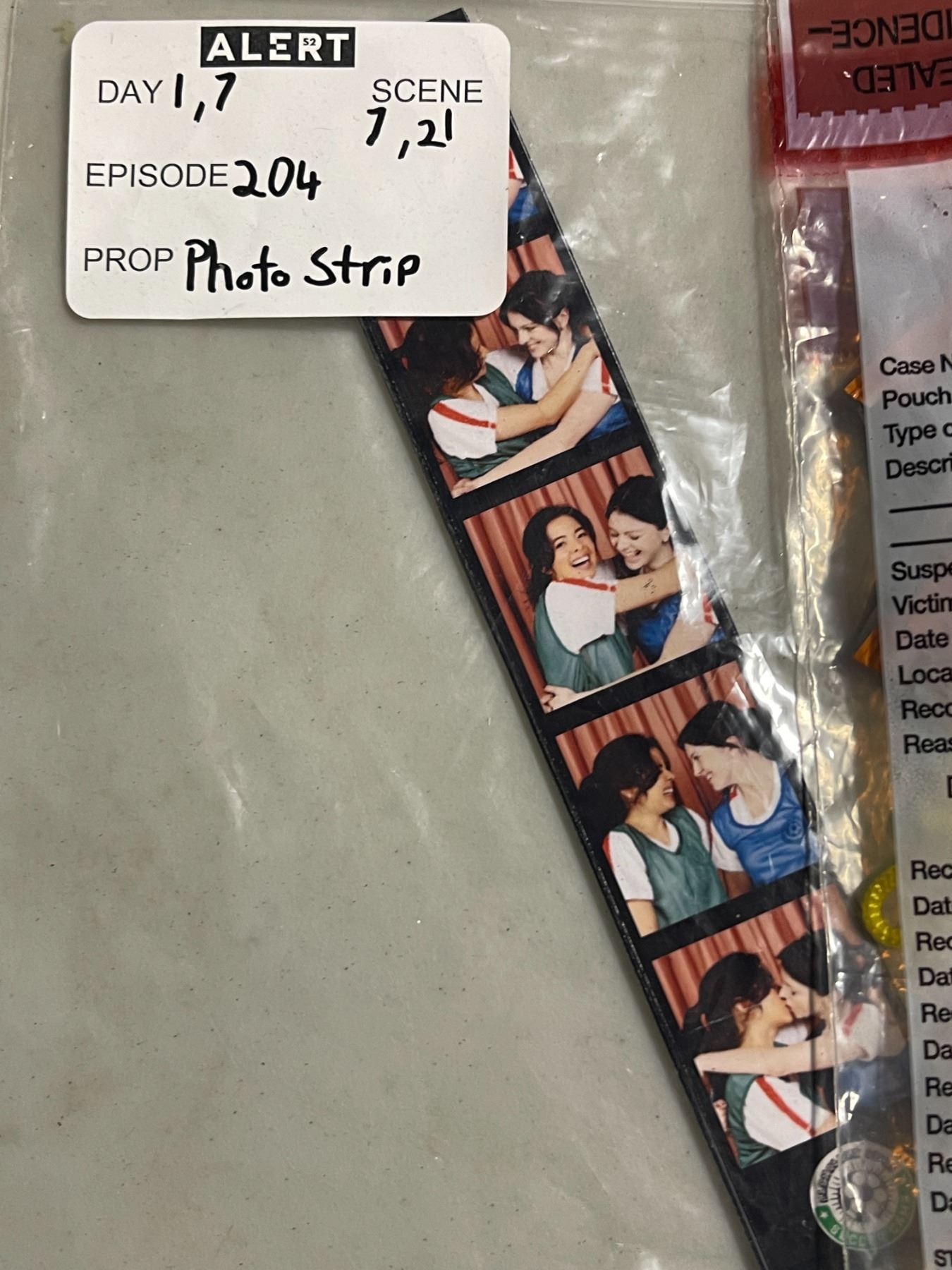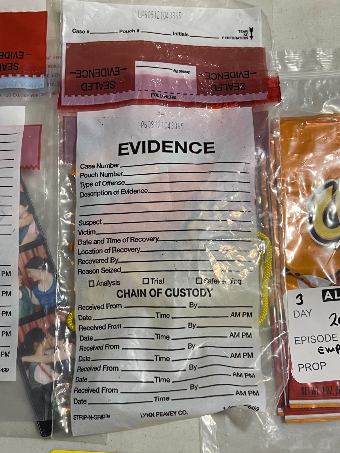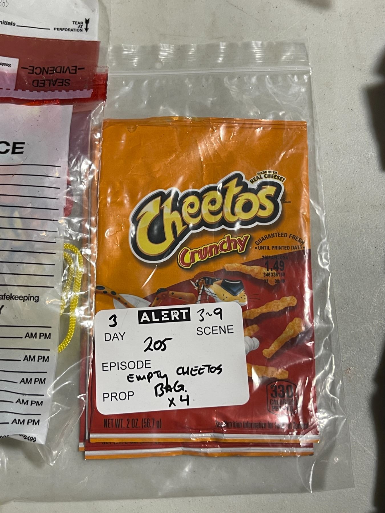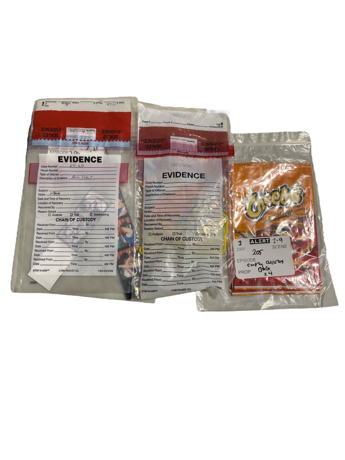 Group of Set Dec "Evidence" Cheeto Bags, Photo Strips, Etc.
