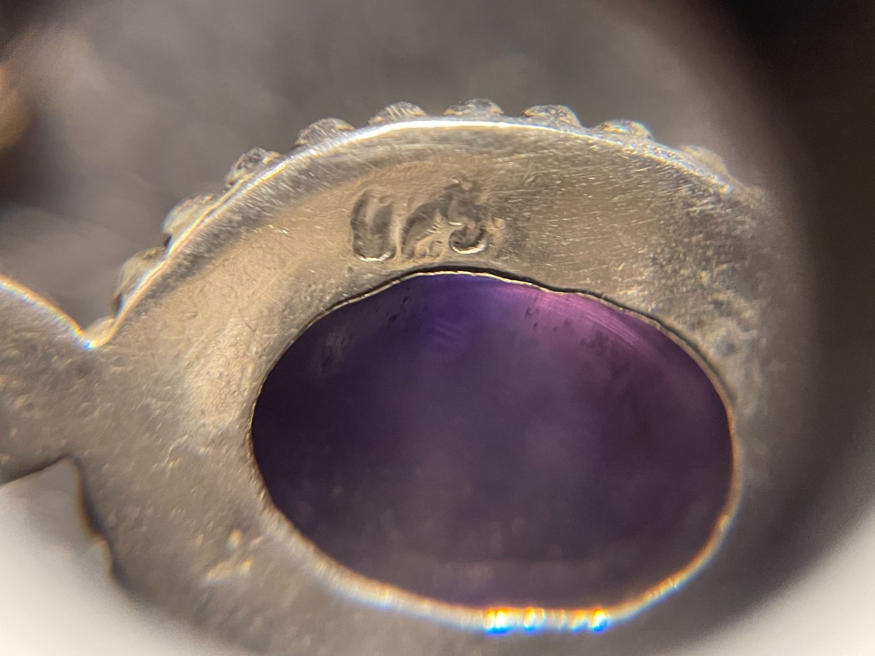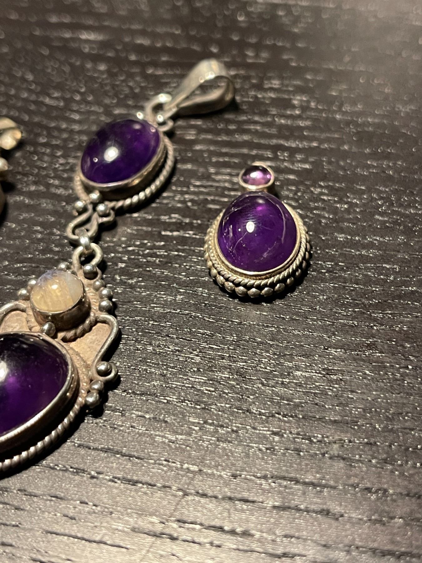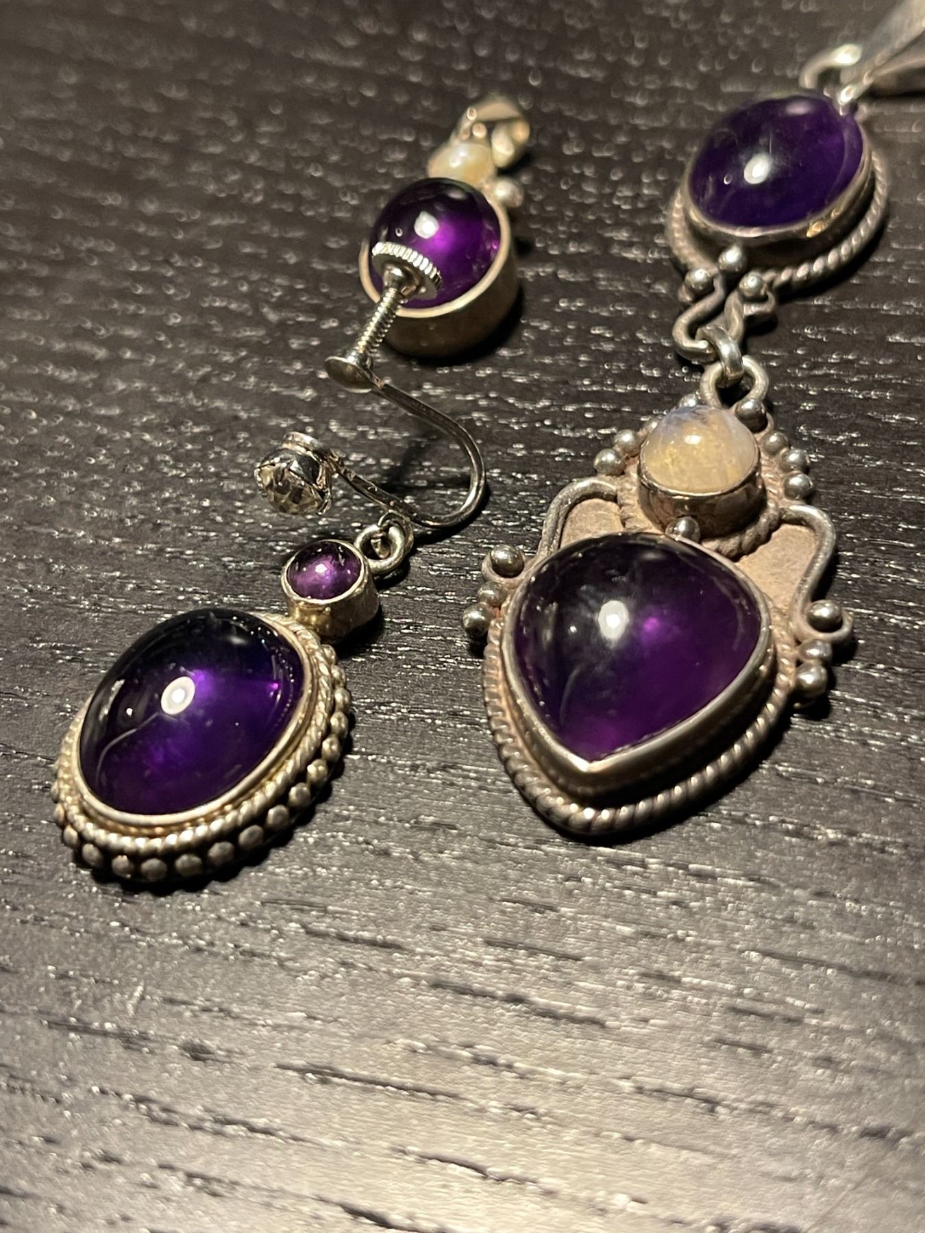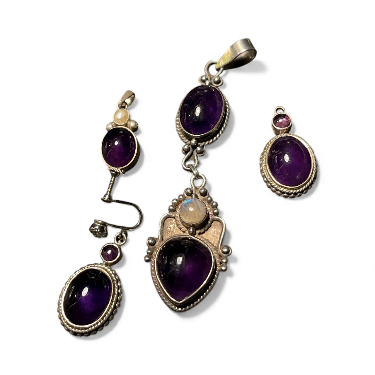 Group of Sterling Silver Amethyst Cabochon Jewelry - 3" drop pendant, 1" pendant and pair of earrings (one earring is missing the screw back)