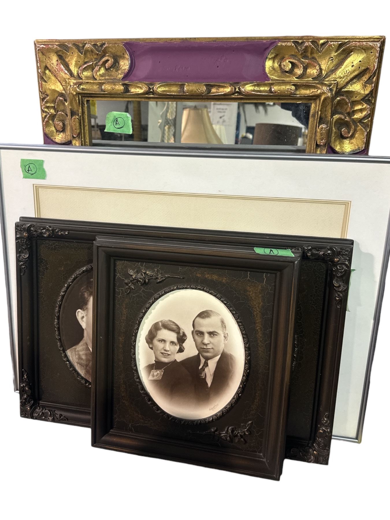 Group of Various Framed Pictures, Mirror, Vintage Photographs, Etc.