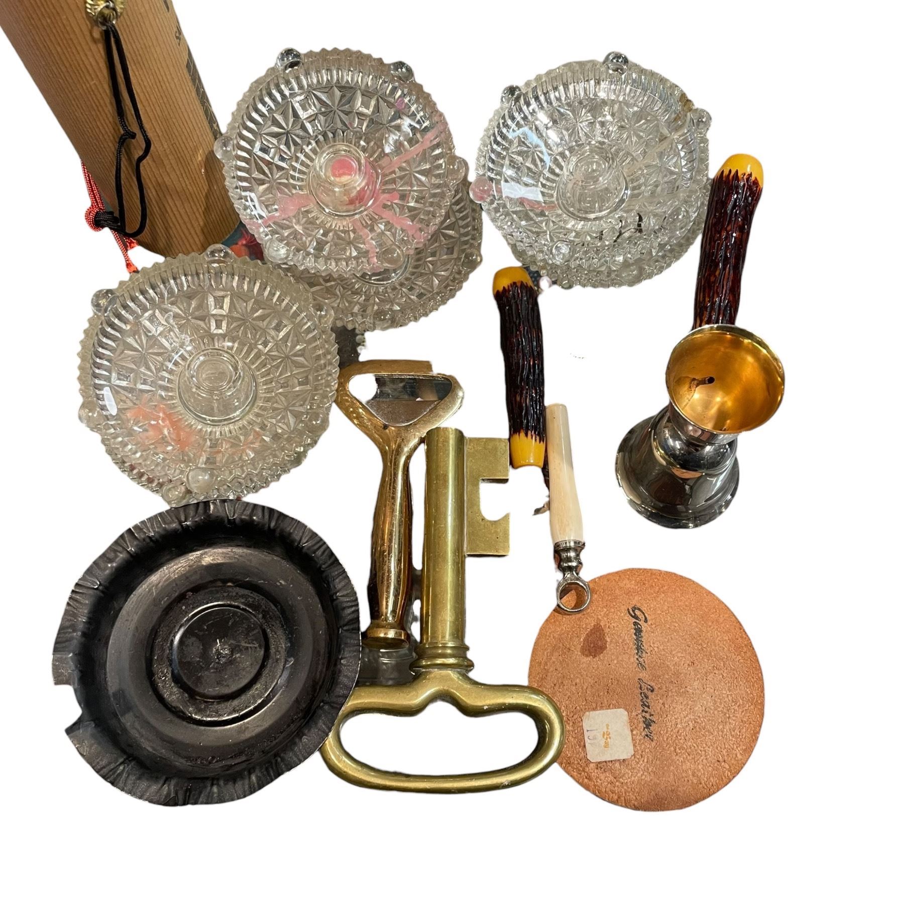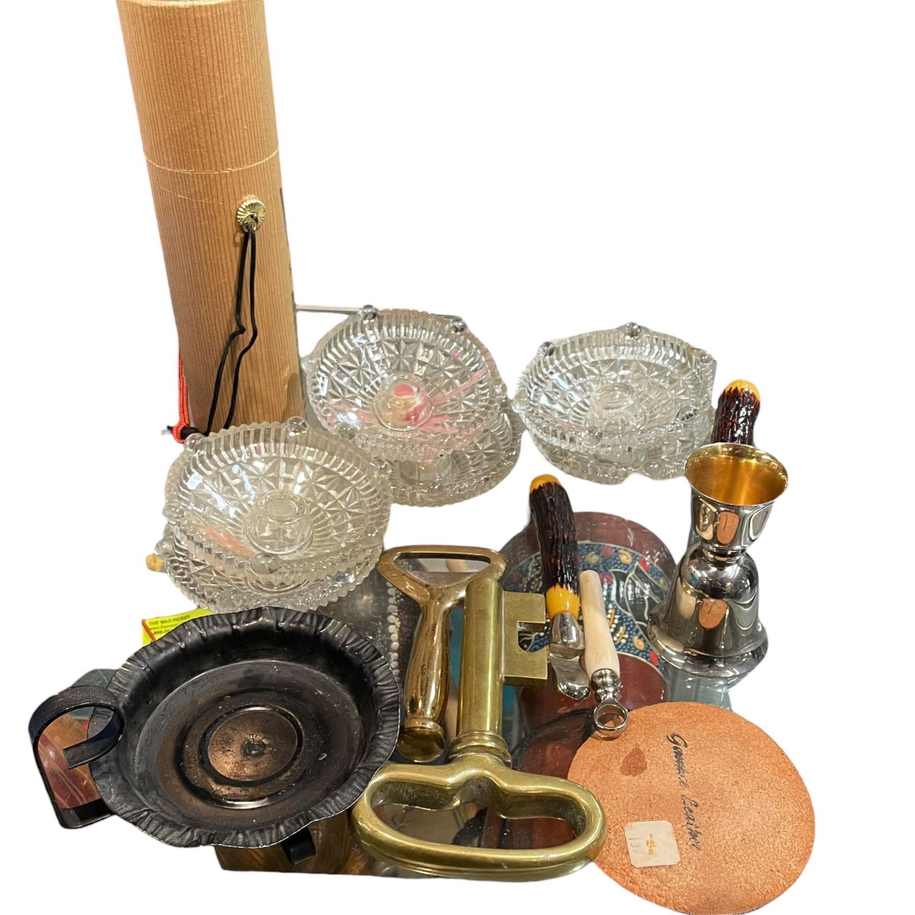 Group of Vintage Bar Ware, Glass Candle Hodlers and a Large Brass Key