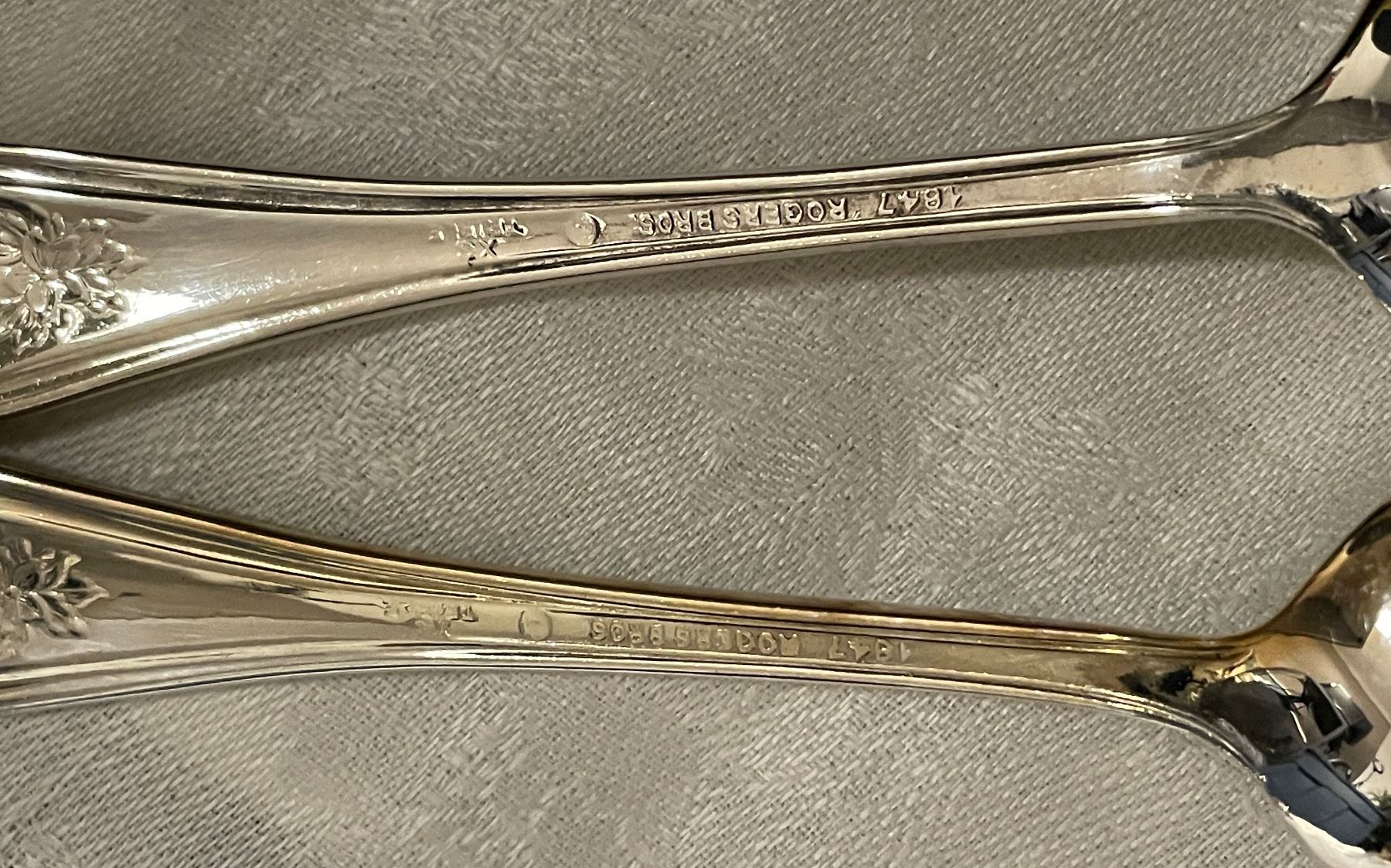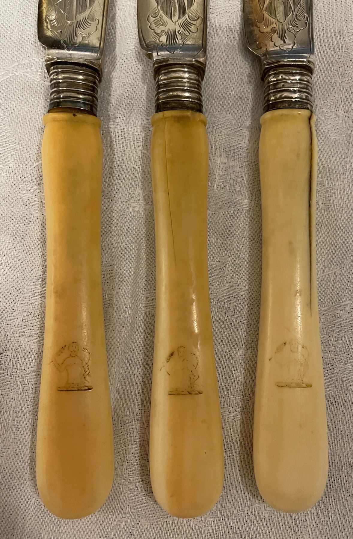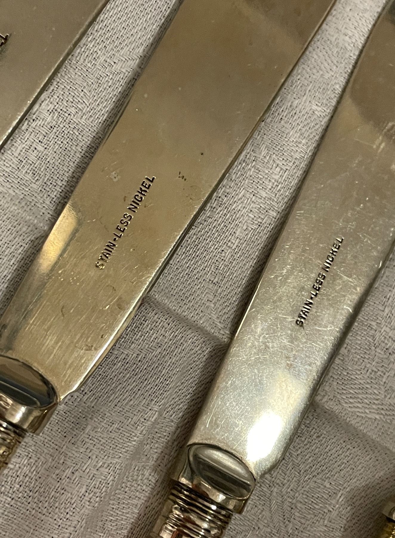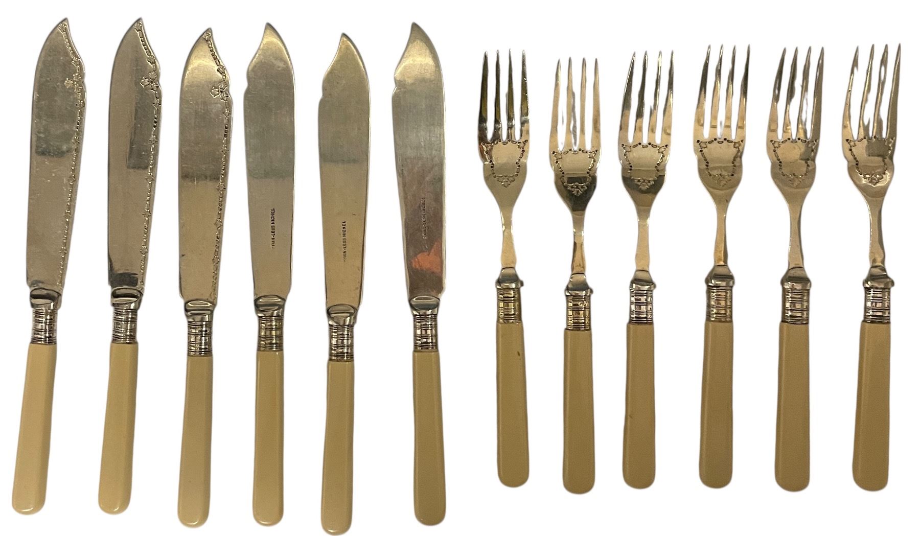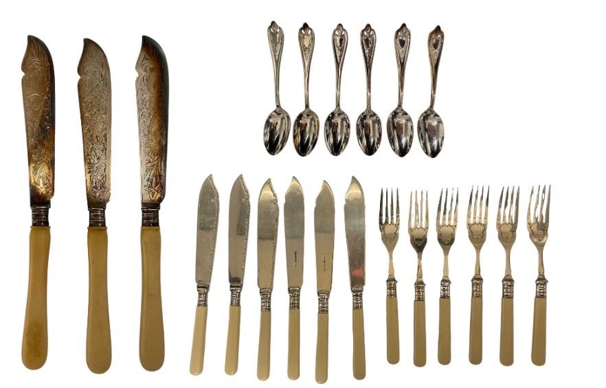Group of Vintage Silver Plated Flatware - 6 Faux Bone Handled Knives & Forks, 3 Large Knives & 6 Rogers Bros. Teaspoons